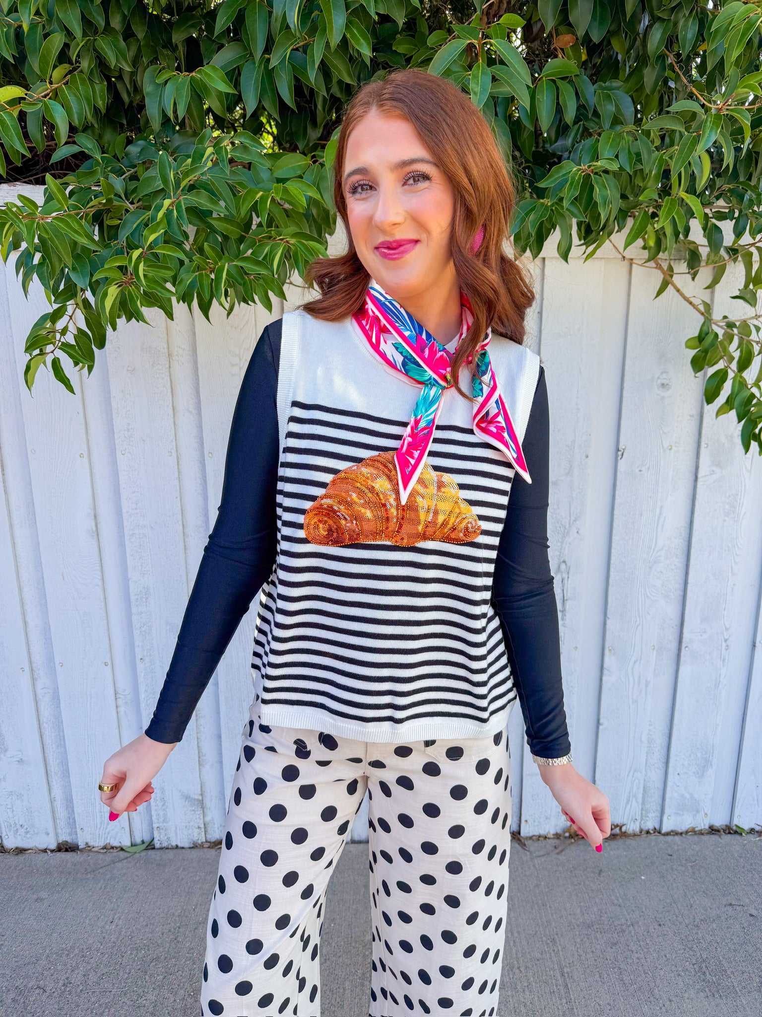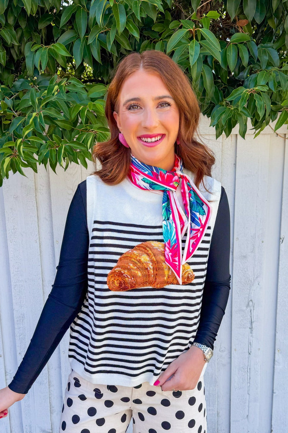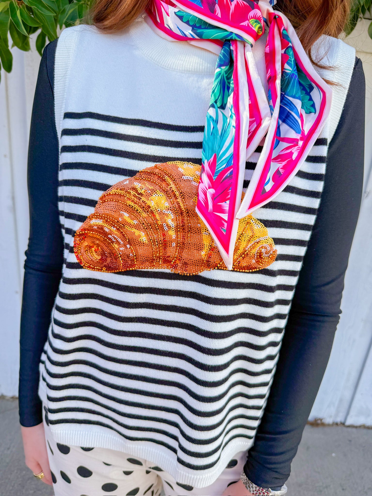 Stripes meet sparkle in this fun tank top featuring bold black and off-white stripes paired with a shimmering sequin croissant on the front.