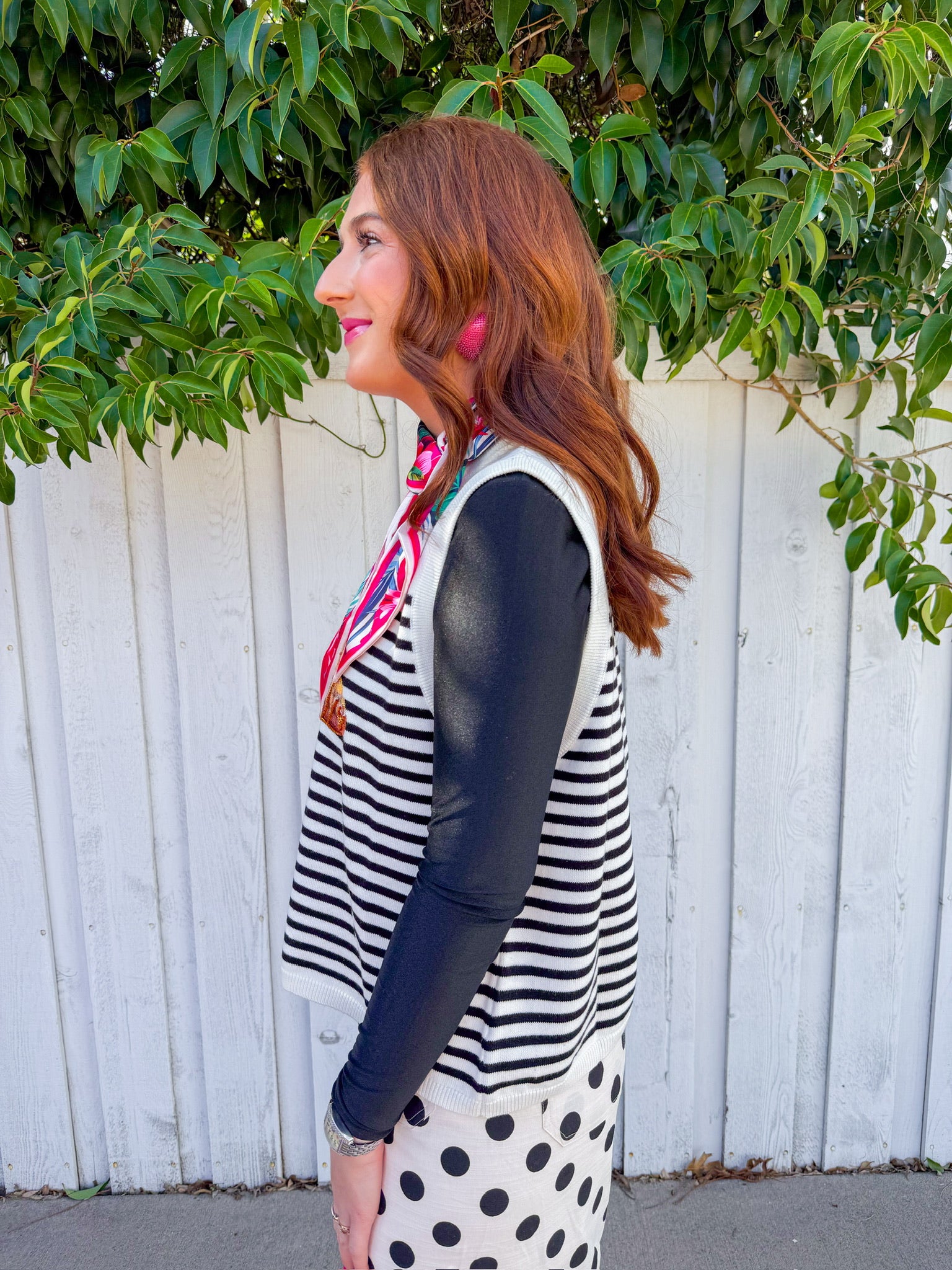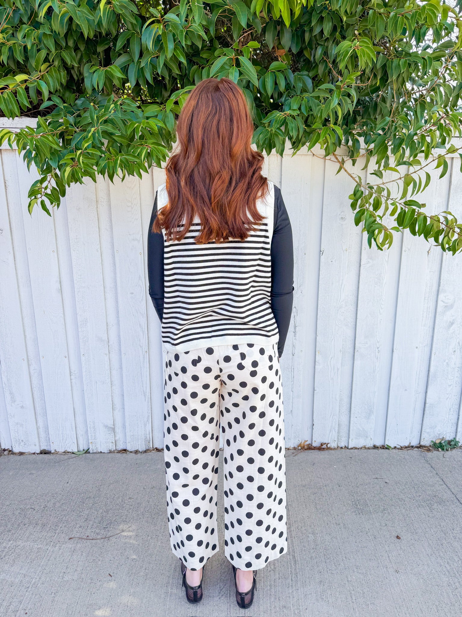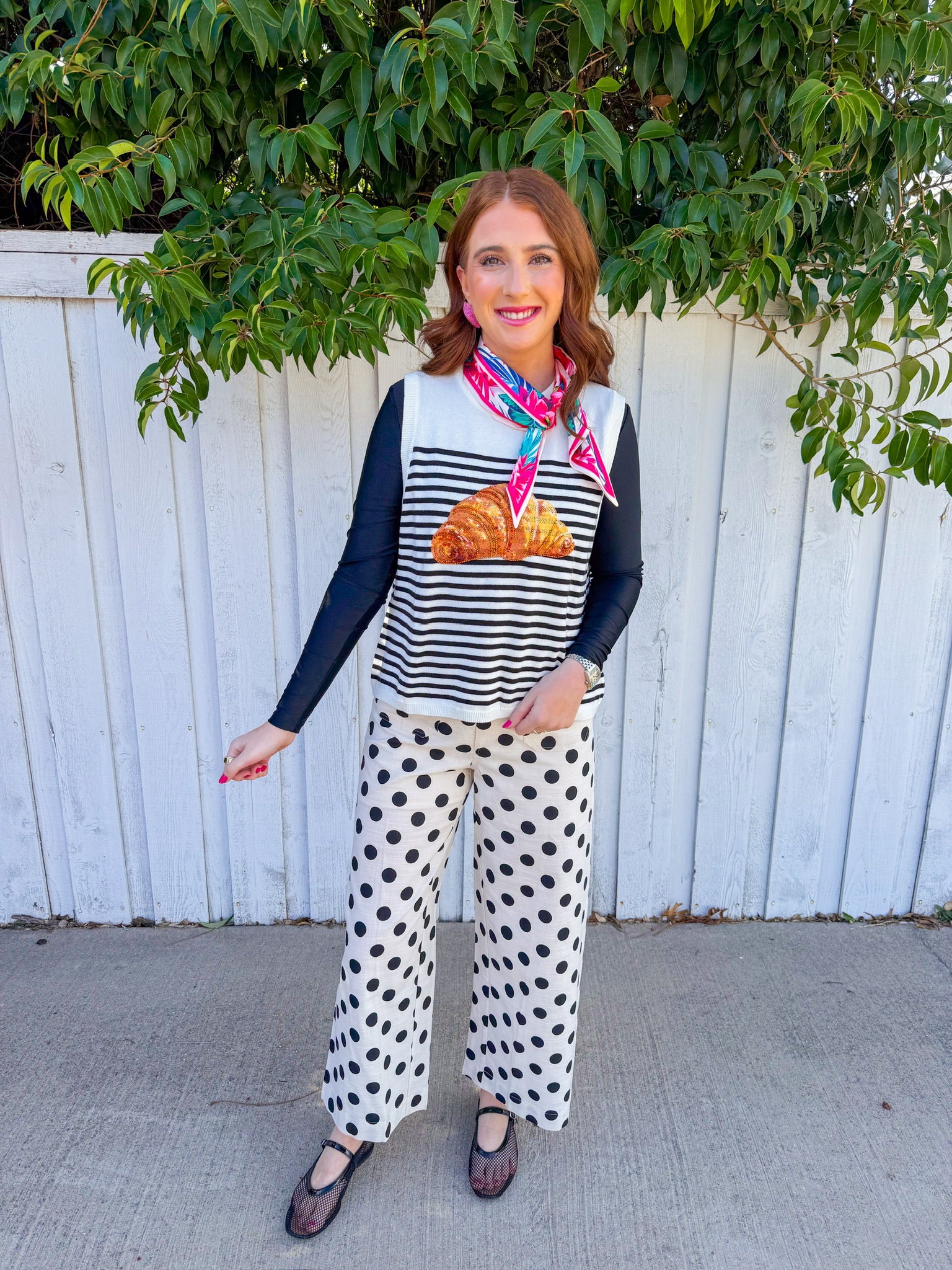 Stripes meet sparkle in this fun tank top featuring bold black and off-white stripes paired with a shimmering sequin croissant on the front.