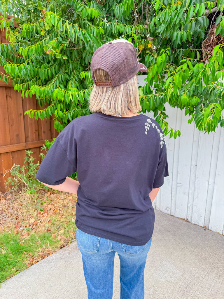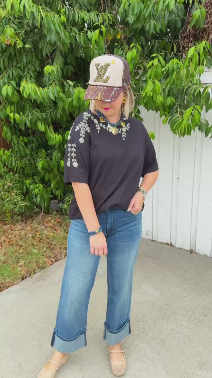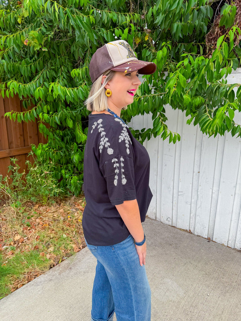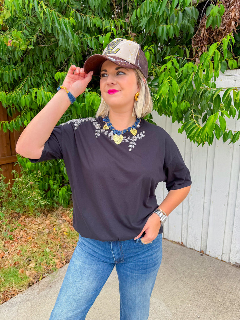 This Black Tee is anything but basic with its sparkling beaded floral detail draped across the neckline—just the right touch of glam to make jeans-and-a-tee feel instantly chic.