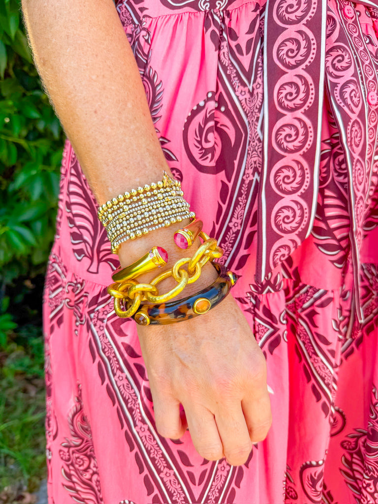 Hot-pink bandana-print midi with puff sleeves and a waist-cinching tie—bright, breezy, and ready for brunch or a garden party. Pair with tan loafers and layered bangles now, then swap to strappy sandals for date night