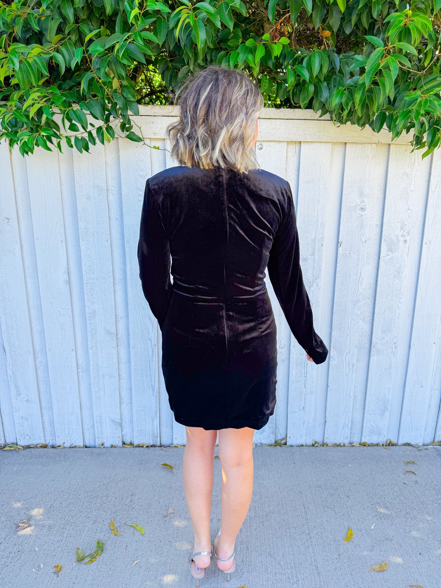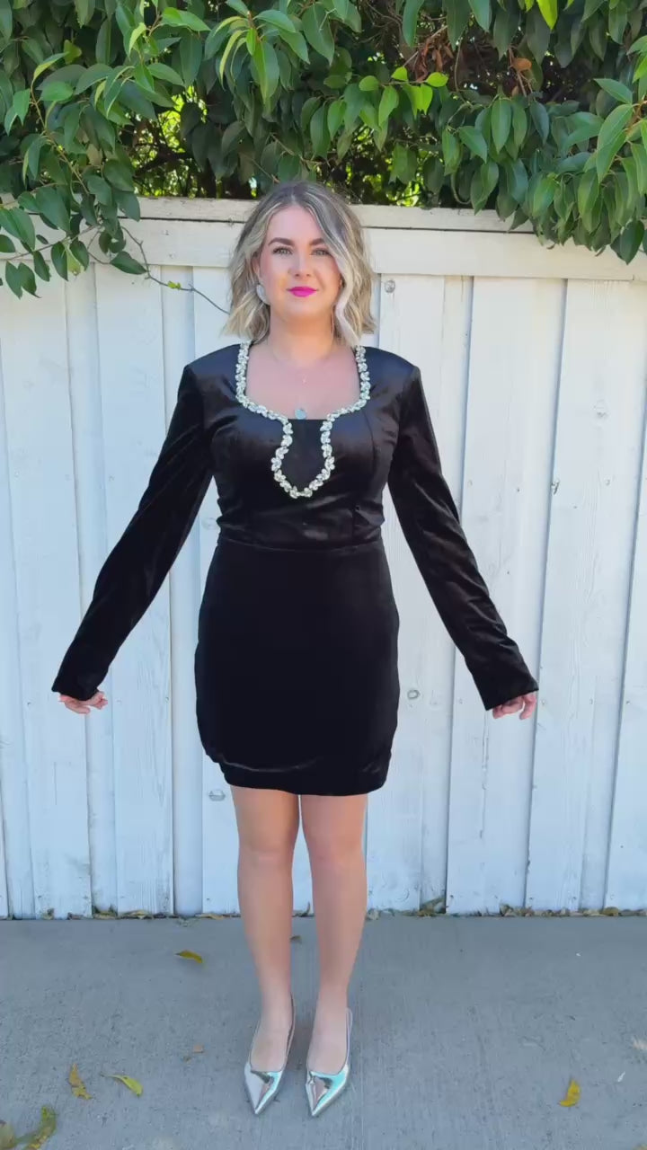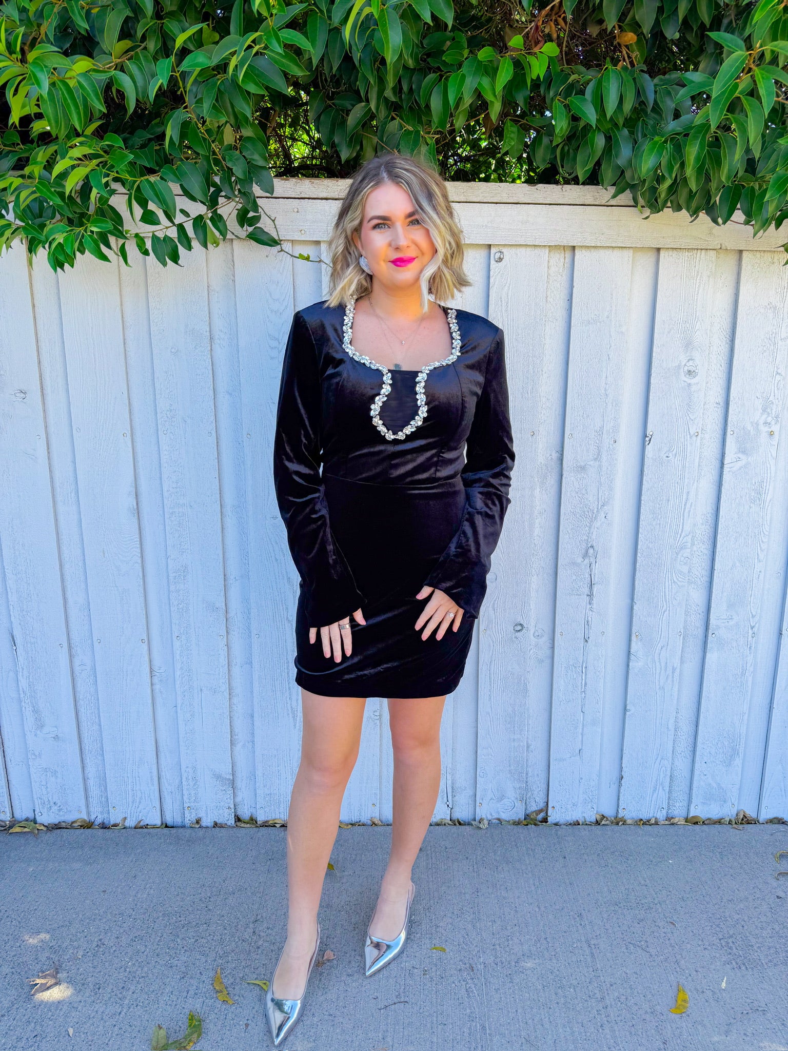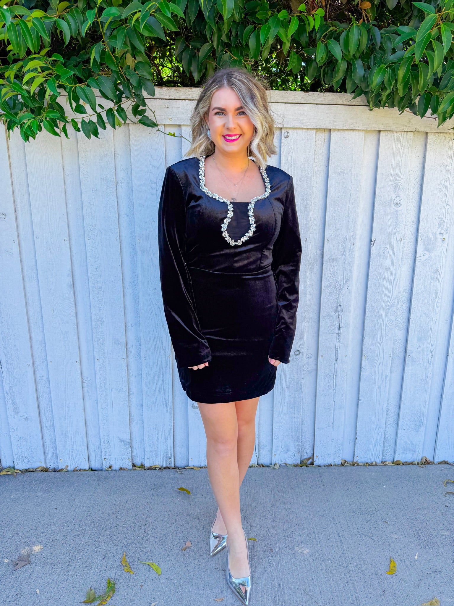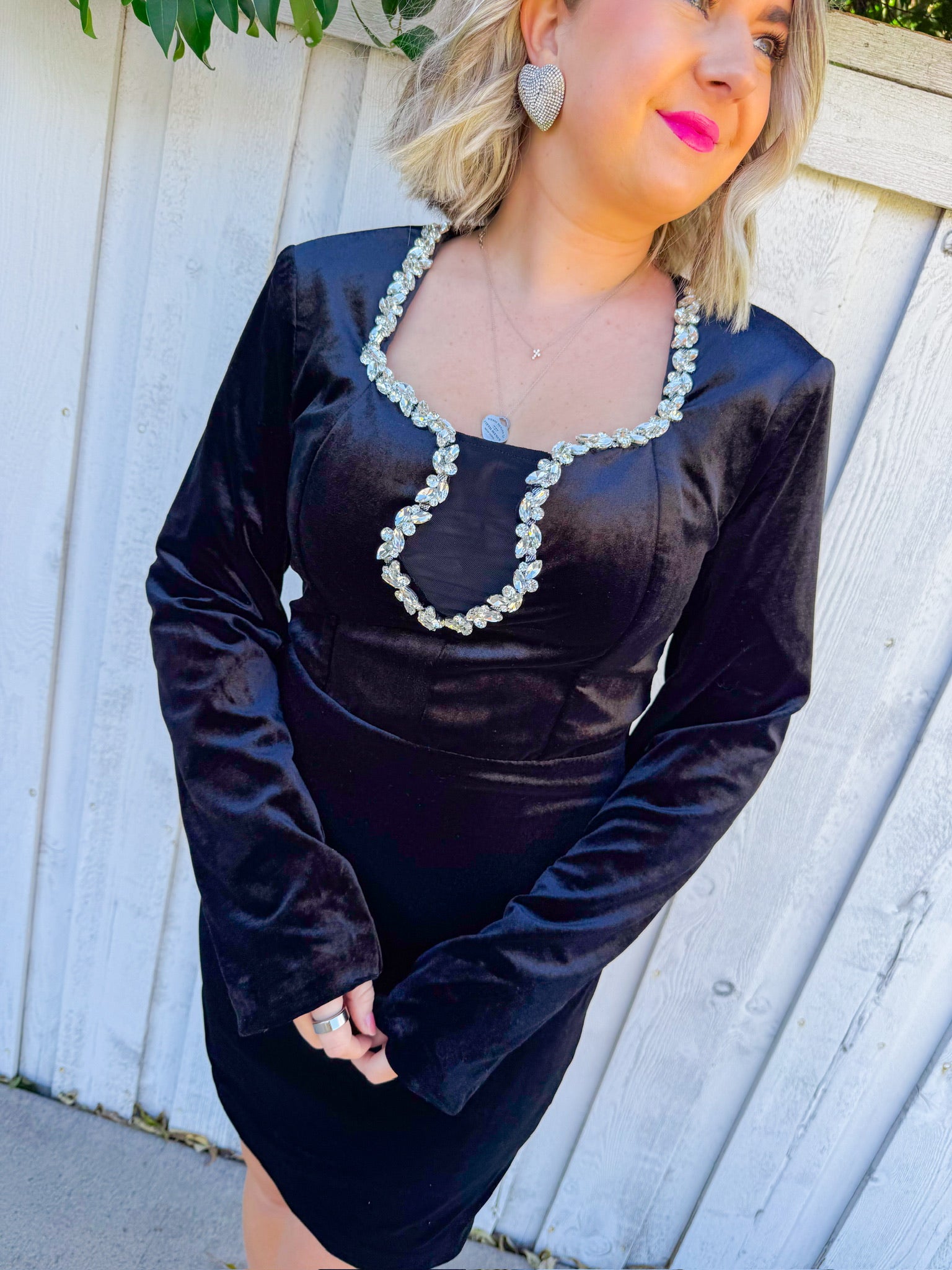 Slip into the spotlight in this sultry black velvet mini dress, where luxe fabric meets eye-catching sparkle.