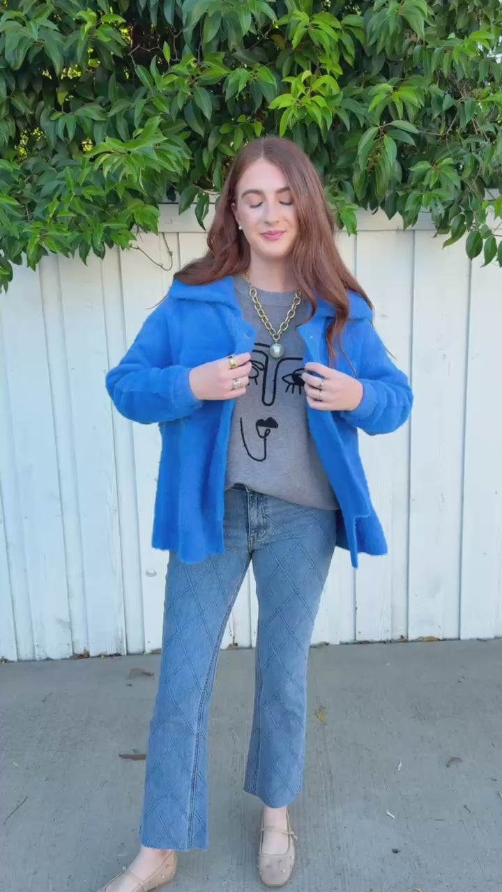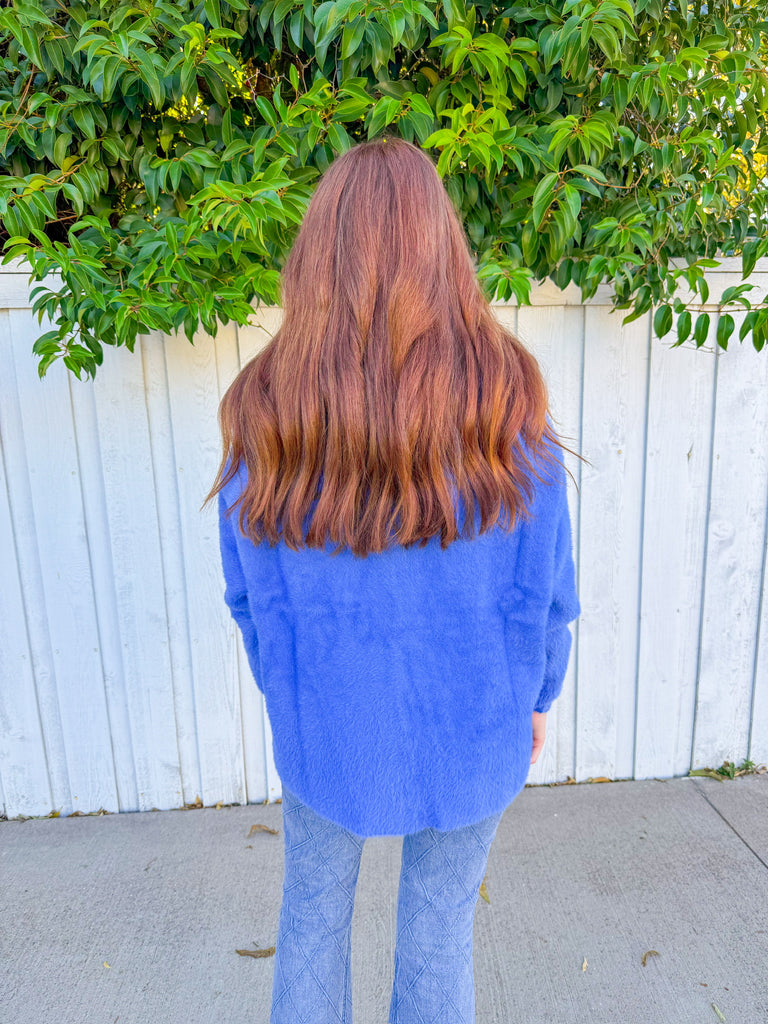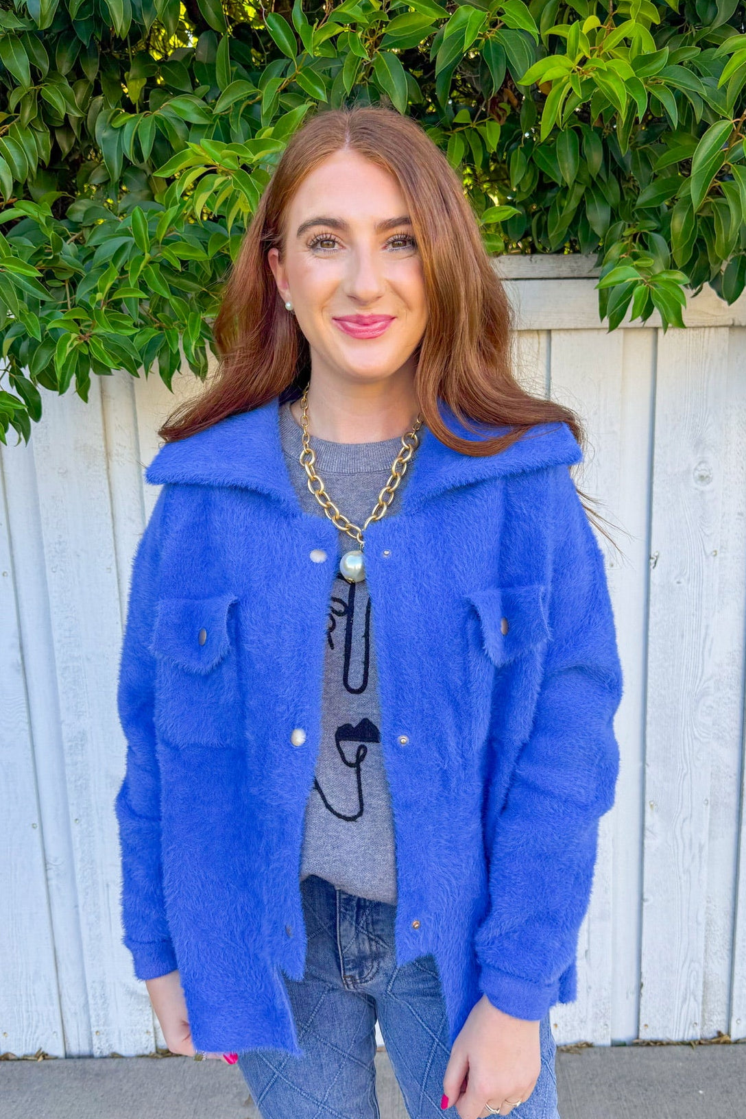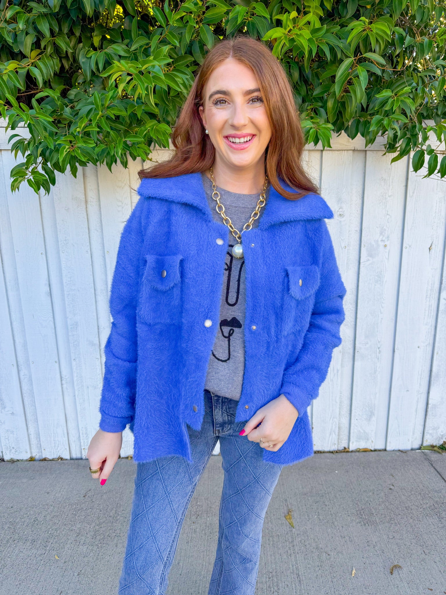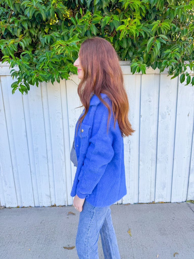 Wrap yourself in cozy comfort with this electric royal blue fuzzy jacket—the perfect layering piece for crisp autumn and winter days. Soft to the touch and effortlessly stylish, it features a classic button closure that makes getting ready a breeze.