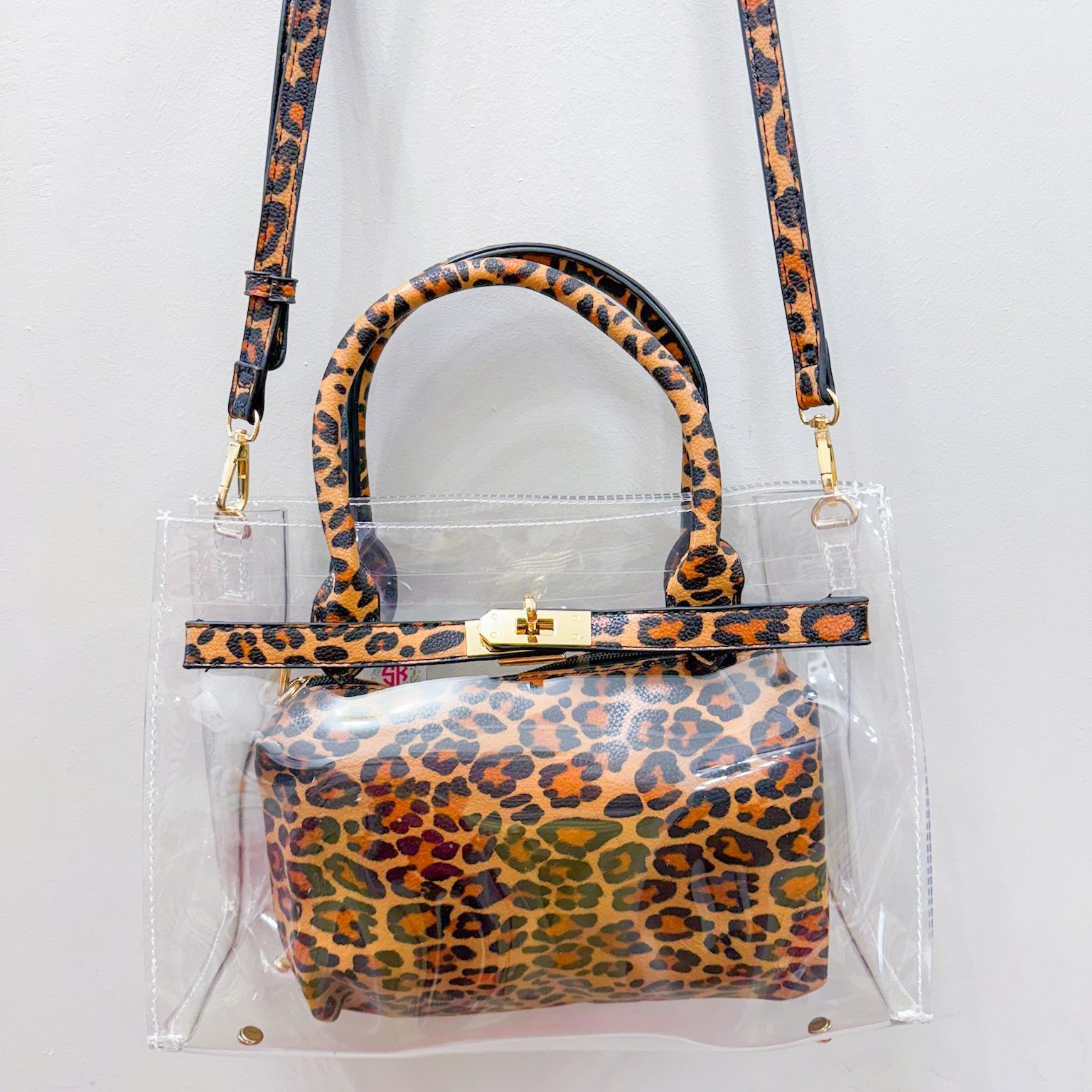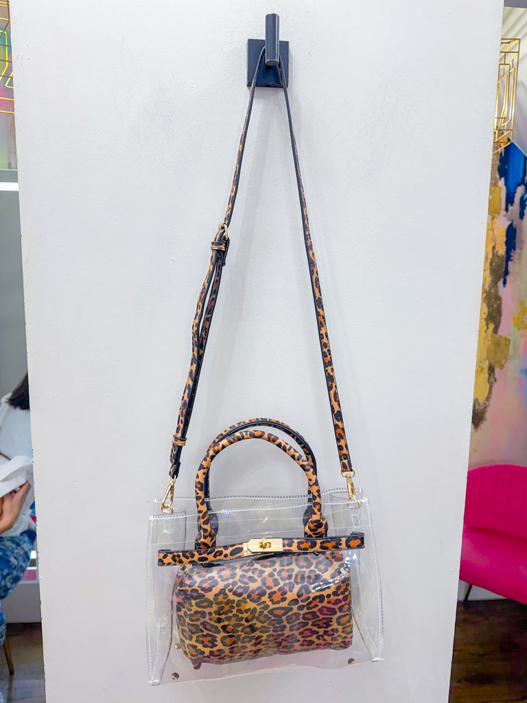 Show off your style with the Eileen Clear Handbag in playful cheetah print. This transparent bag keeps your essentials visible and easy to find while adding a fun, wild twist to any outfit. Lightweight and stylish, it’s perfect for those who love a blend of practicality and personality.