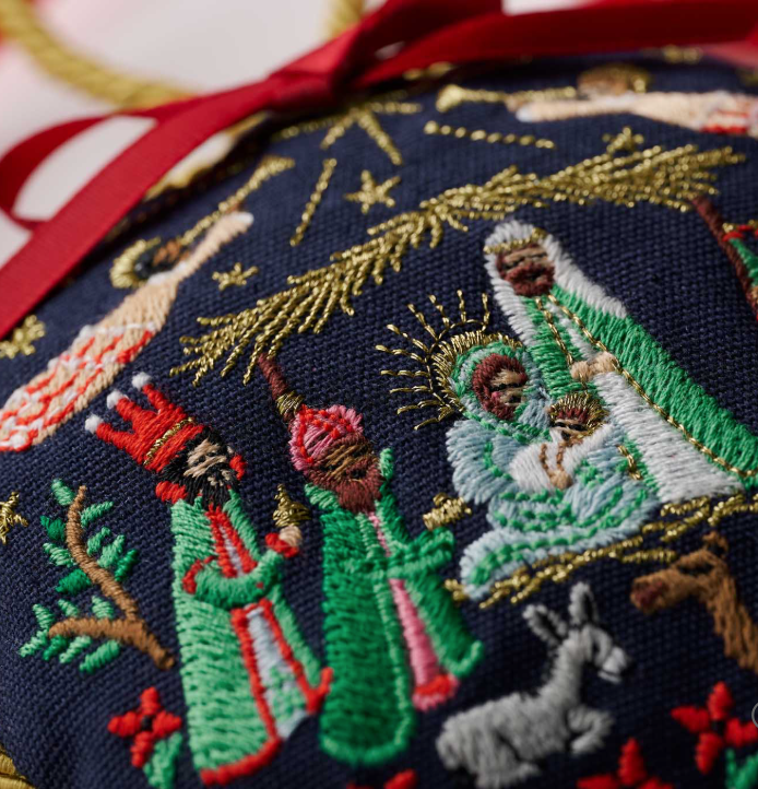 A keepsake gift or heirloom accent for your own tree, this ornament features embroidered illustrations, gold thread detailing, twisted piping, and a loop for hanging.