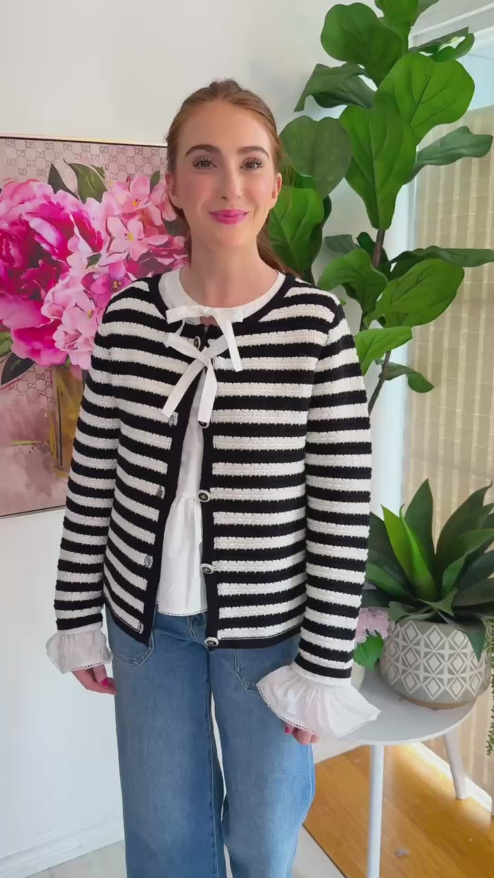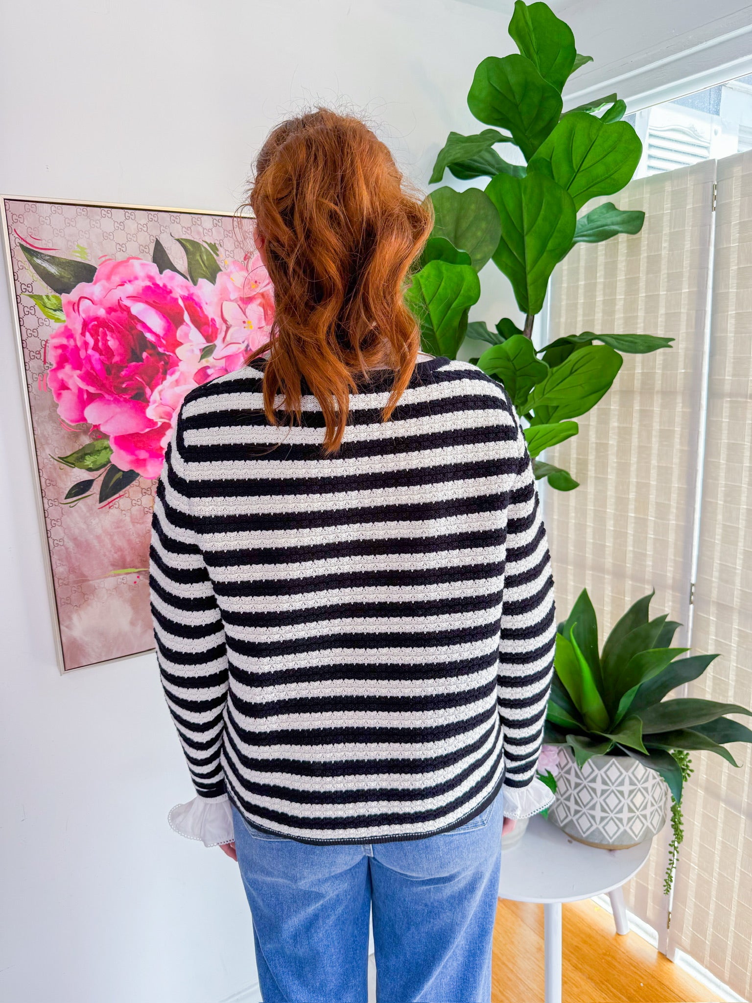 With bold black and white stripes that scream timeless style, this cardigan is all about making a statement. Crafted from a beautiful crochet fabric, it’s the ultimate layering piece that brings effortless flair to anything in your wardrobe. The button-down front adds a touch of sophistication, while still keeping things relaxed and easy to wear. Pair it with your favorite basics for an elevated look, or throw it over something more adventurous for a pop of class.