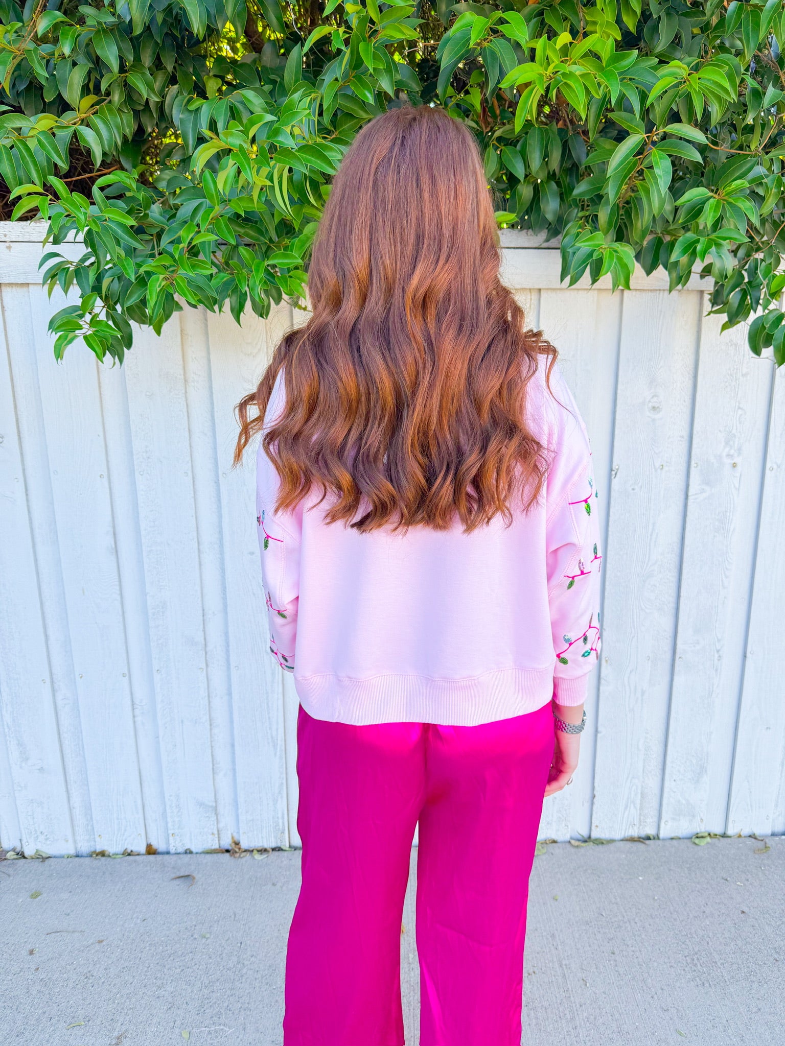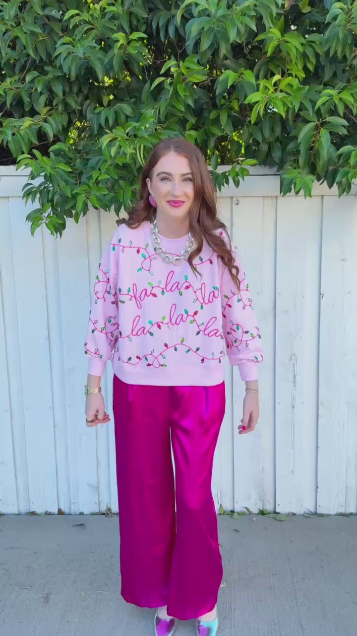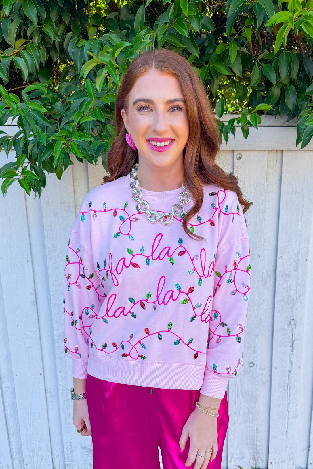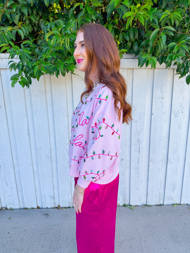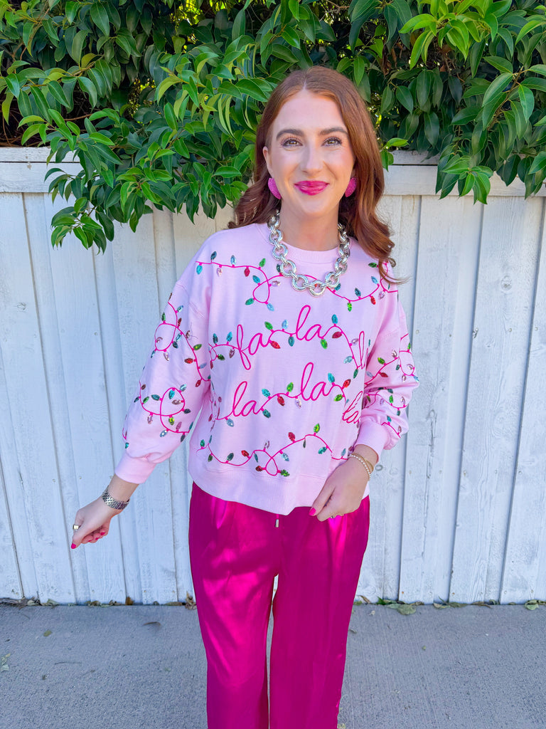 Sing your way through the season in this bubblegum pink sweatshirt adorned with "Fa La La" in vibrant multicolor text across the chest.