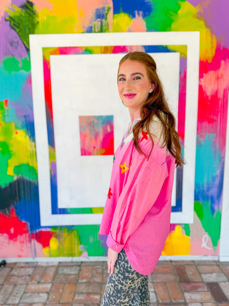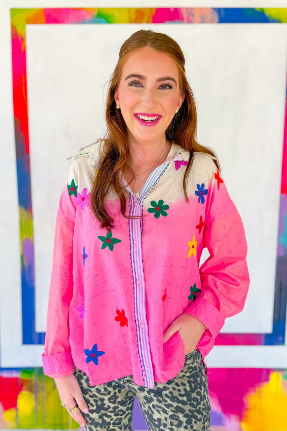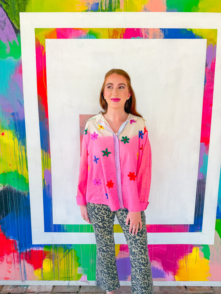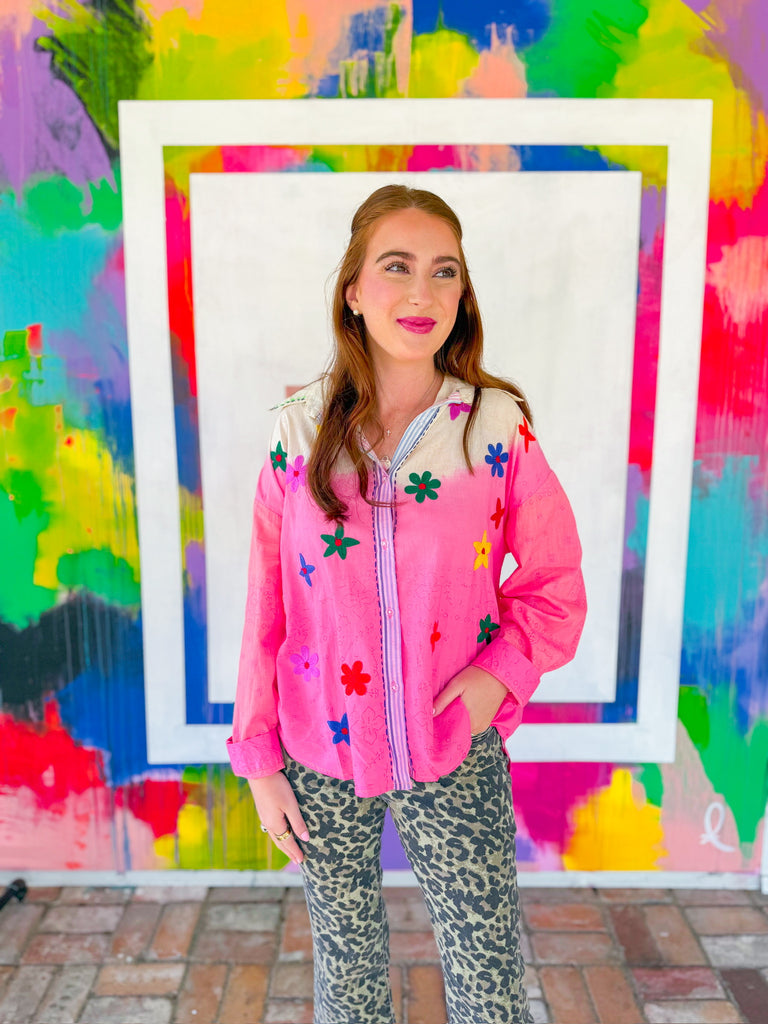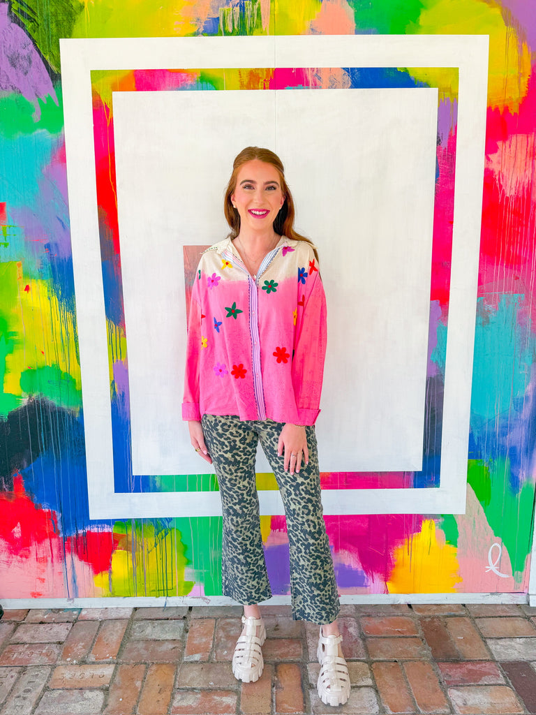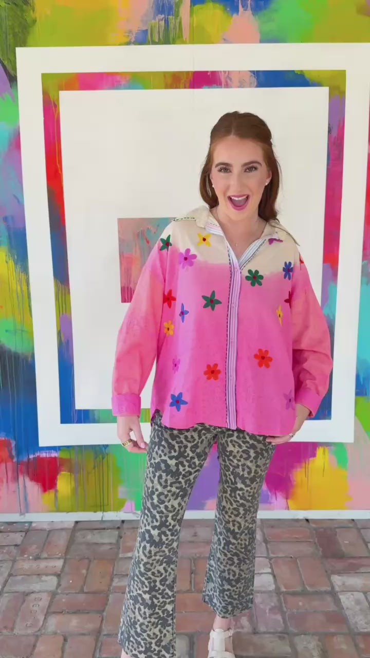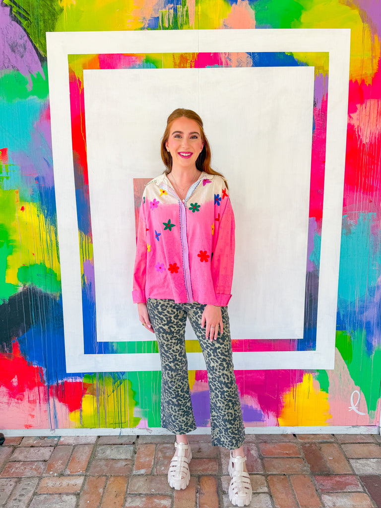 Covered in colorful embroidered blooms with striped trim and playful stitching at the collar and cuffs, it’s the perfect mix of quirky and cute