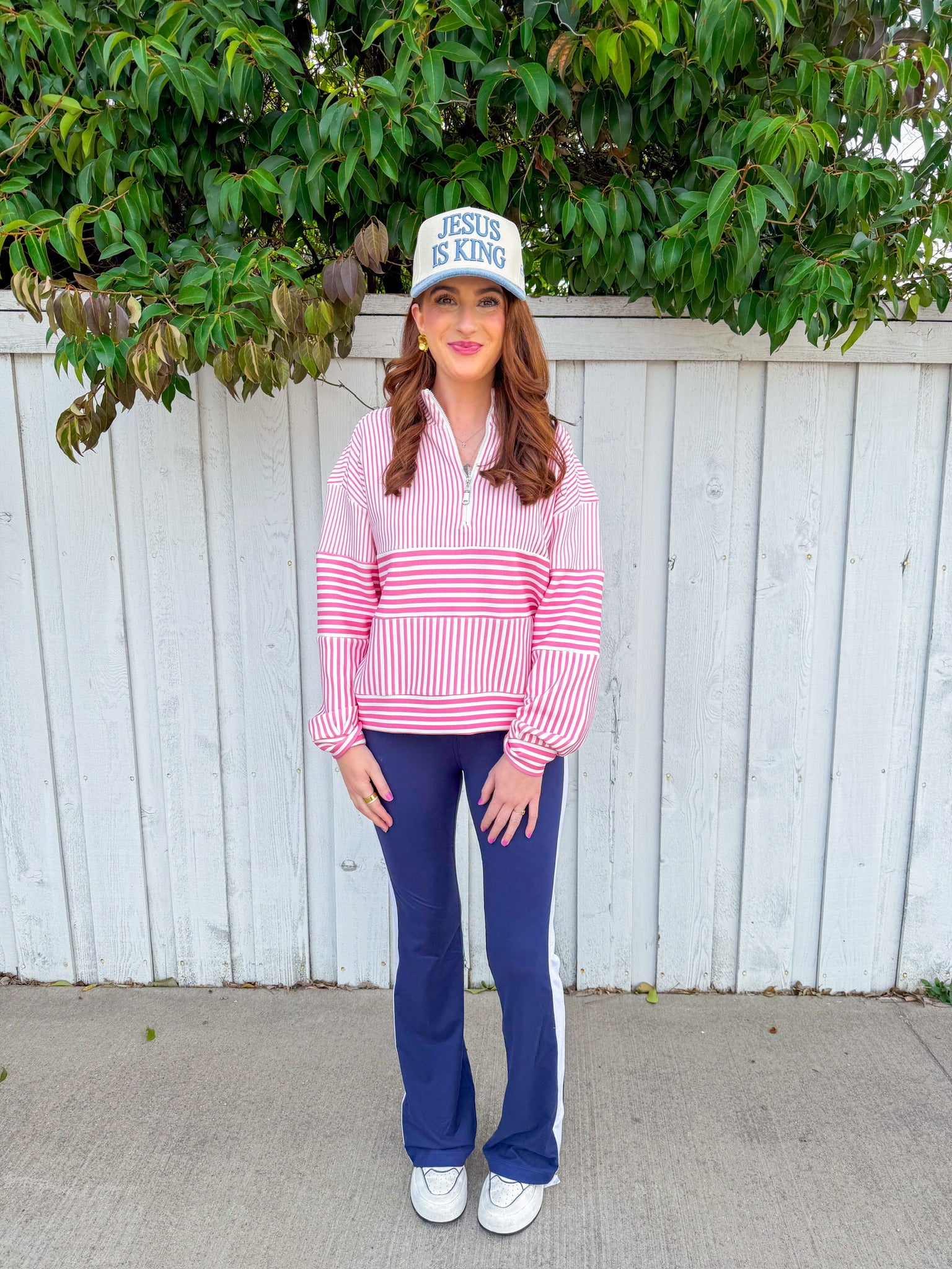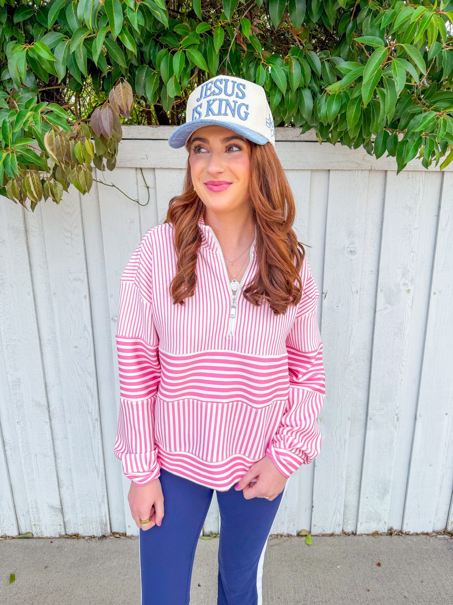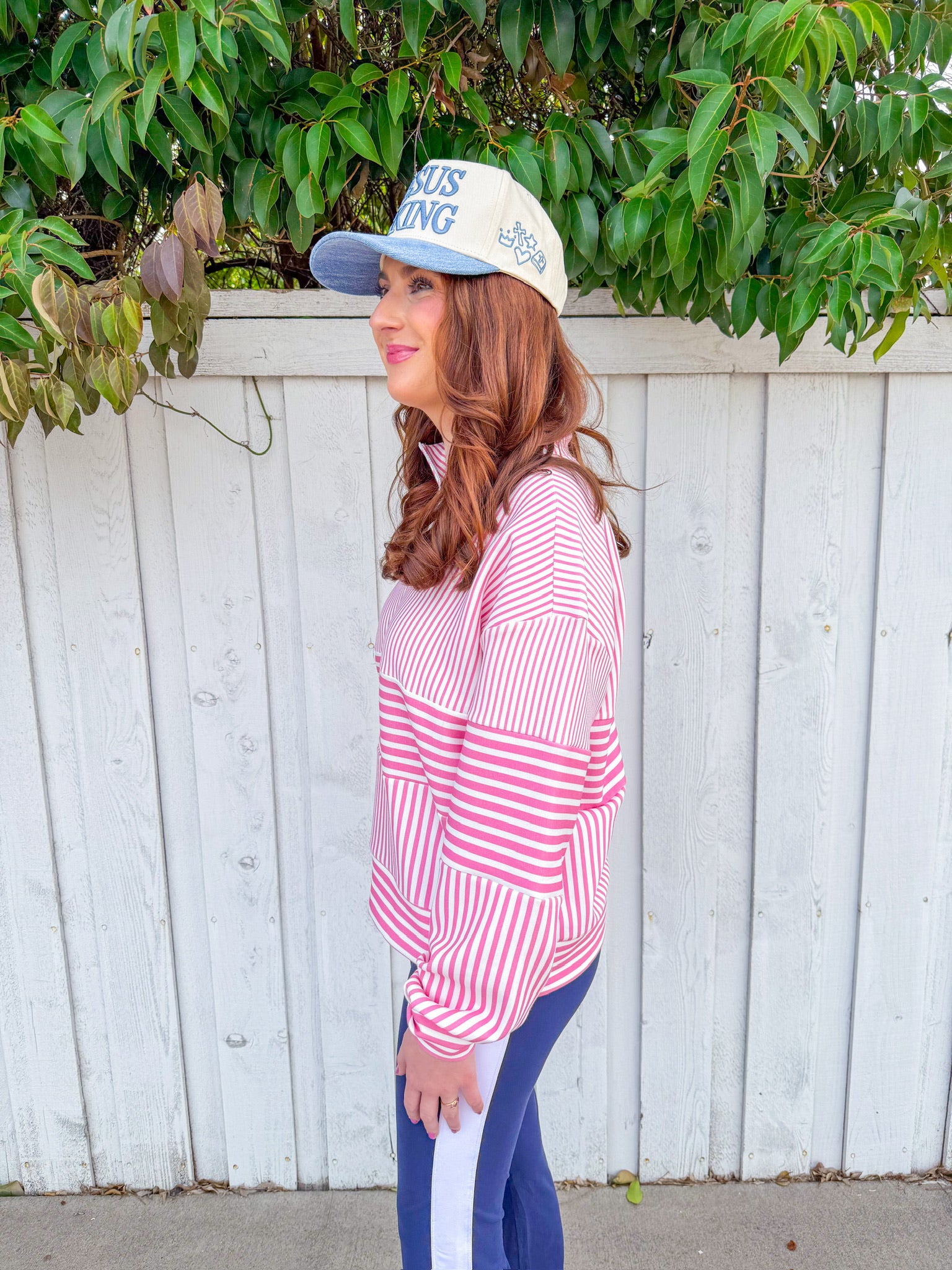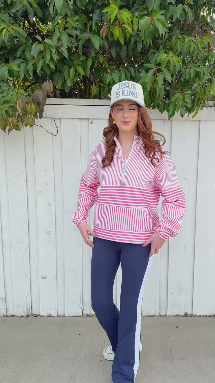 The pink and white stripes keep things fresh and fun, while the relaxed fit makes it perfect for errands, casual hangouts, or those days when comfort is non-negotiable. Quarter zip design means easy layering without the commitment of a full pullover.