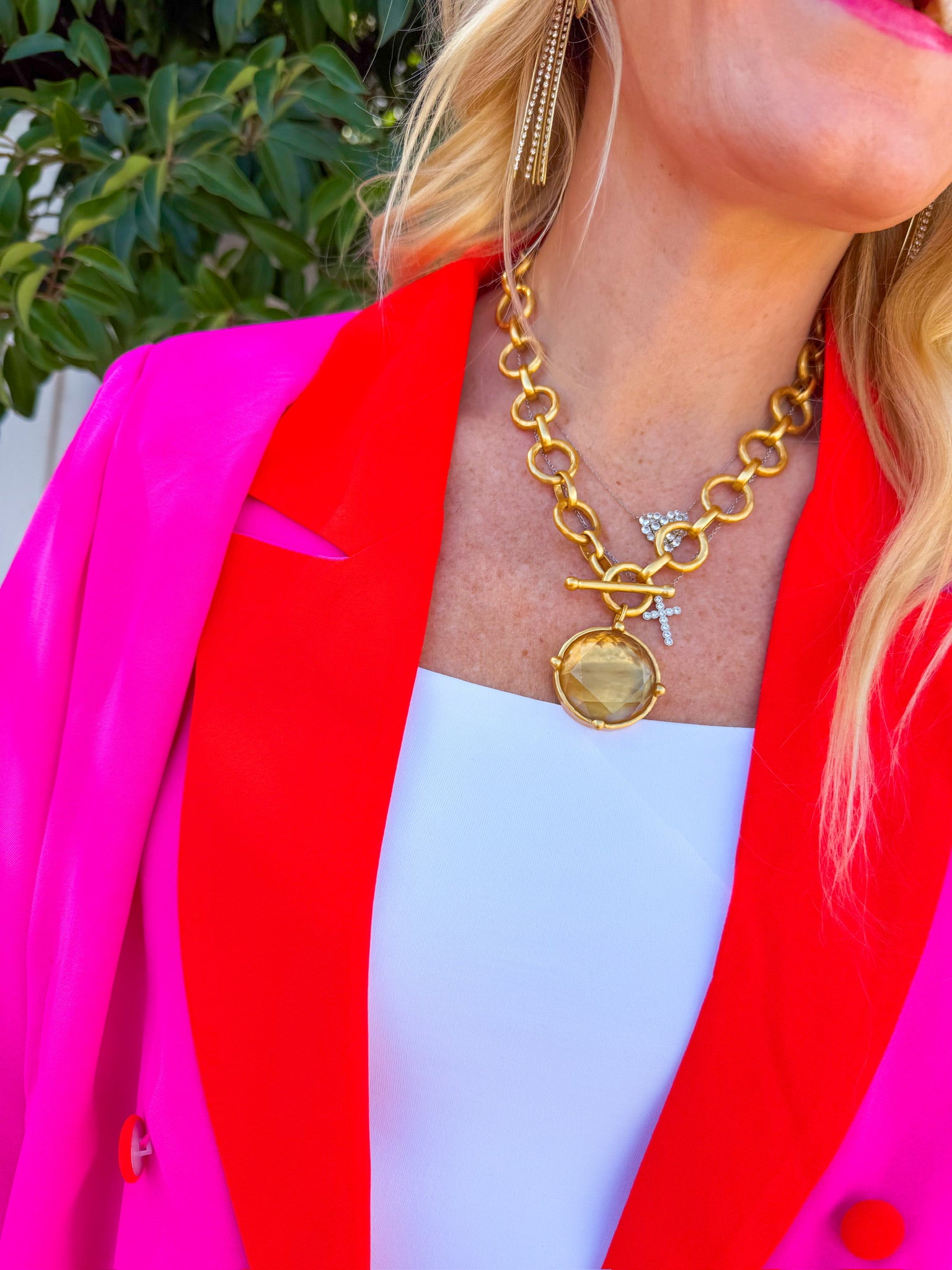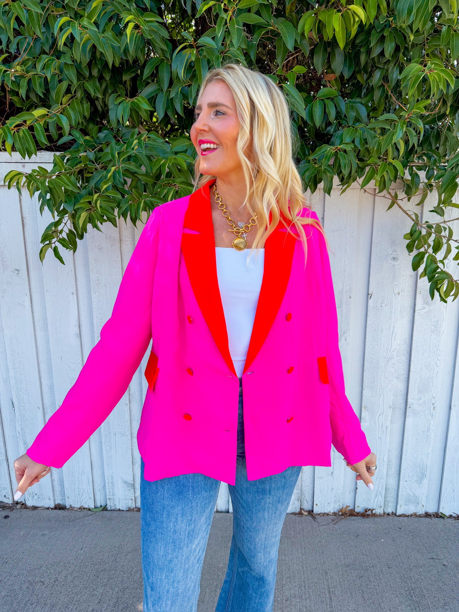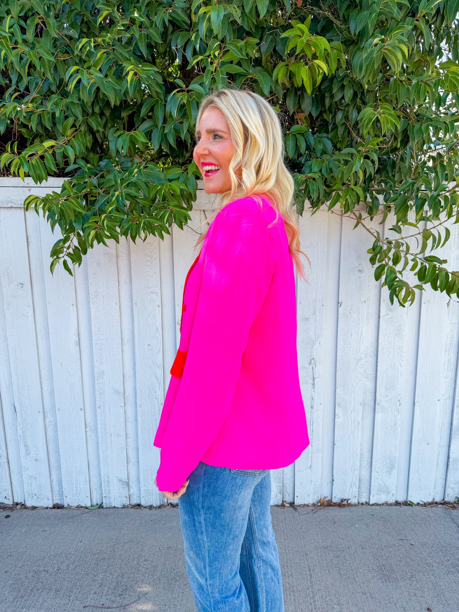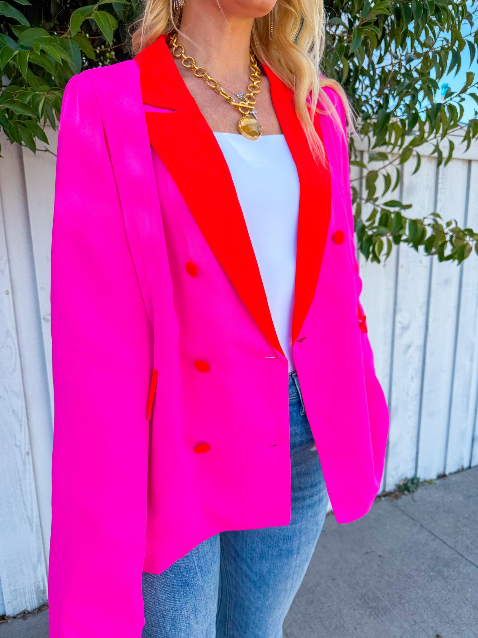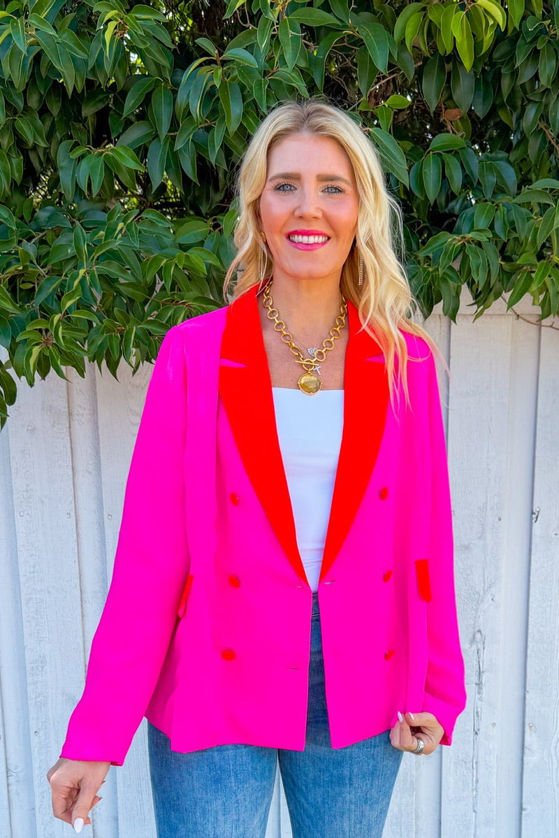 Make a bold statement with the Firecracker Blazer in vibrant fuchsia. This eye-catching layer features striking coral trim detailing that adds an extra pop of personality.