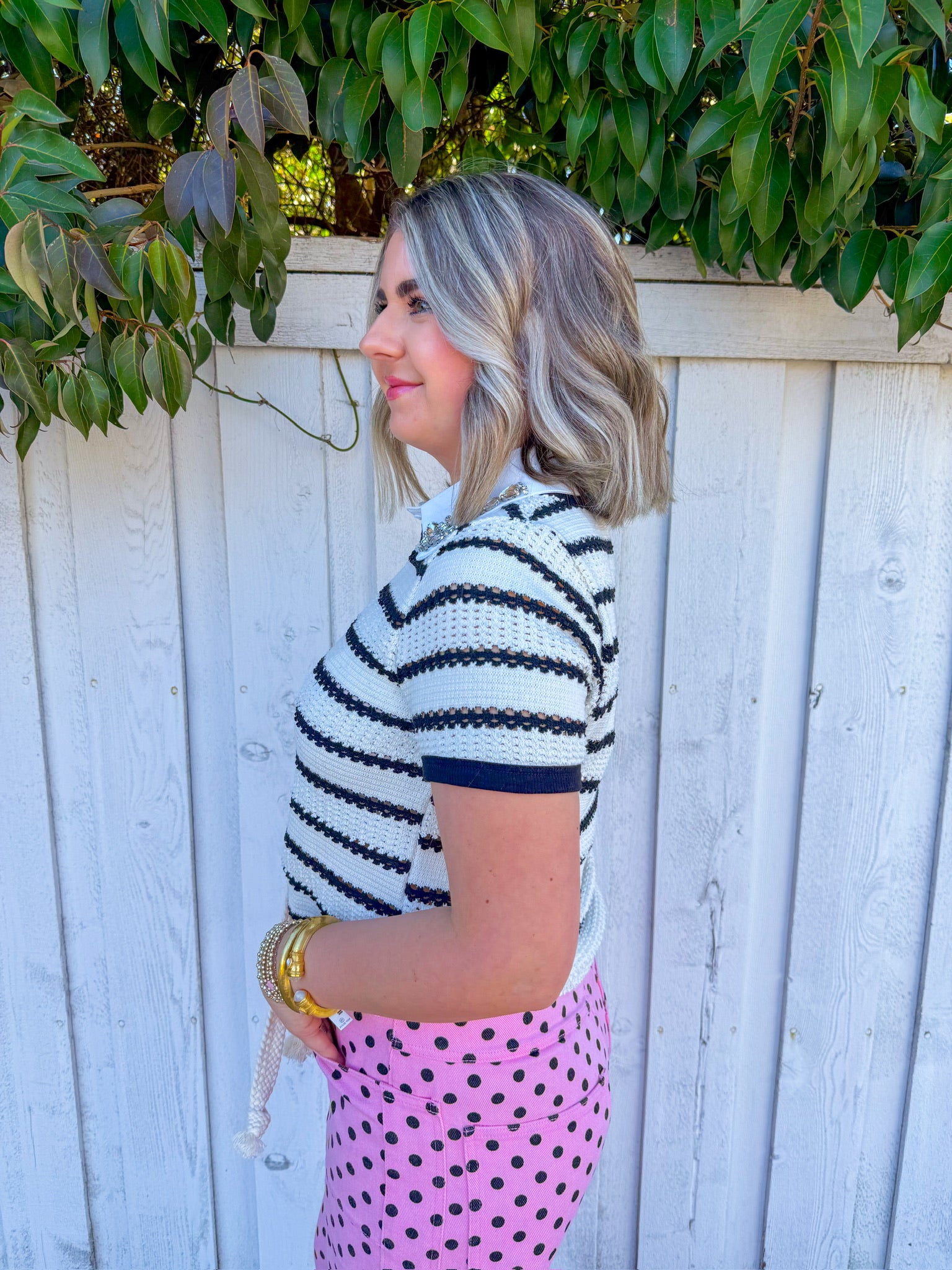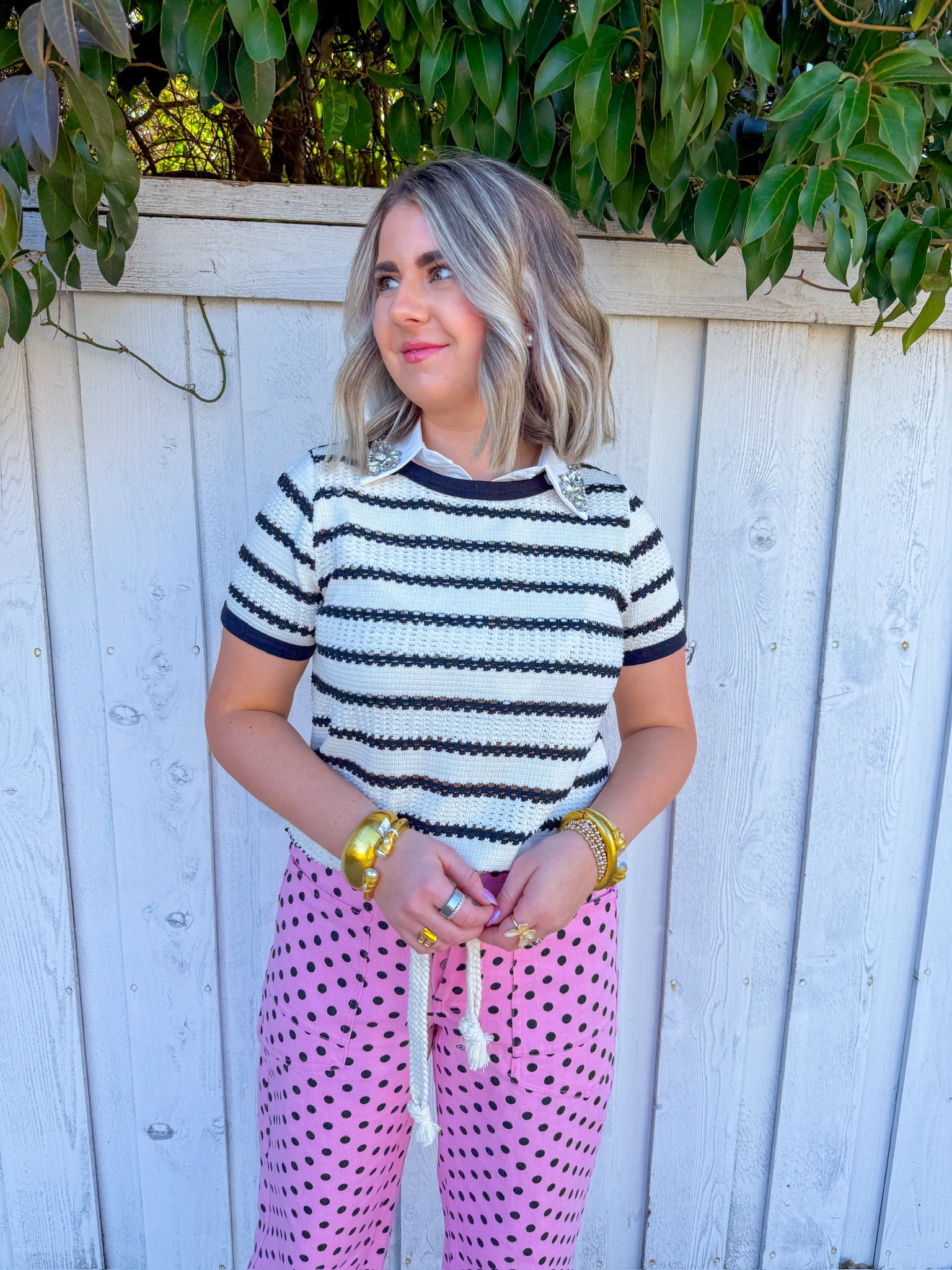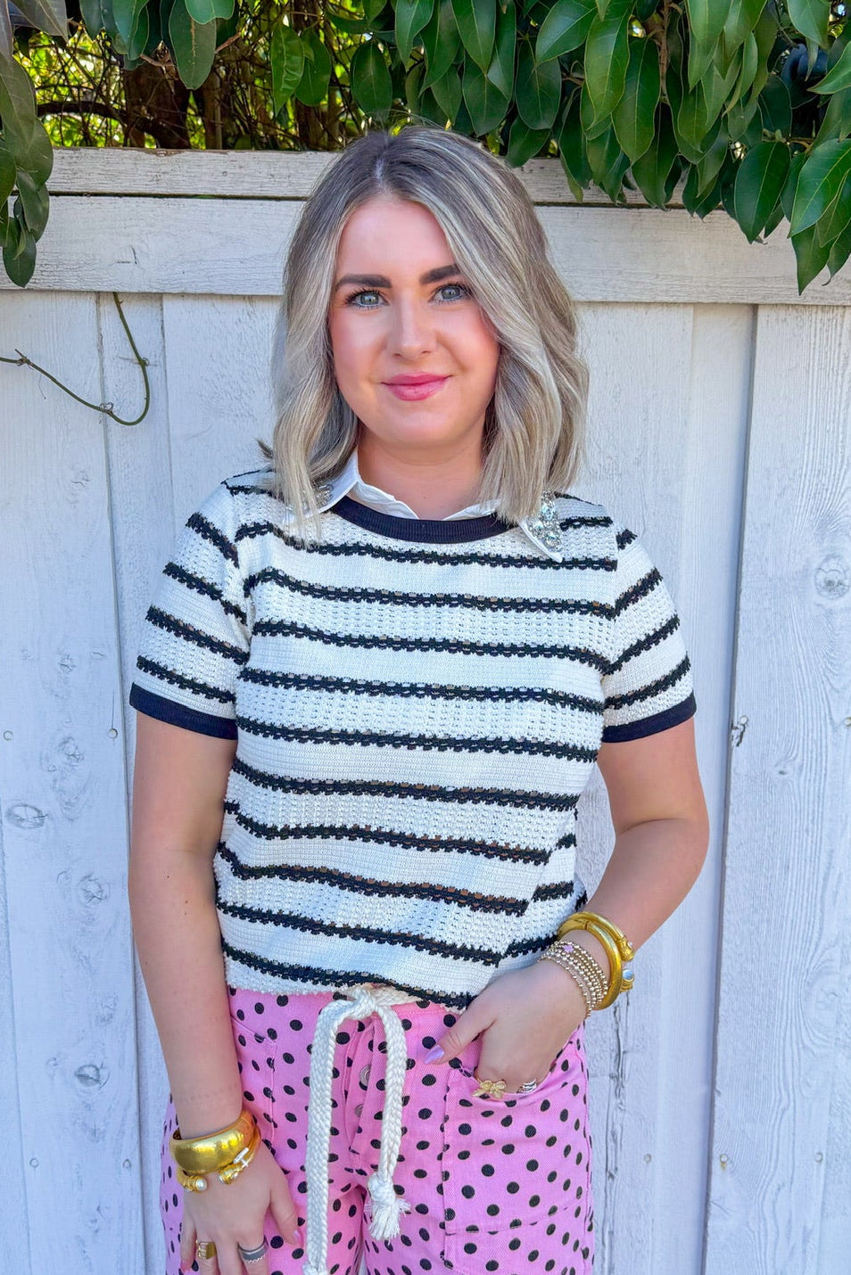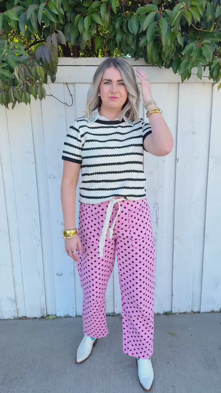 Flirt with classic style in this cream short-sleeve sweater top, featuring bold black stripes that add instant visual pop.