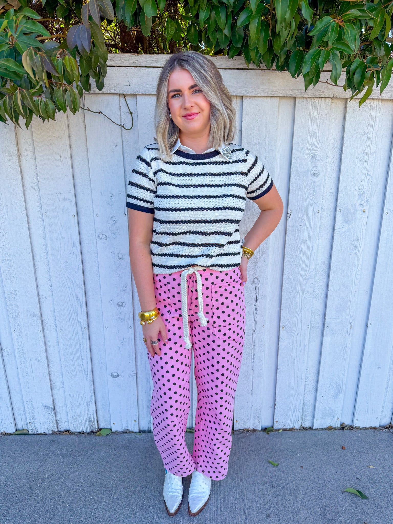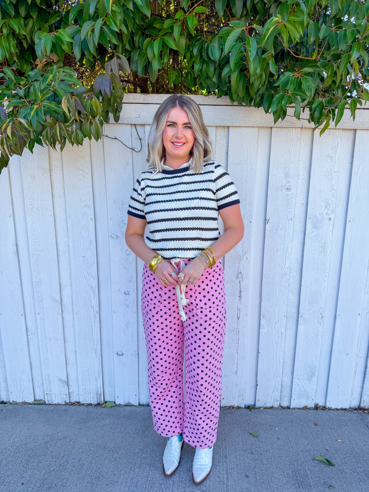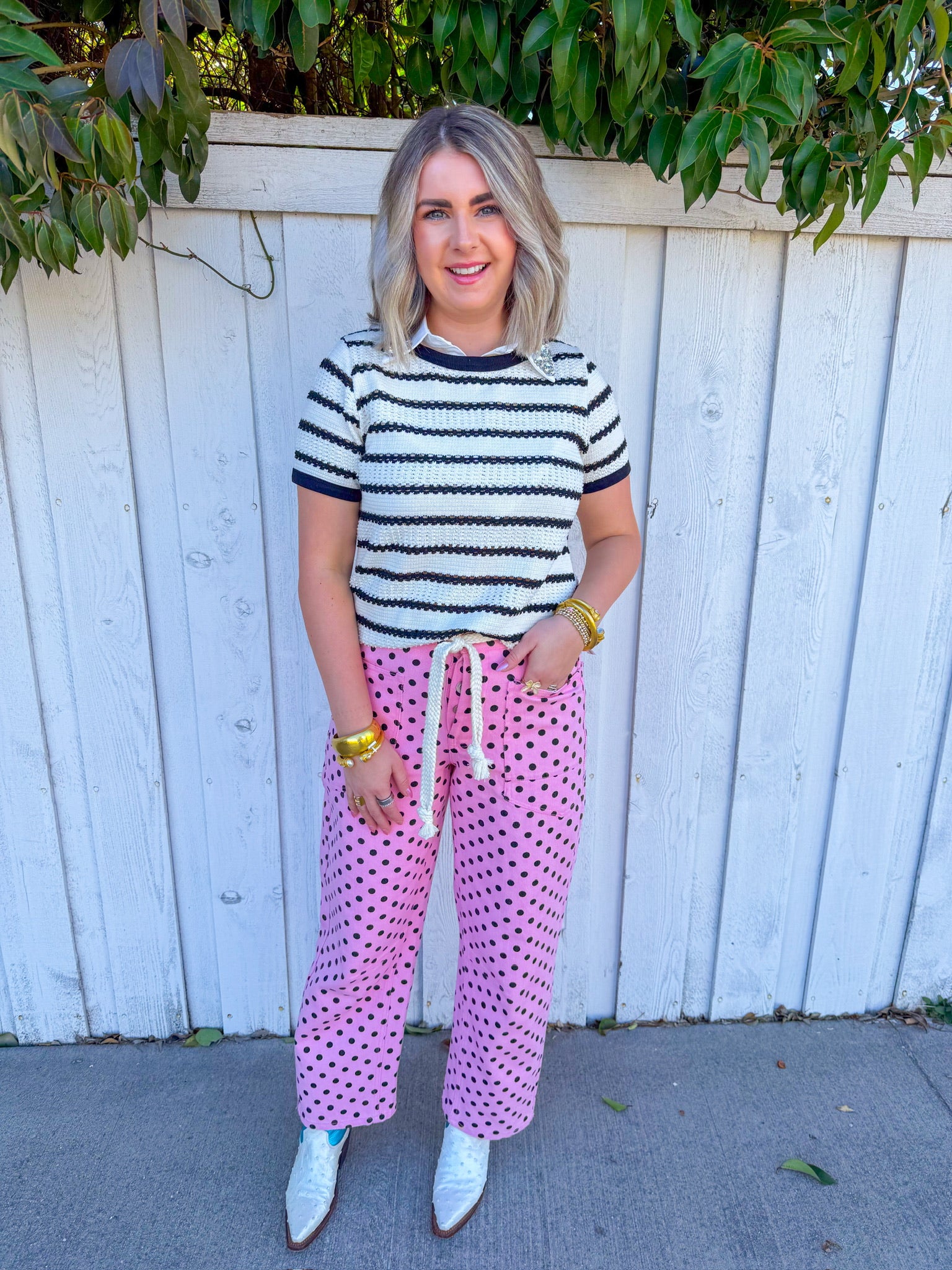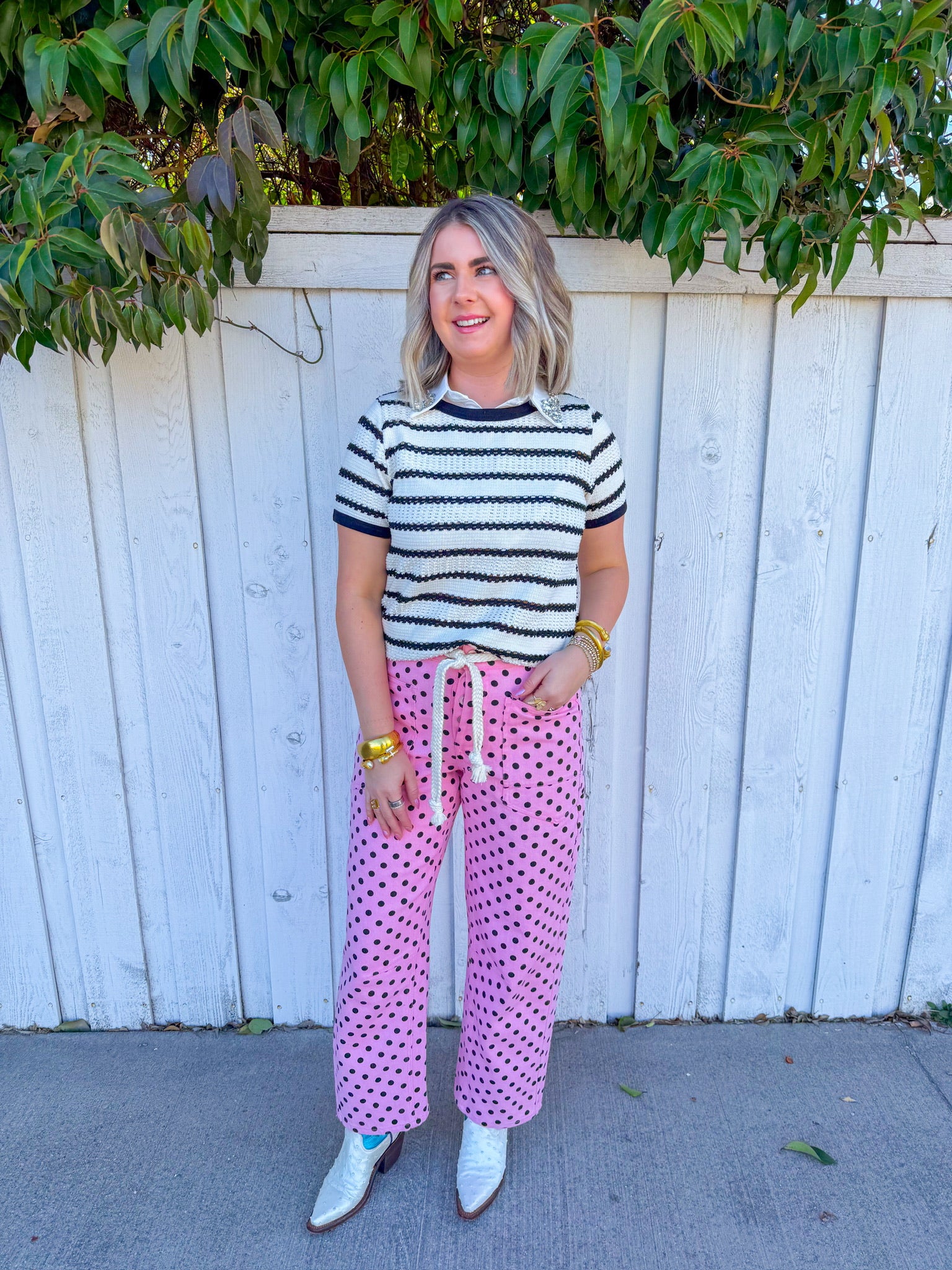 Flirt with classic style in this cream short-sleeve sweater top, featuring bold black stripes that add instant visual pop.