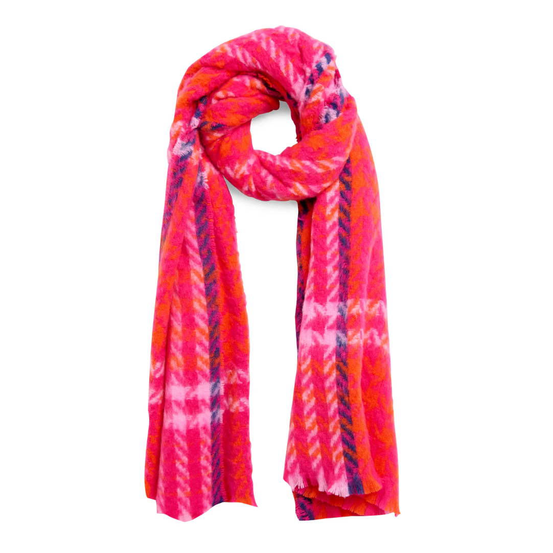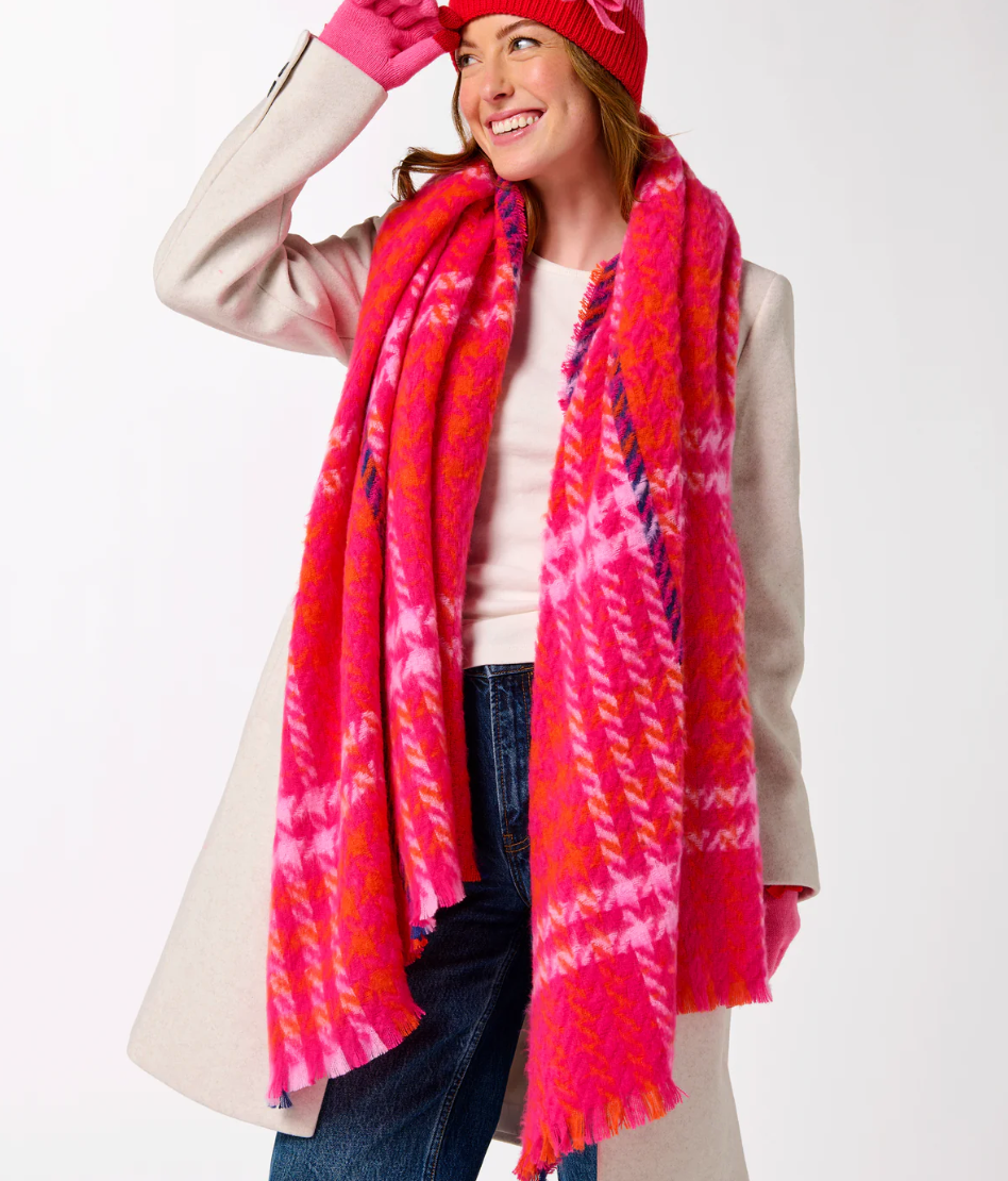 The Flo Scarf is your new cold-weather crush, bursting with personality in playful pinks and vibrant oranges. Designed with an eye-catching oversized houndstooth and chevron pattern, it adds a pop of color to even the dreariest winter day. Its extra-long silhouette lets you drape, wrap, or bundle with ease for all-day coziness. Made from ultra-soft fabric, it’s the perfect blend of warmth and whimsy.