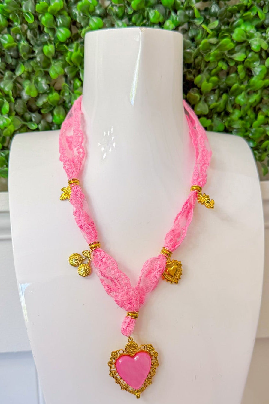This delicate lace charm necklace brings subtle charm and a pop of soft color, perfect for layering or wearing solo. Light, lovely, and full of personality—wear it as your new favorite little good-luck token!