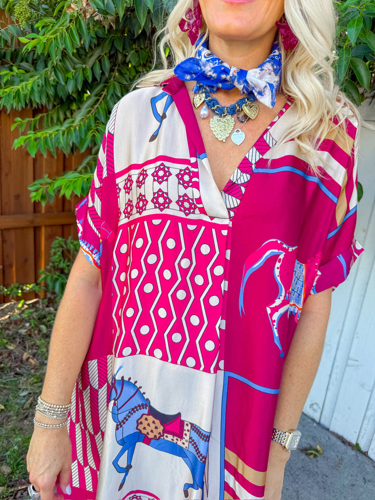 Garnet-and-cream scarf-print popover dress with regal horse motifs, a collared V-neck, and an easy, swishy fit—so fun for fall fairs and wine nights.
