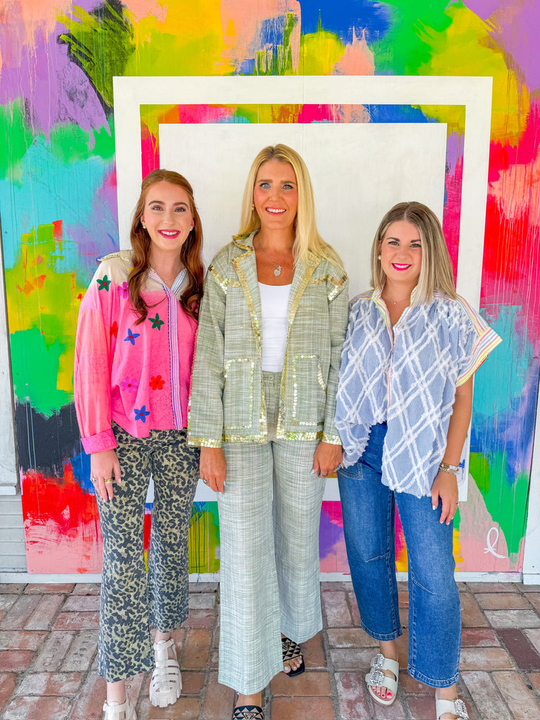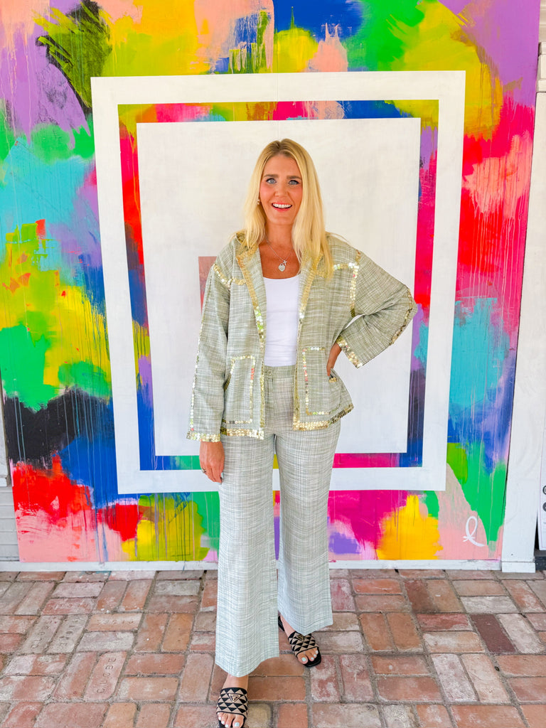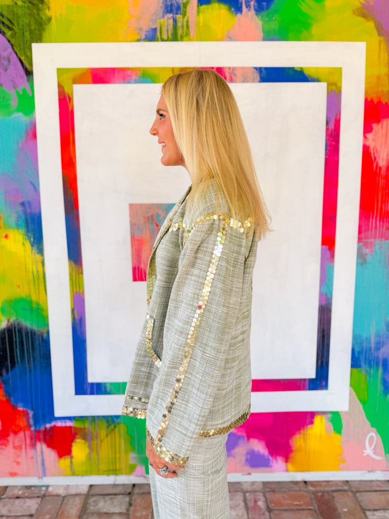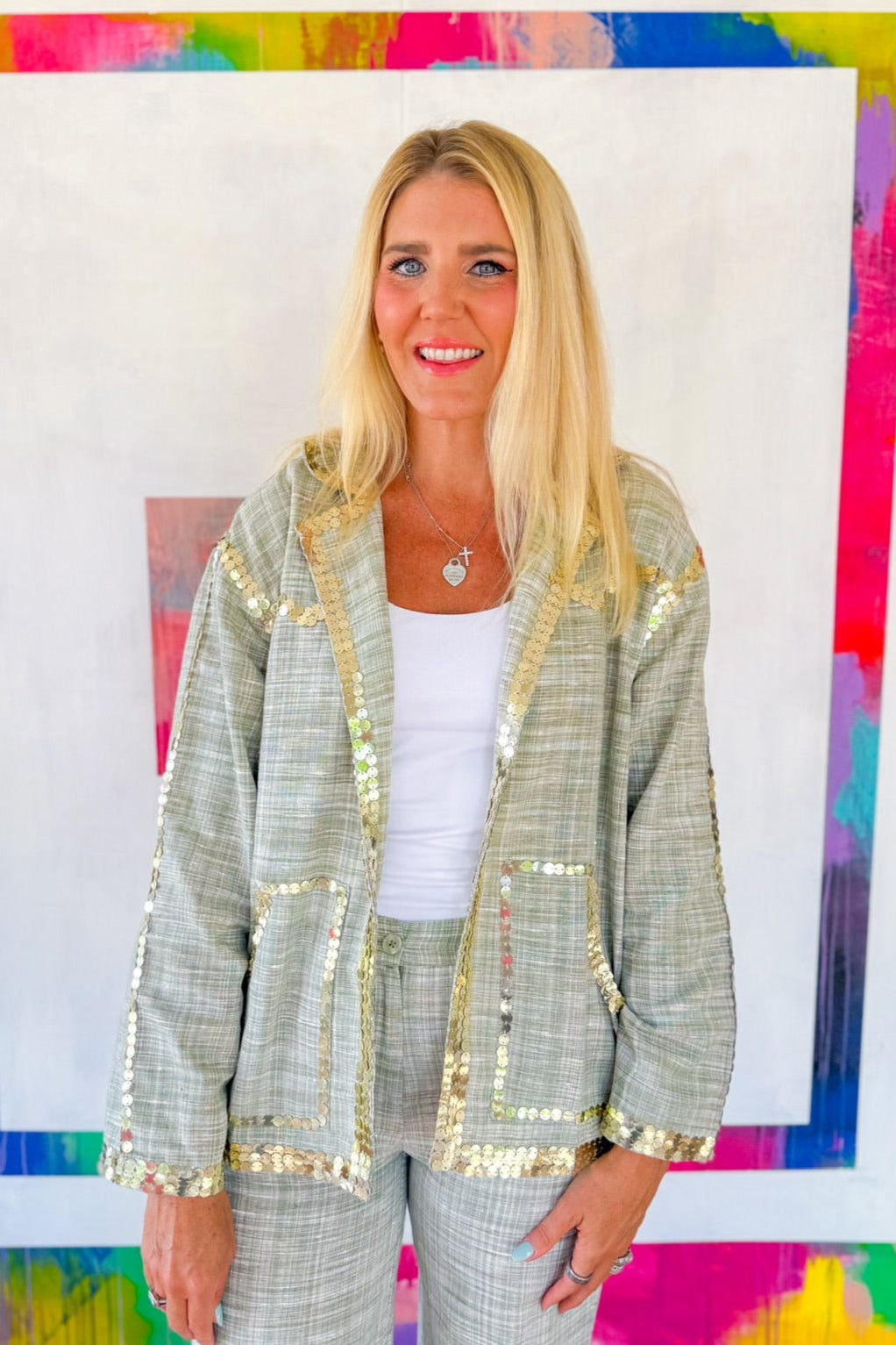 This green jacket is giving low-key glam with its metallic sequin trim and cool, crinkled texture.