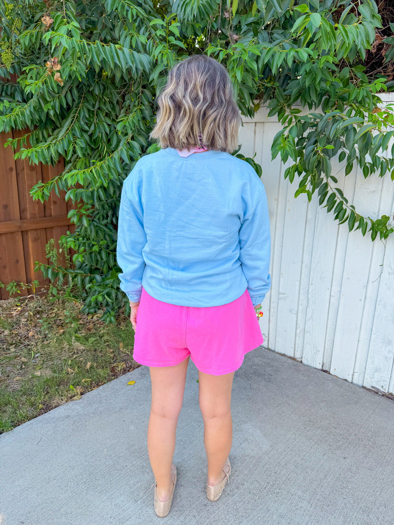 This pastel blue sweatshirt radiates joy with its colorful “GLORY TO GOD” graphic splashed across the front in bold, playful lettering. Complete with fun doodles like a smiley face, bow, and cross, it’s a feel-good favorite that spreads positivity everywhere you go.