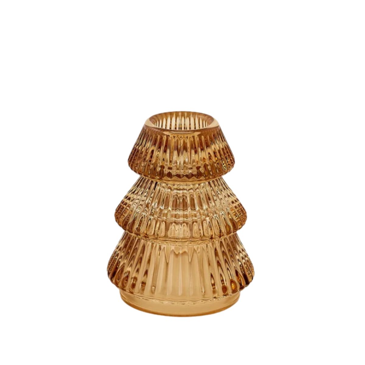 Bring a touch of golden elegance to your holiday table with this charming tree-shaped taper candle holder. Standing at a petite 3.25 inches, it's the perfect size for creating cozy, festive moments without taking up precious space.
