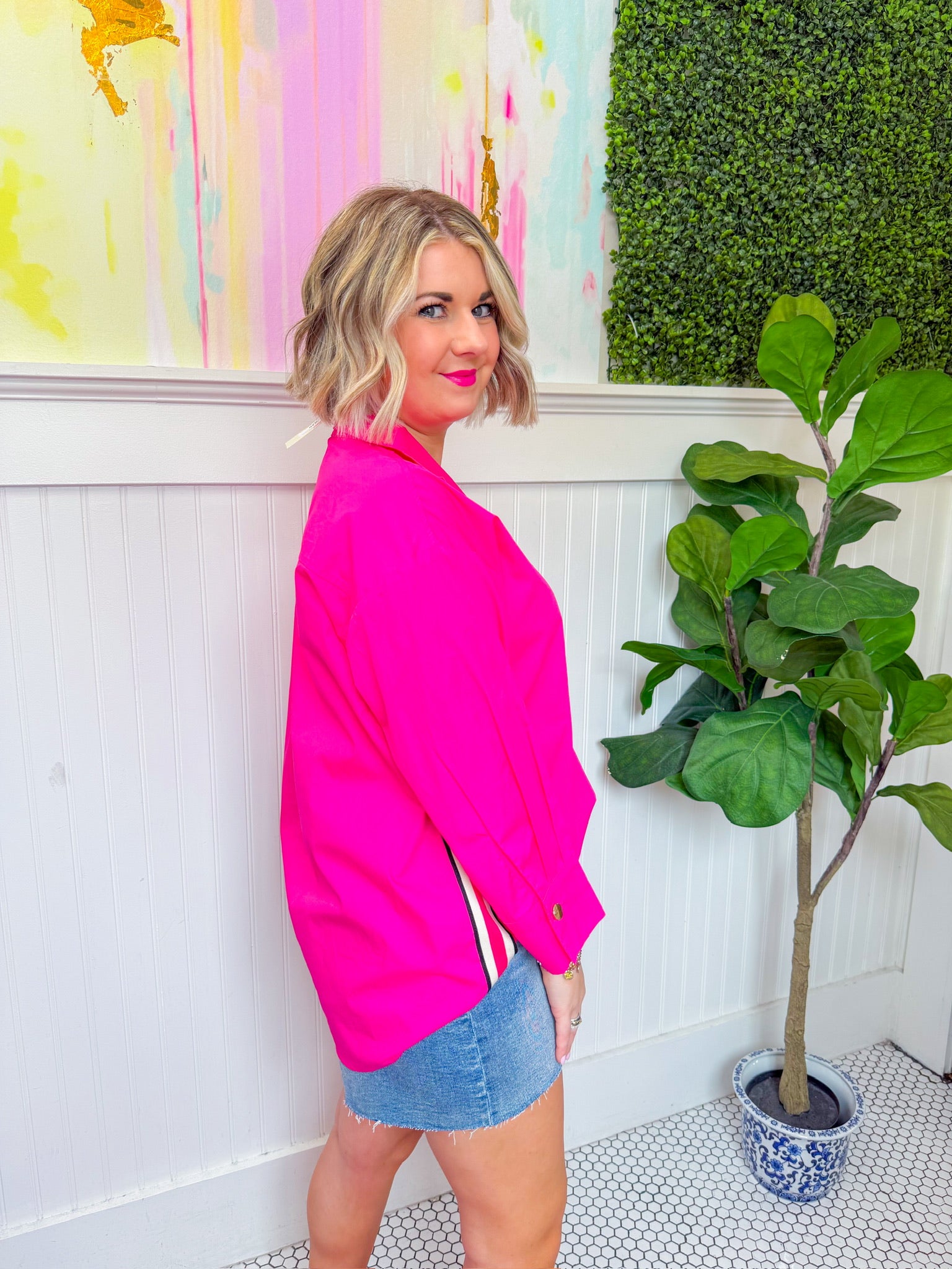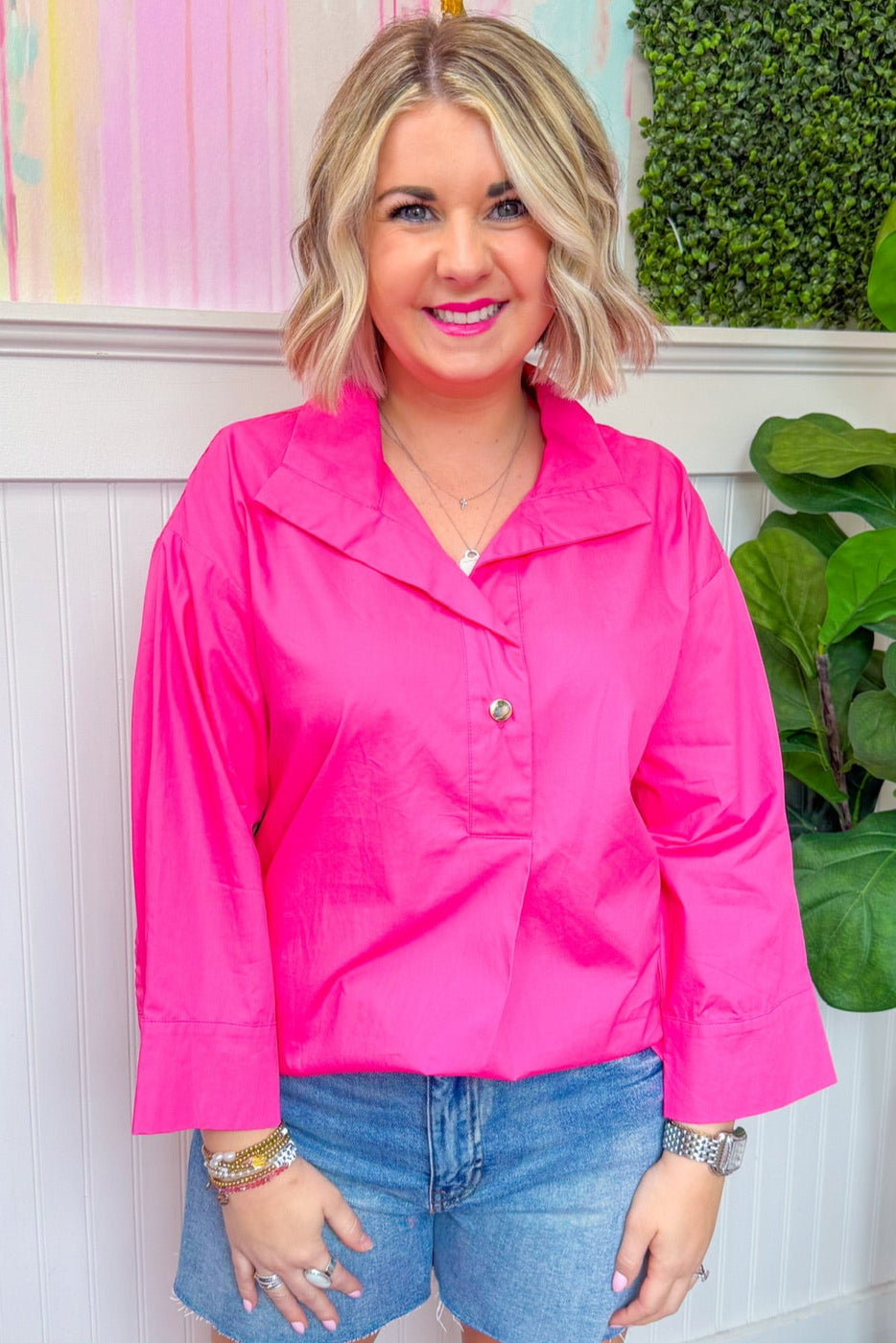 Stepping into style has never been this fun! Meet the Good Graces Top—where classic charm meets a bold pop of personality. This long-sleeve village-green beauty is anything but basic, featuring eye-catching pink scalloped trim that adds the perfect touch of playful elegance. Whether you're styling it with crisp white denim for a fresh spring look or layering it under a statement jacket for a city-chic vibe, this top is here to make every outfit effortlessly standout.