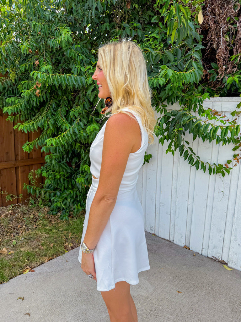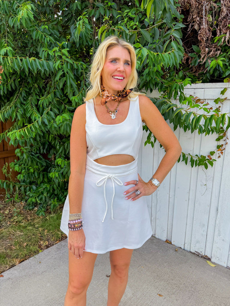 The Gracie Dress in Off White is your new go-to for sporty style with a flirty twist. Featuring a playful keyhole cutout at the front, this mini dress combines athletic vibes with a fun, feminine edge.