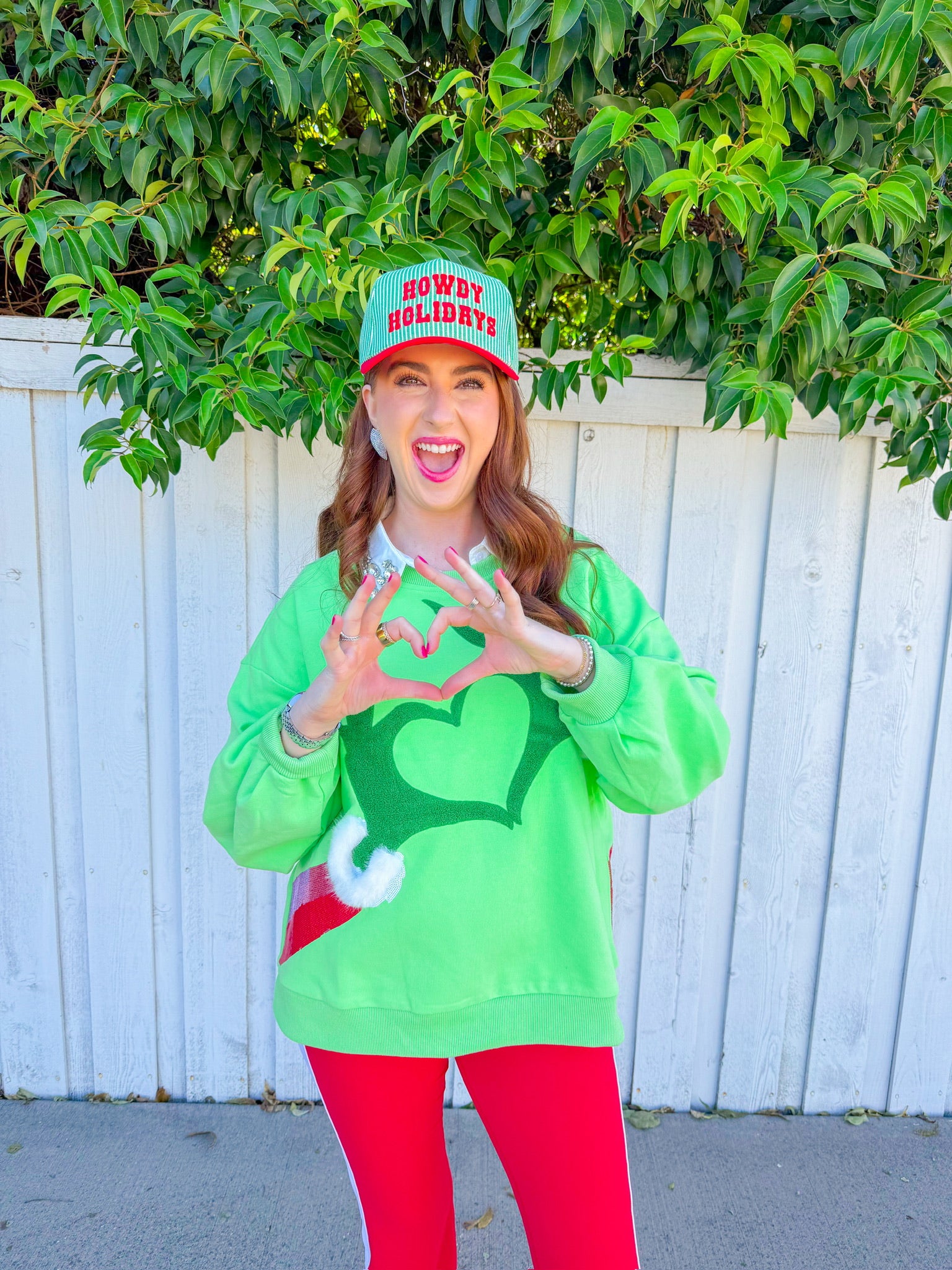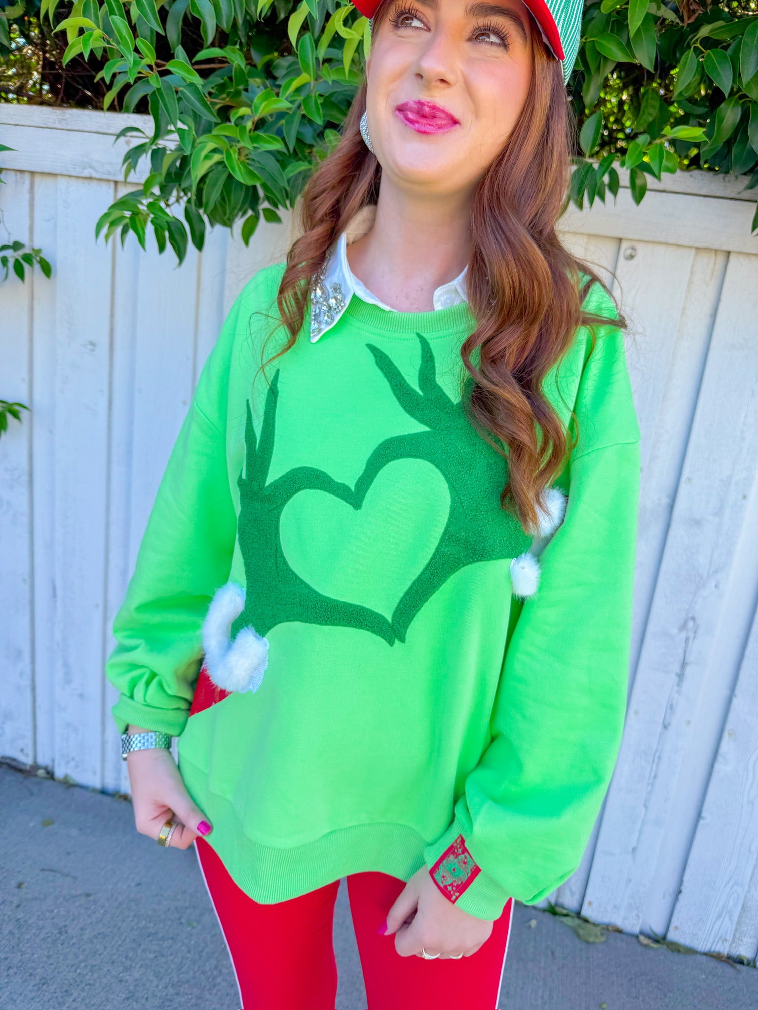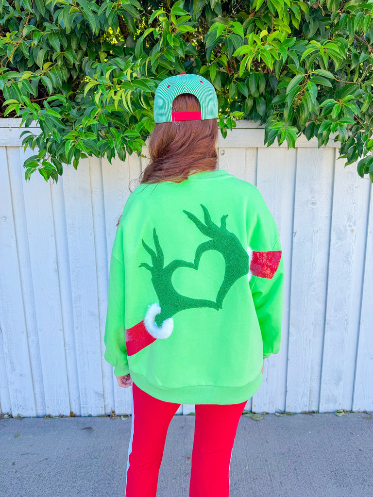Even the Grinch's heart grows three sizes in this charming green sweatshirt! Featuring those mischievous green hands forming a love heart, it's the perfect blend of holiday sass and seasonal sweetness. Cozy, quirky, and unapologetically fun—wear it to spread some Grinch-approved cheer with a cheeky grin.