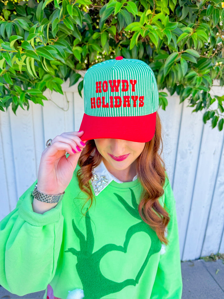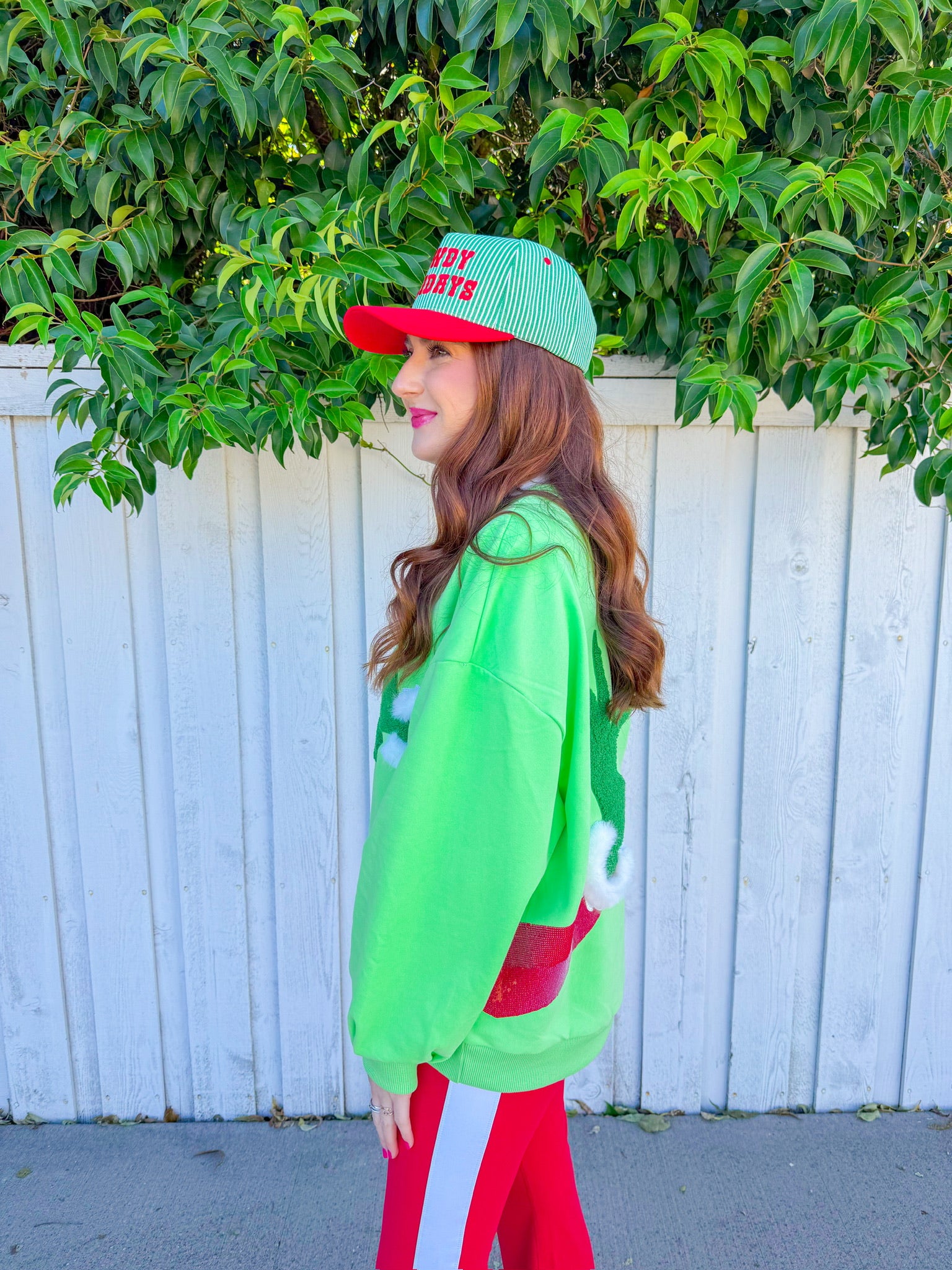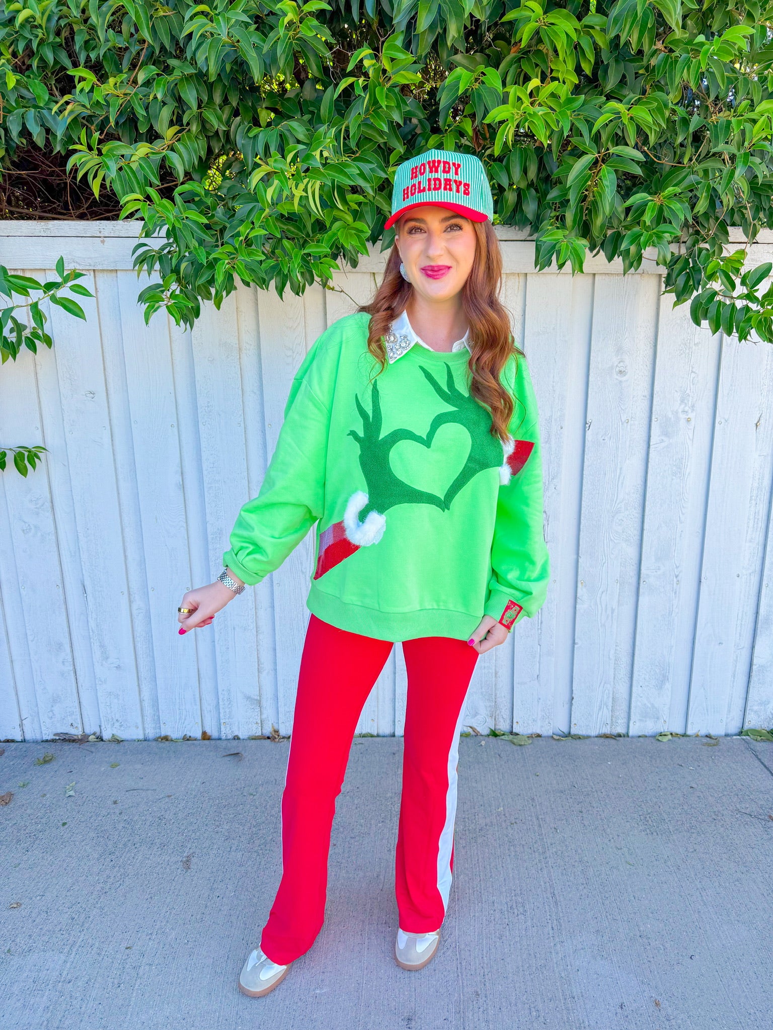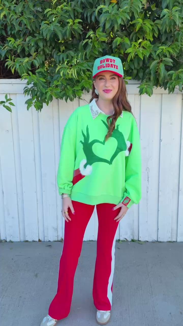 Even the Grinch's heart grows three sizes in this charming green sweatshirt! Featuring those mischievous green hands forming a love heart, it's the perfect blend of holiday sass and seasonal sweetness. Cozy, quirky, and unapologetically fun—wear it to spread some Grinch-approved cheer with a cheeky grin.