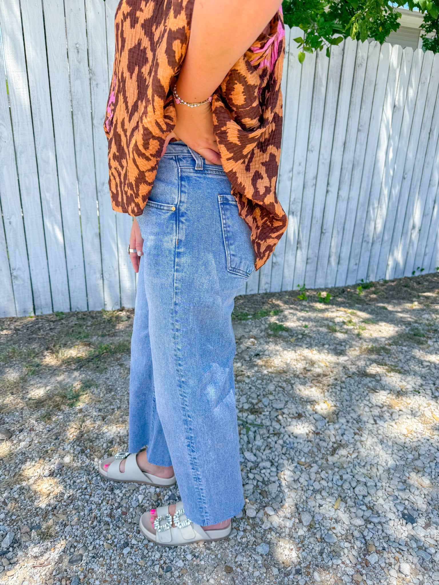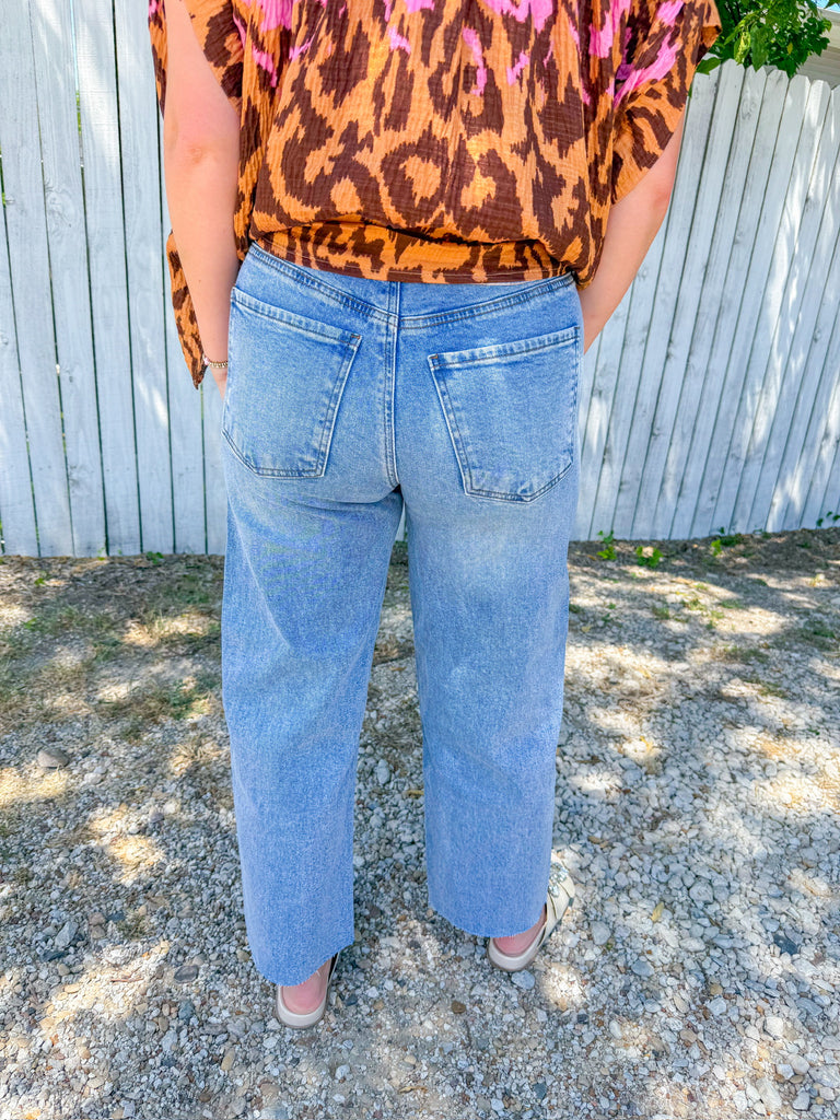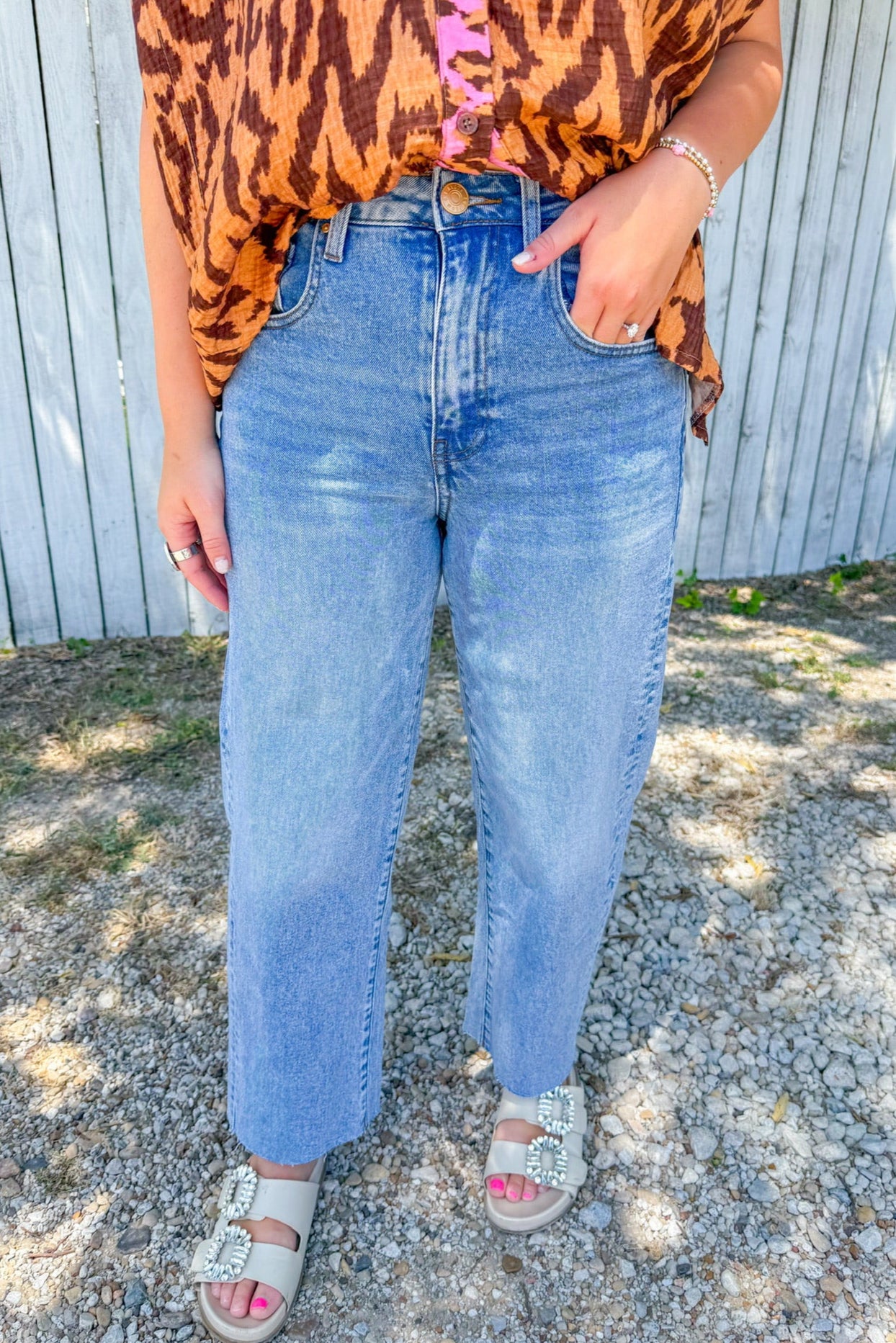 These high rise jeans feature a slouchy wide leg, raw hem, and classic five-pocket design. The medium wash gives them a vintage vibe, perfect for laid-back, everyday style.