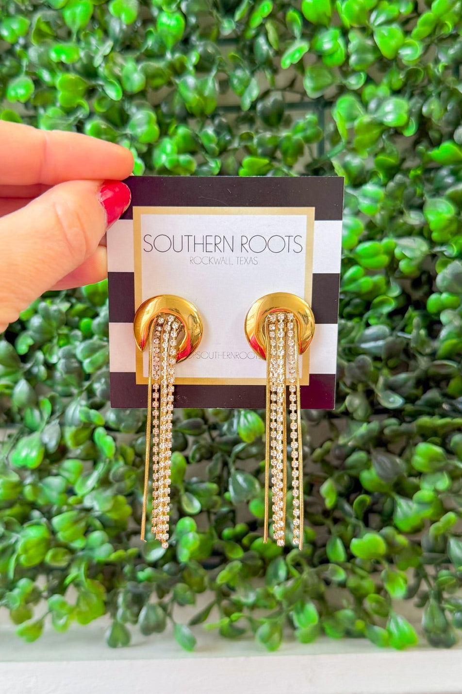 Meet your new favorite ear candy. These half moon studs feature shimmering gold crescents paired with cascading rhinestone fringe that catches light with every turn of your head.
