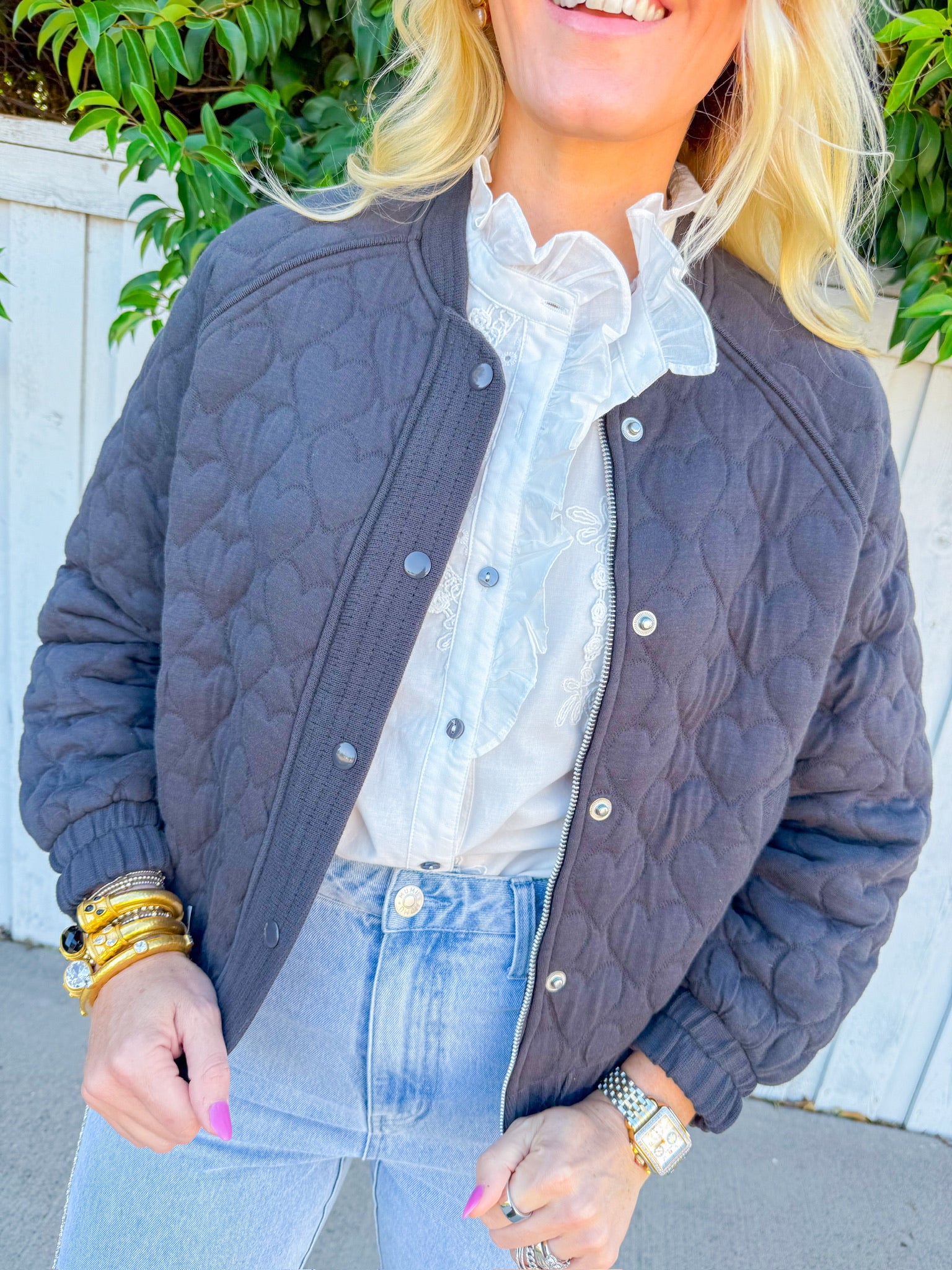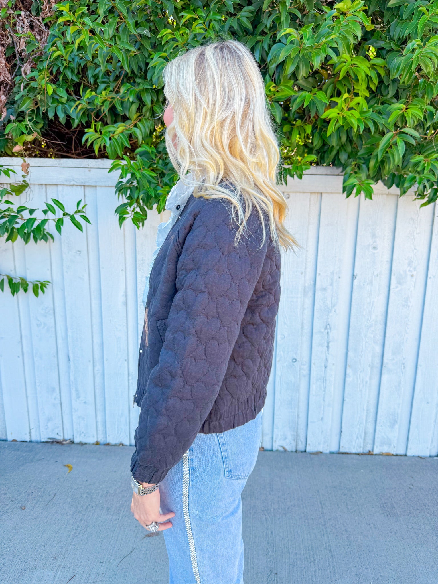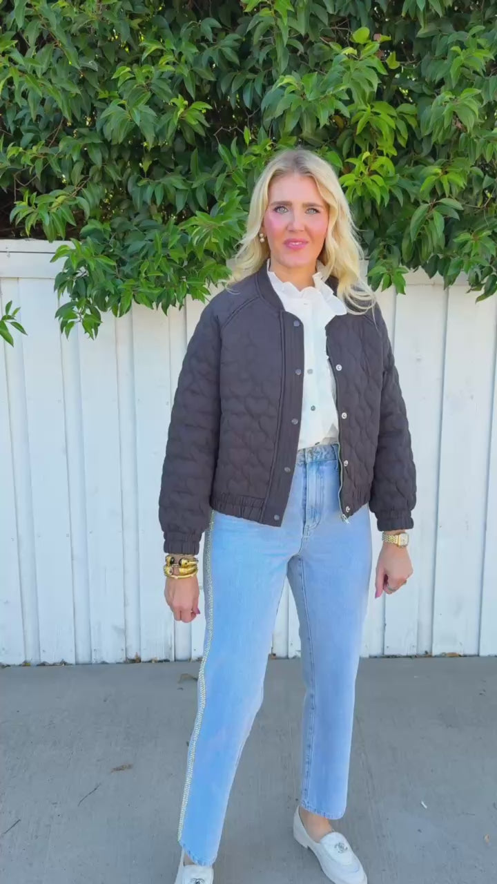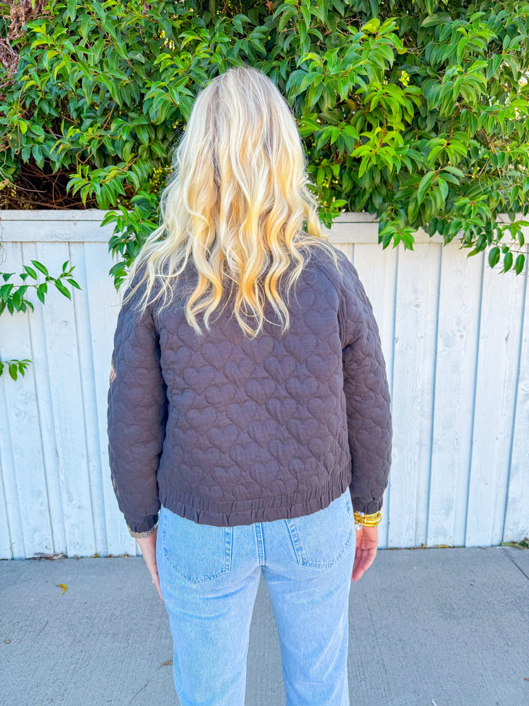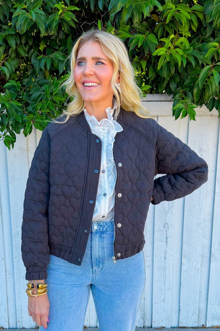 Elevate your everyday style with the Hannah Hearts Jacket—a chic black quilted bomber that's equal parts cozy and cool.