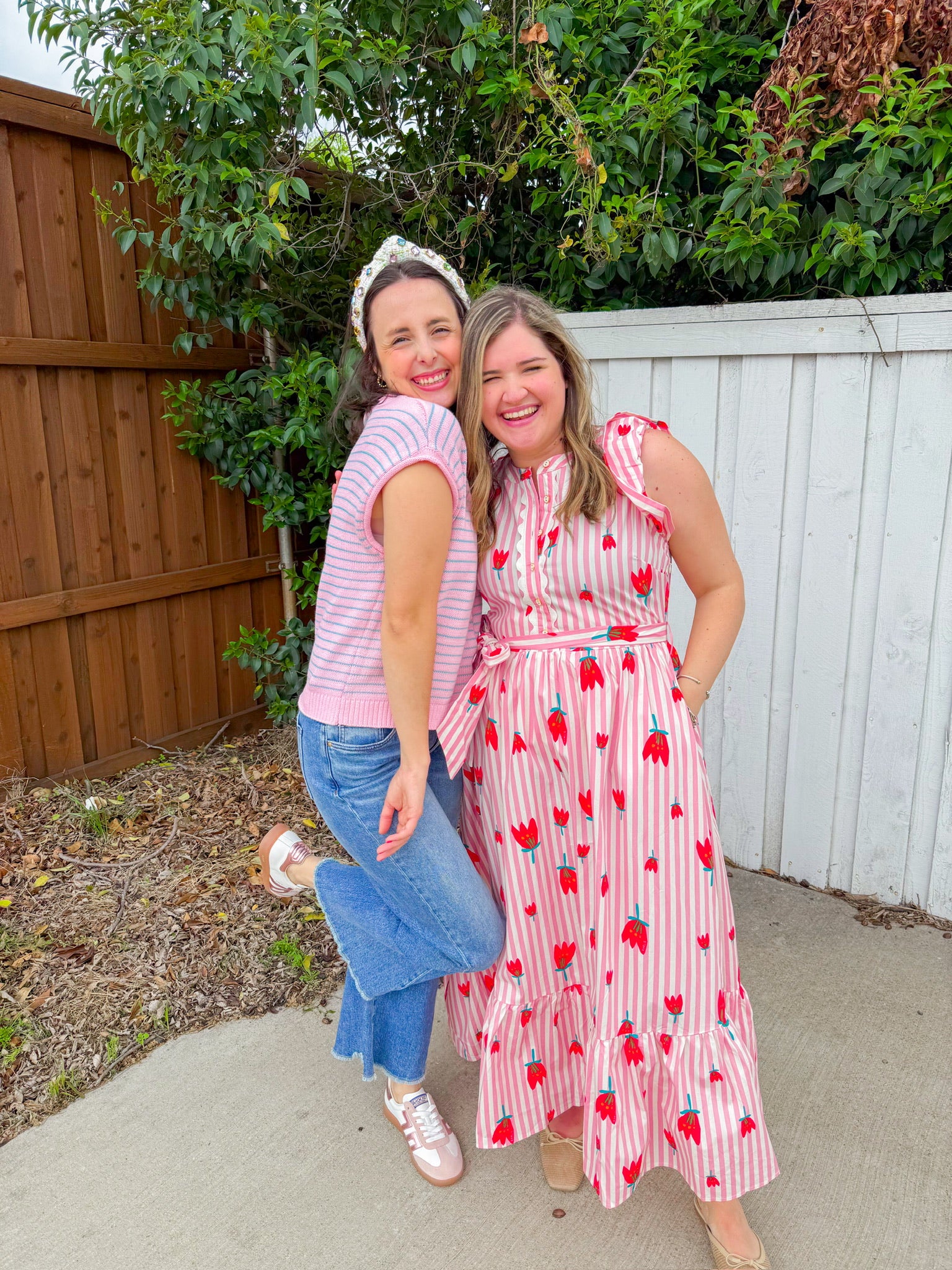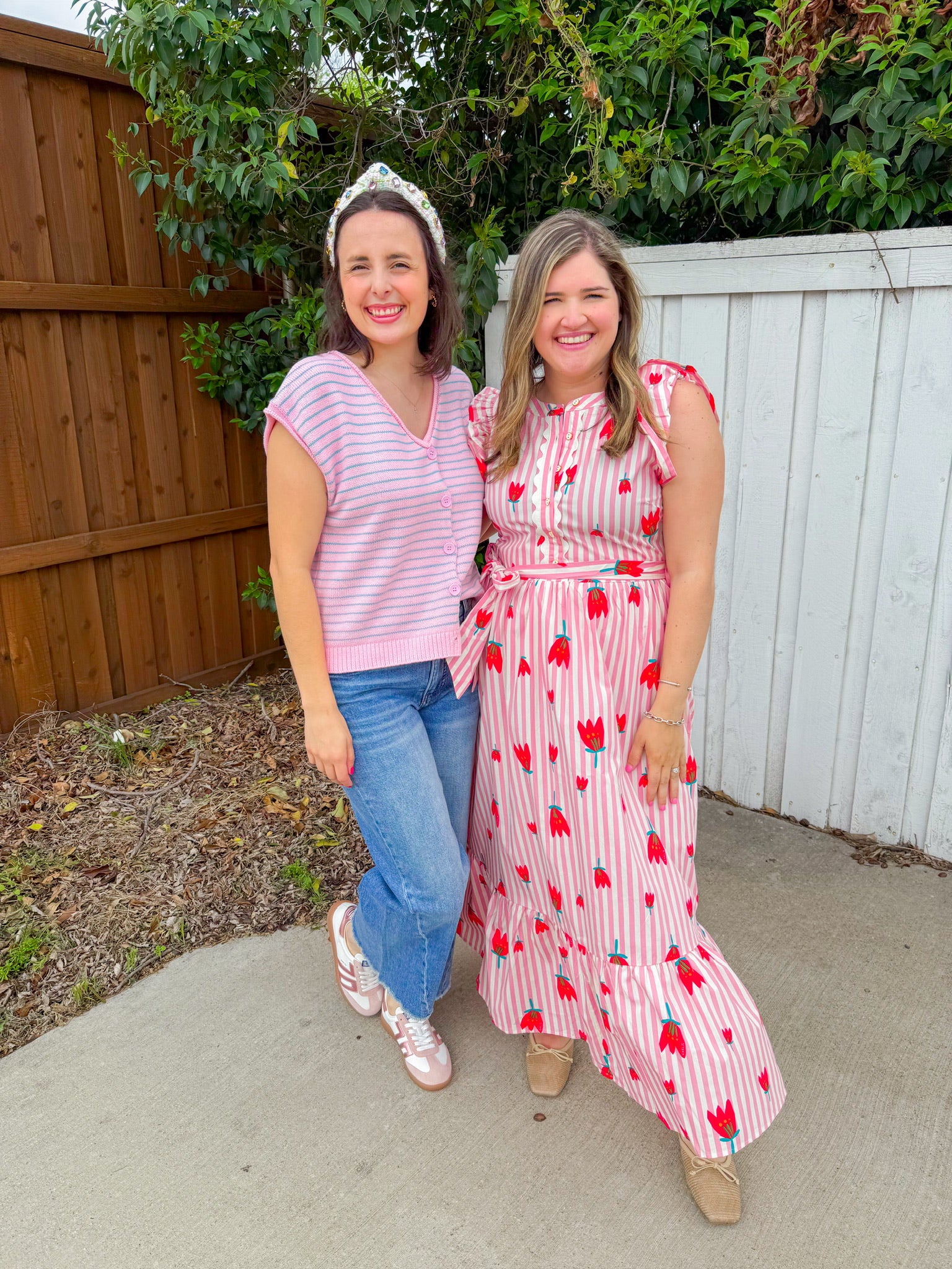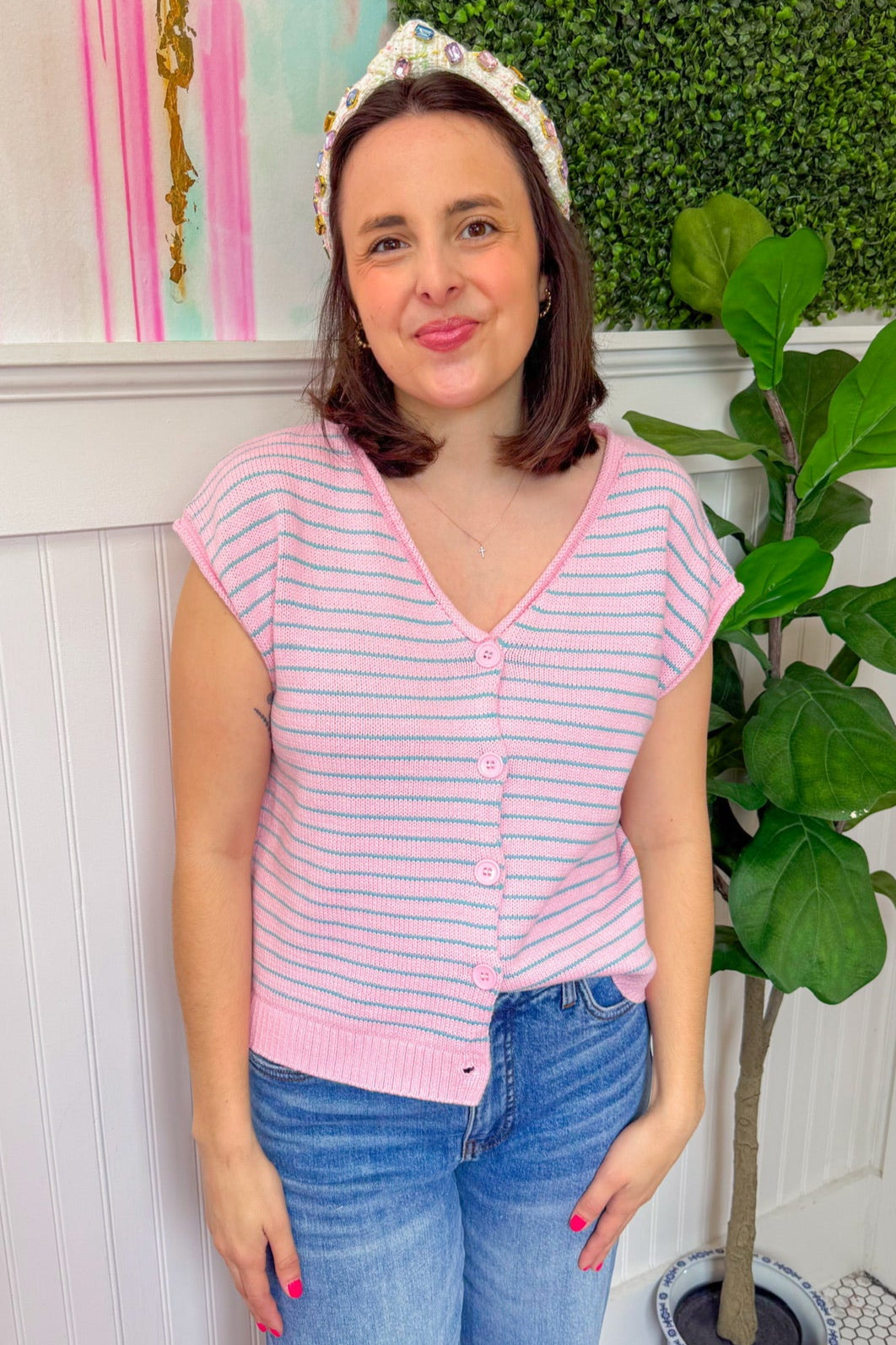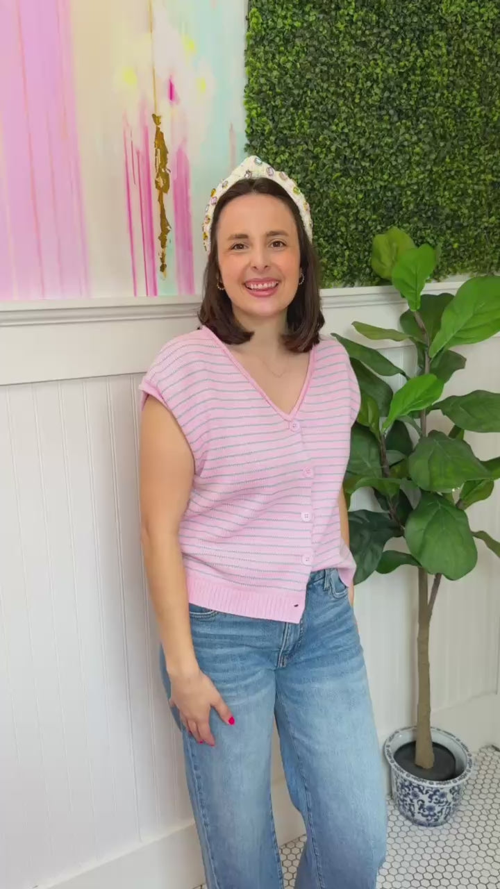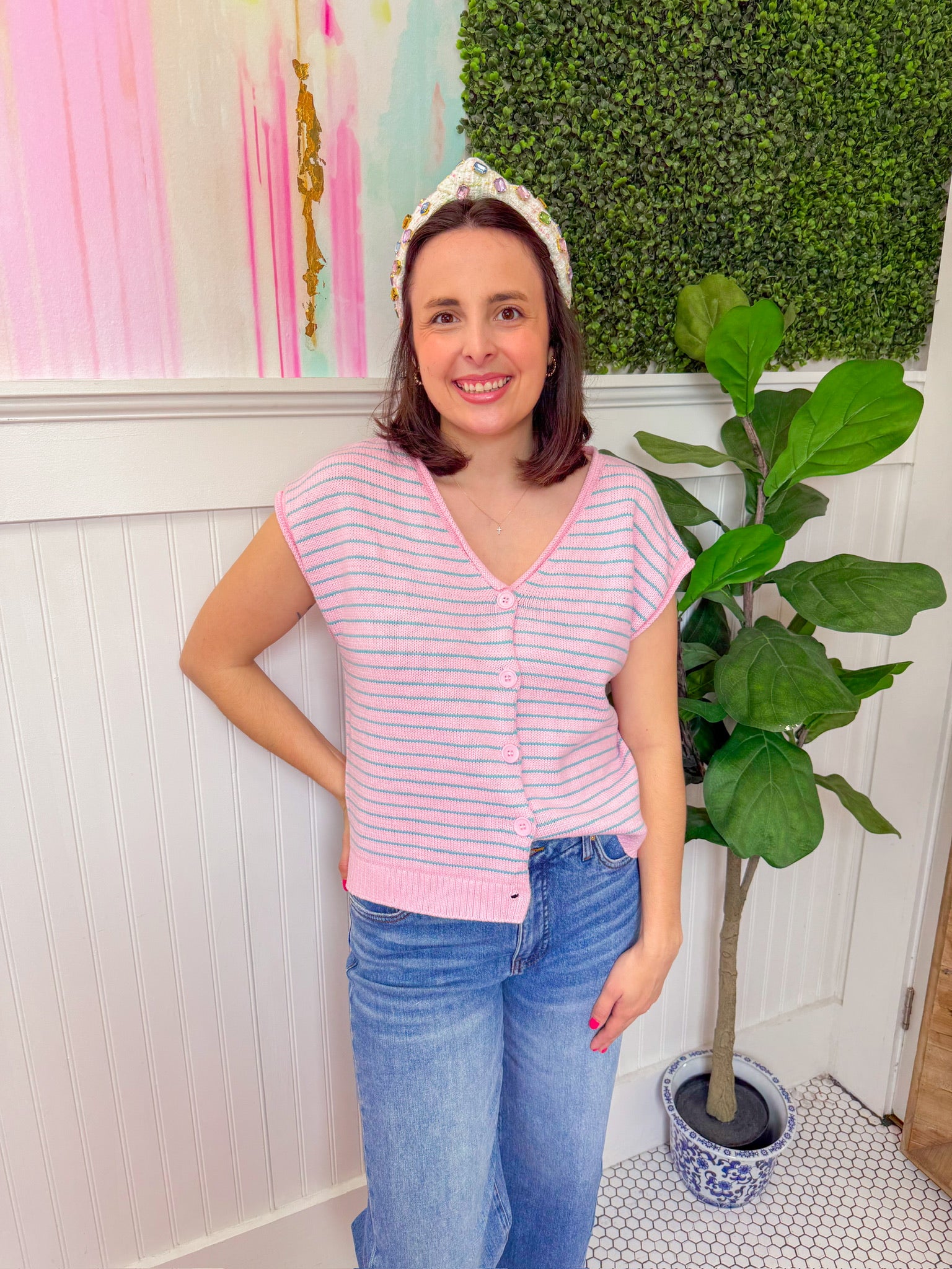 The Have It All Sweater is here to steal the show—because why settle when you can have it all? This bubblegum pink sweater vest is as sweet as candy and just as bold, with playful turquoise skinny stripes that add a pop of contrast. The button-down front gives you endless styling options—wear it solo for a statement look, layer it over a crisp white blouse for preppy vibes, or throw it on over a dress for an unexpected twist.