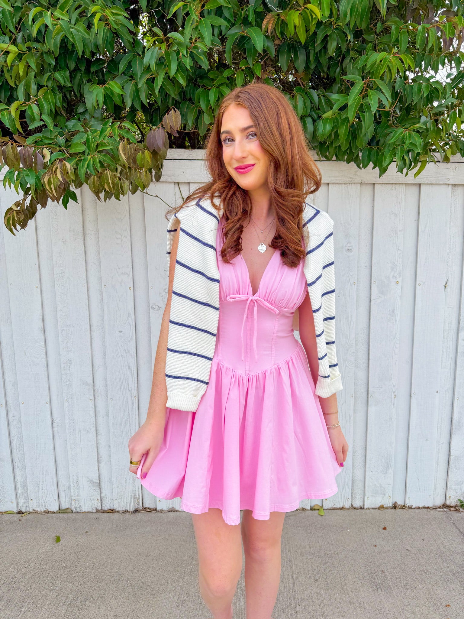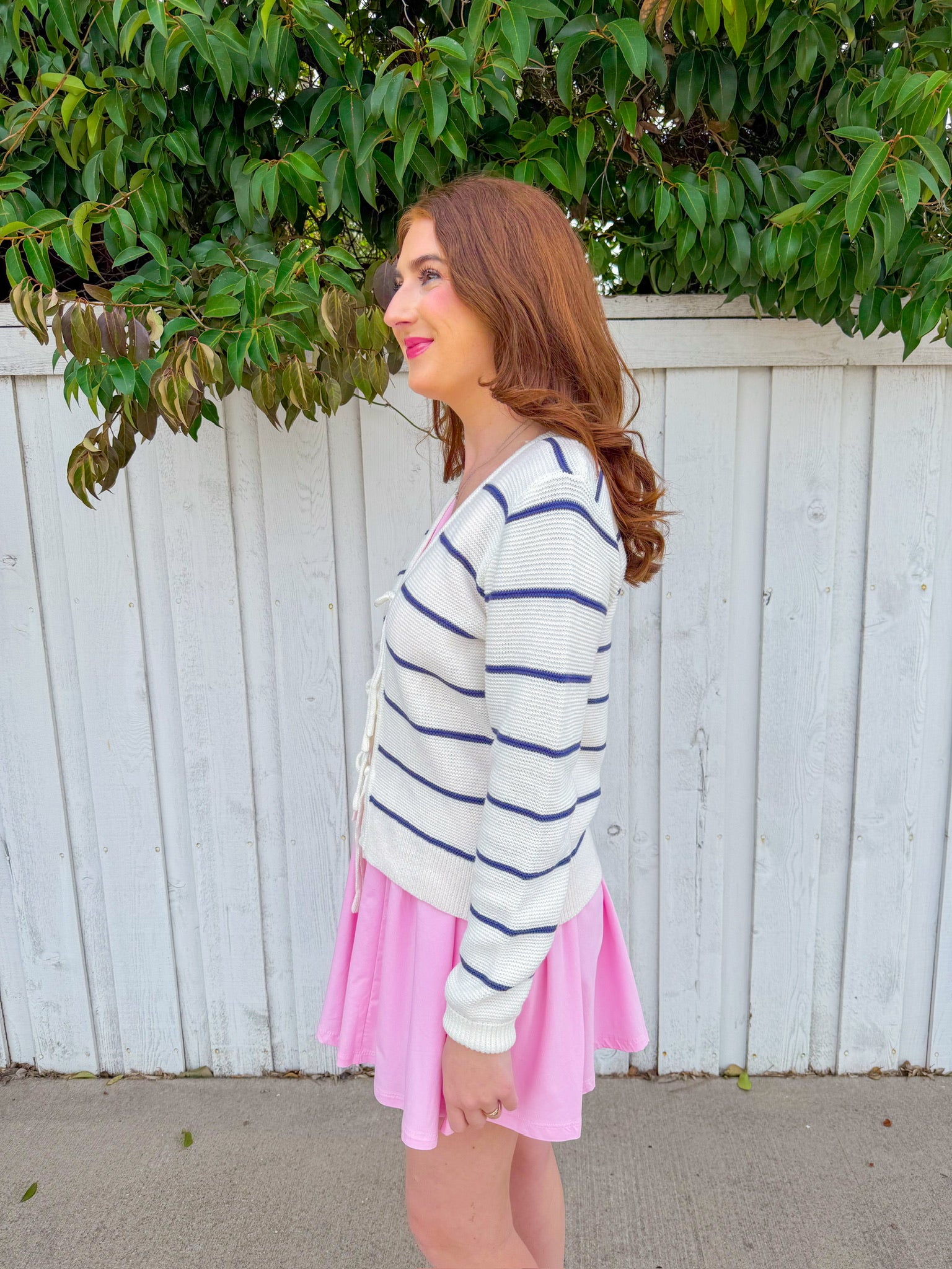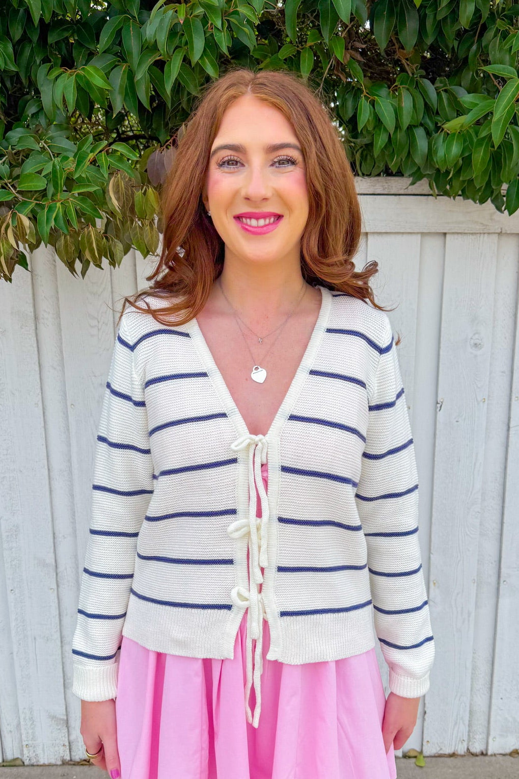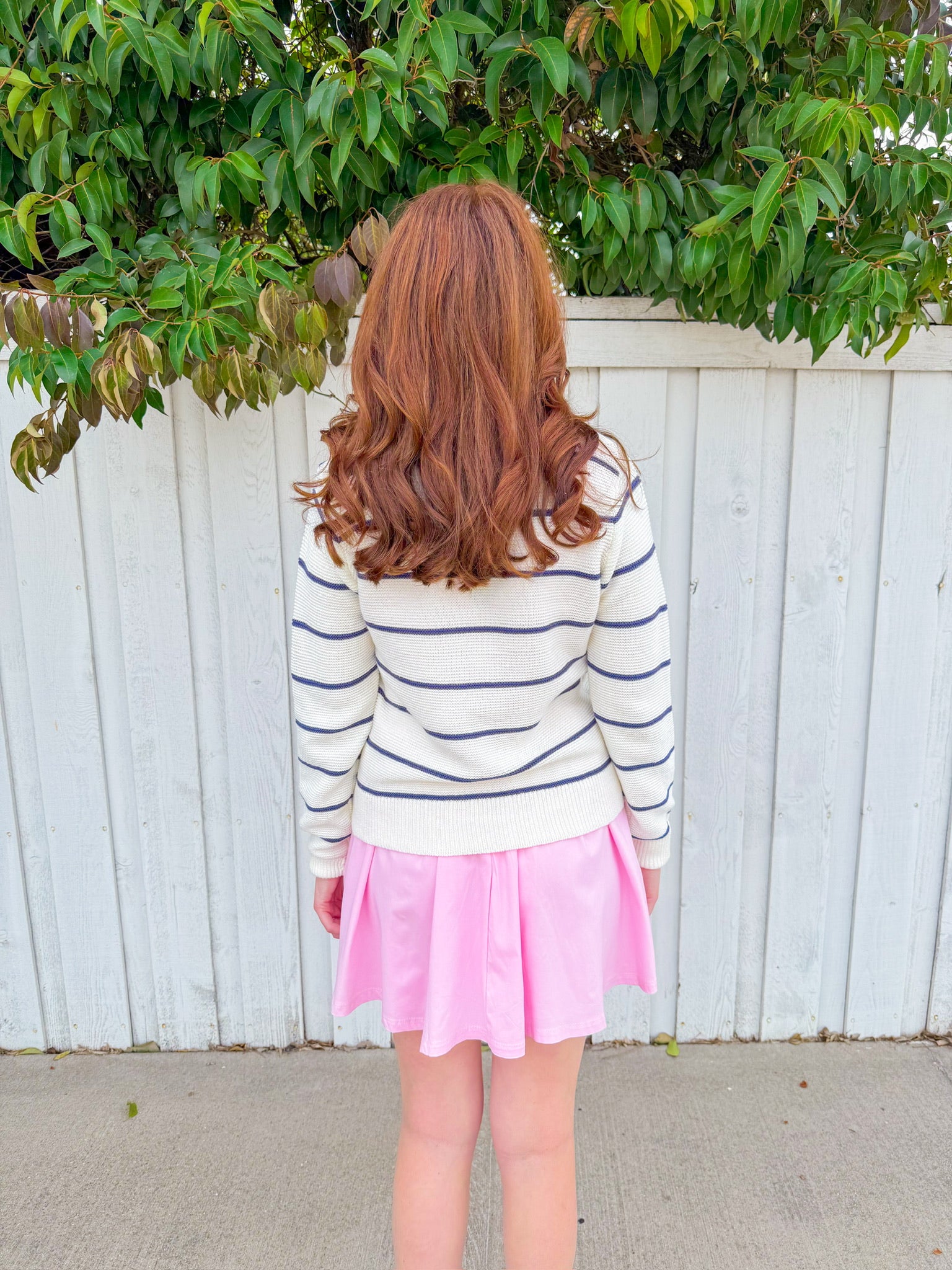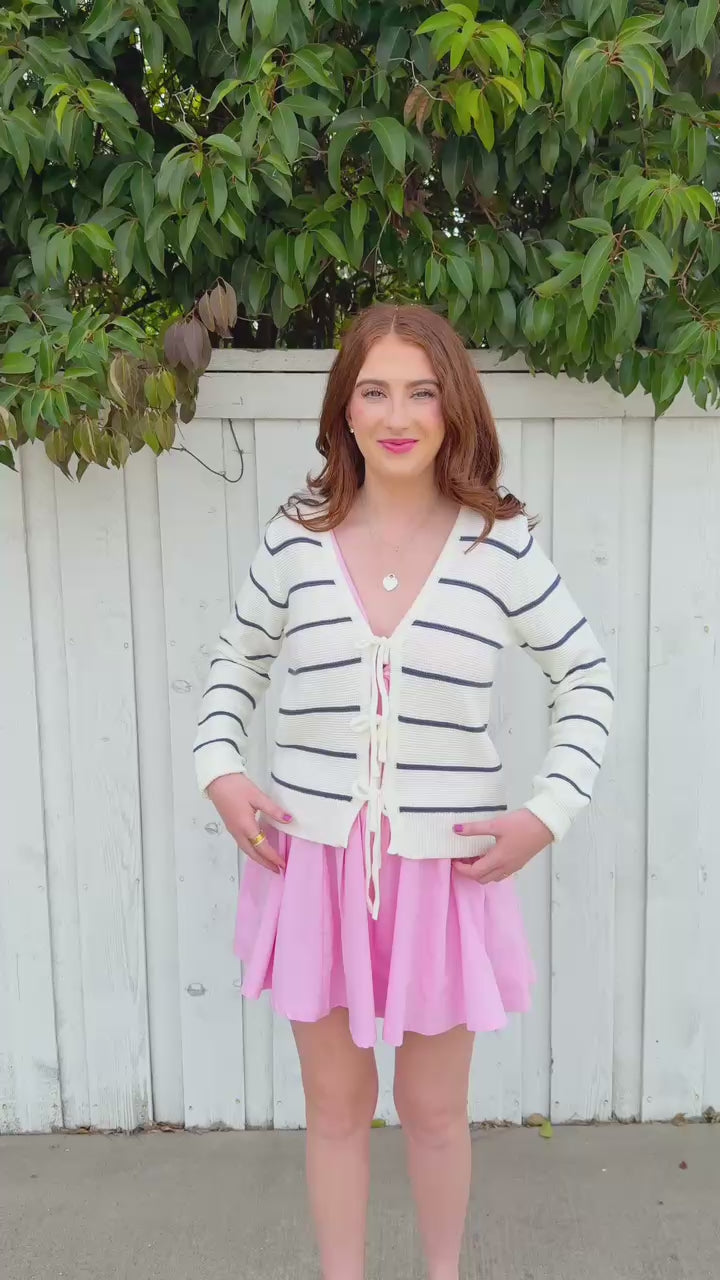 Adorable ivory cardigan featuring bold navy stripes and a charming bow closure running down the front. Perfect for layering over your favorite tees or dresses, this piece brings a sweet, preppy vibe to any outfit.