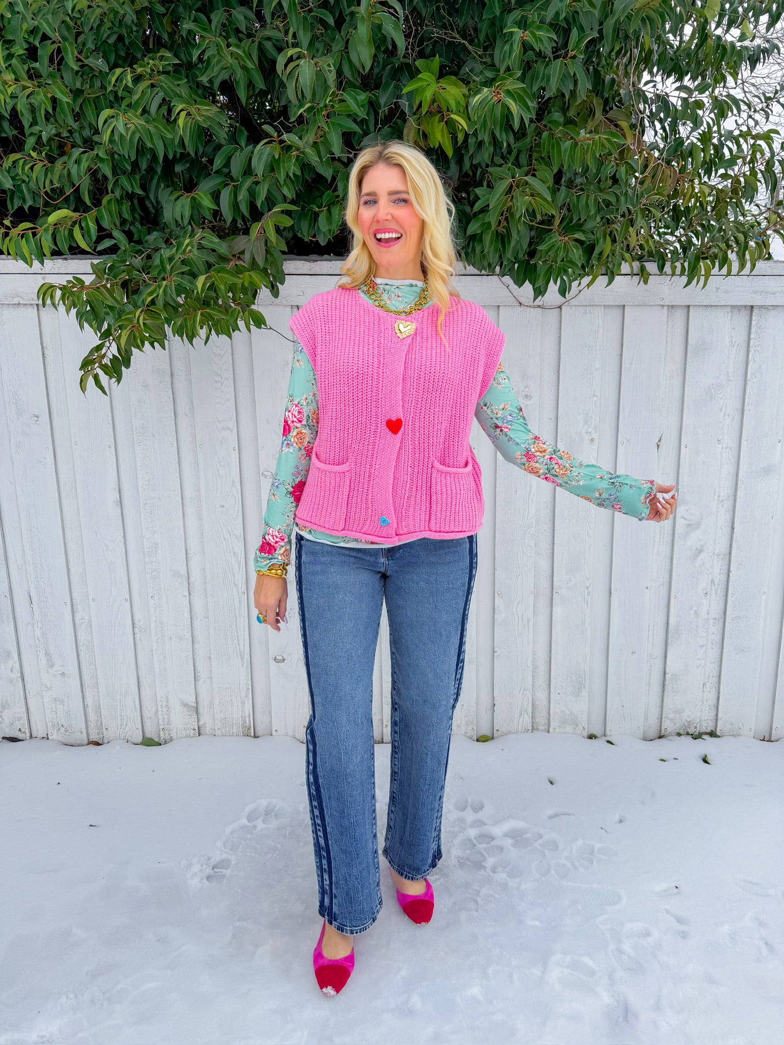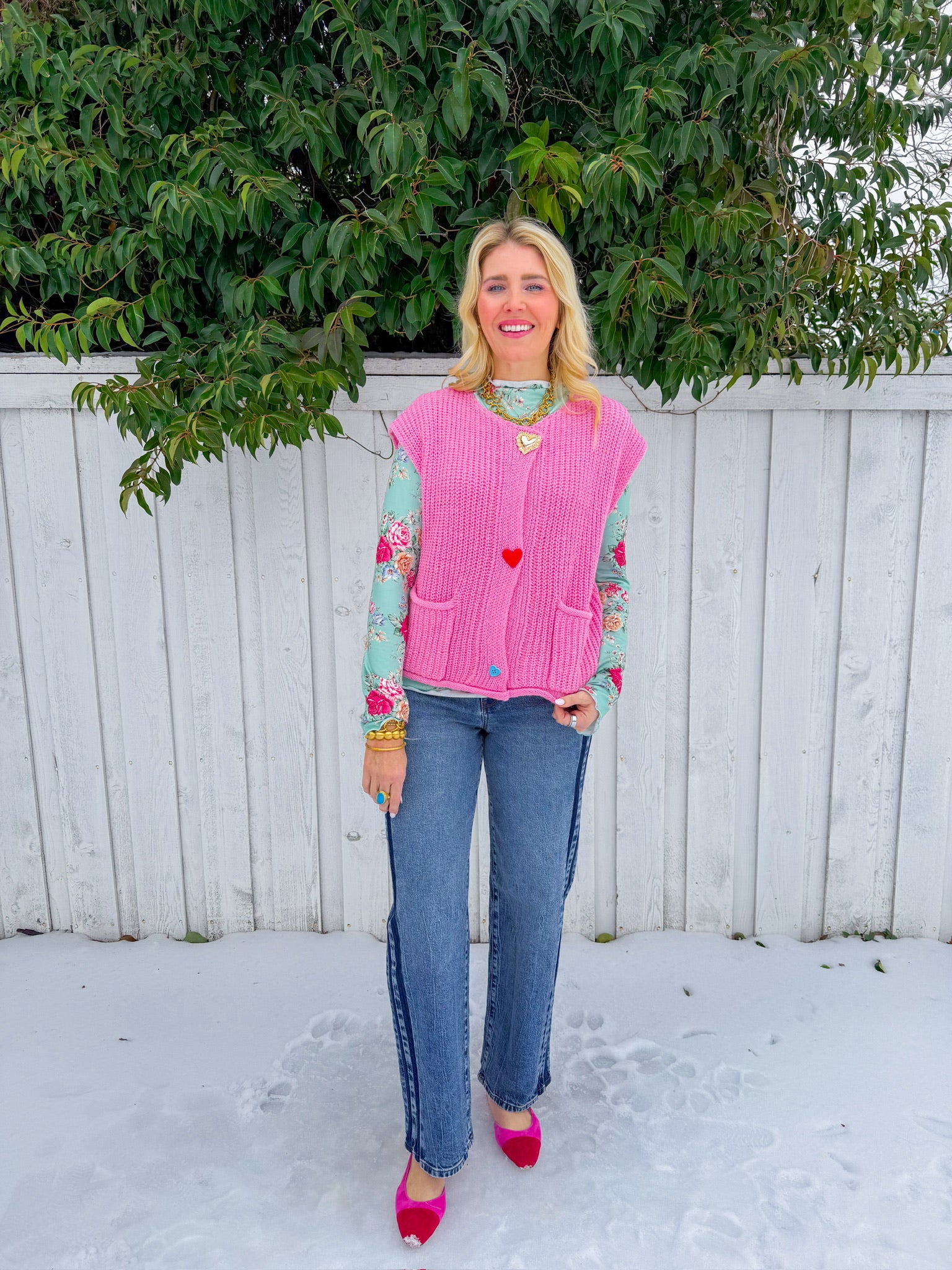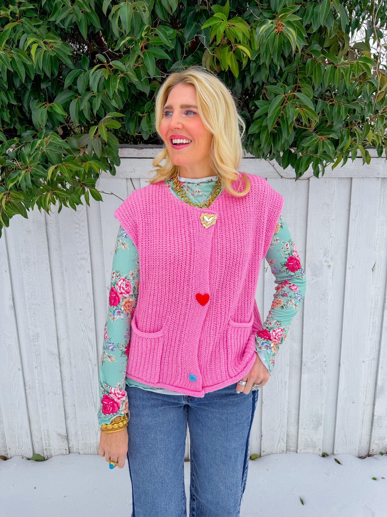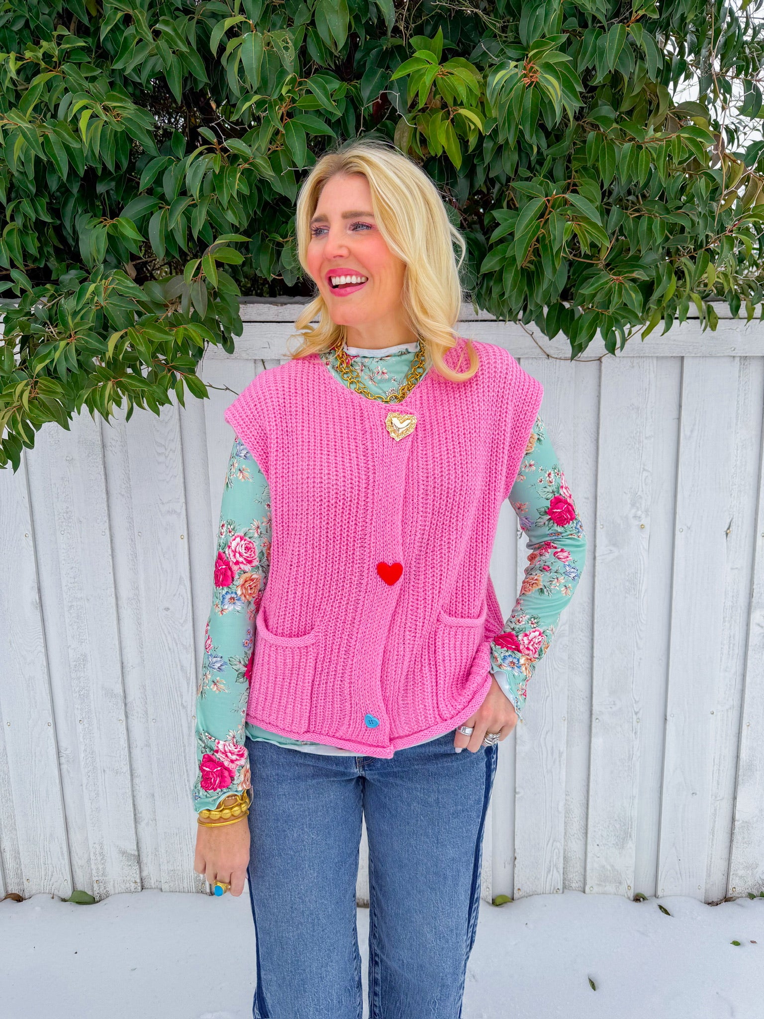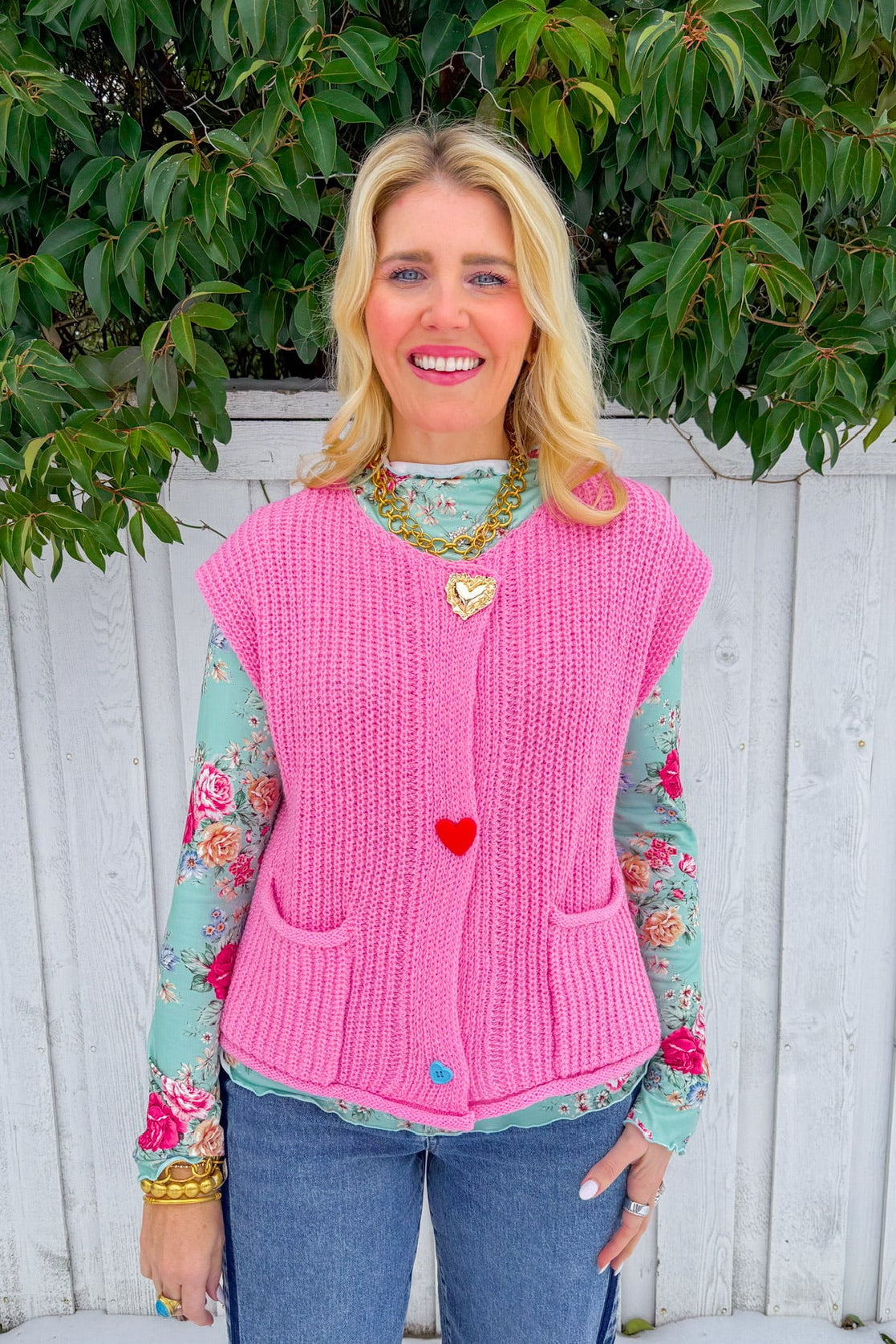 Wear your heart on your sleeve—literally. This light pink knit vest features charming gold heart buttons running down the front, adding a touch of whimsy to any outfit.