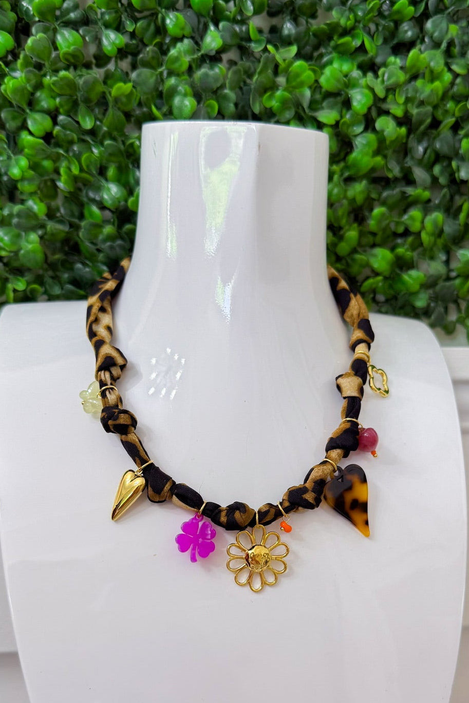 Make a statement with this playful Hearts Flutter Necklace featuring a bold cheetah print charm paired with vibrant purple accents. Perfect for adding a touch of wild style to any outfit, this piece combines trendy animal print with a pop of color that catches the eye. Whether you're dressing up your everyday look or adding flair to a special occasion, this charming necklace brings personality and pizzazz to your jewelry collection.