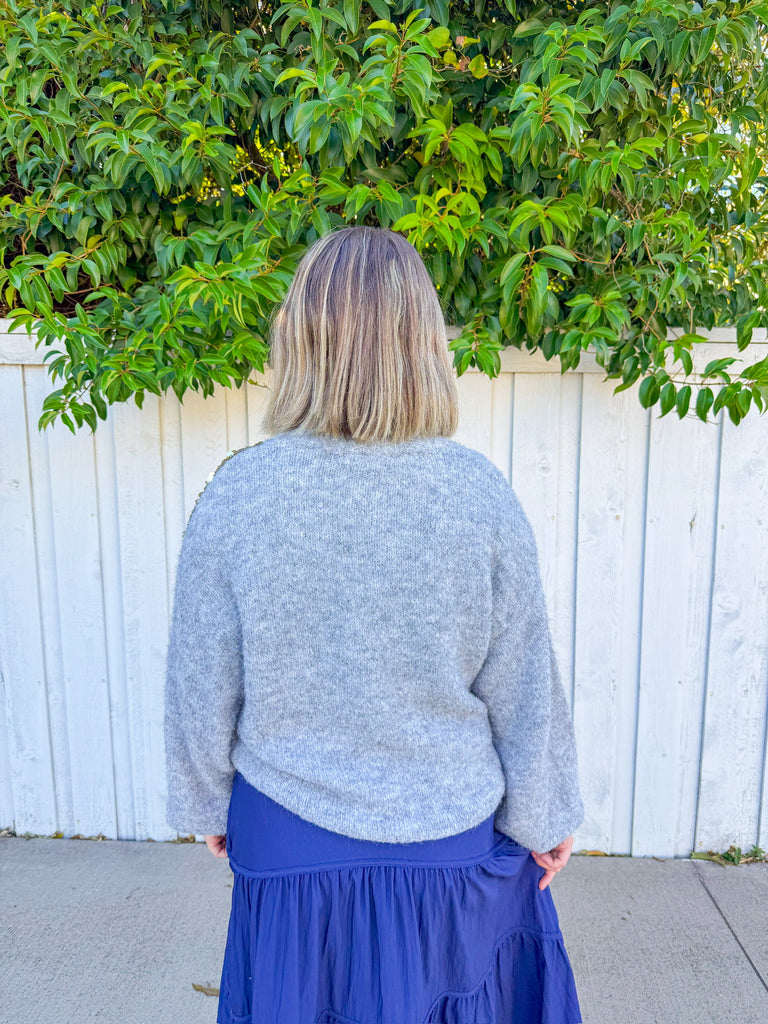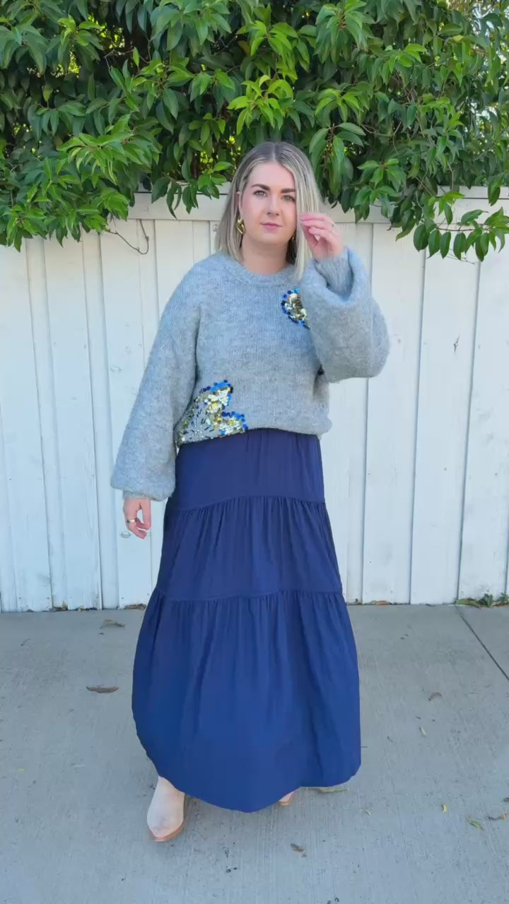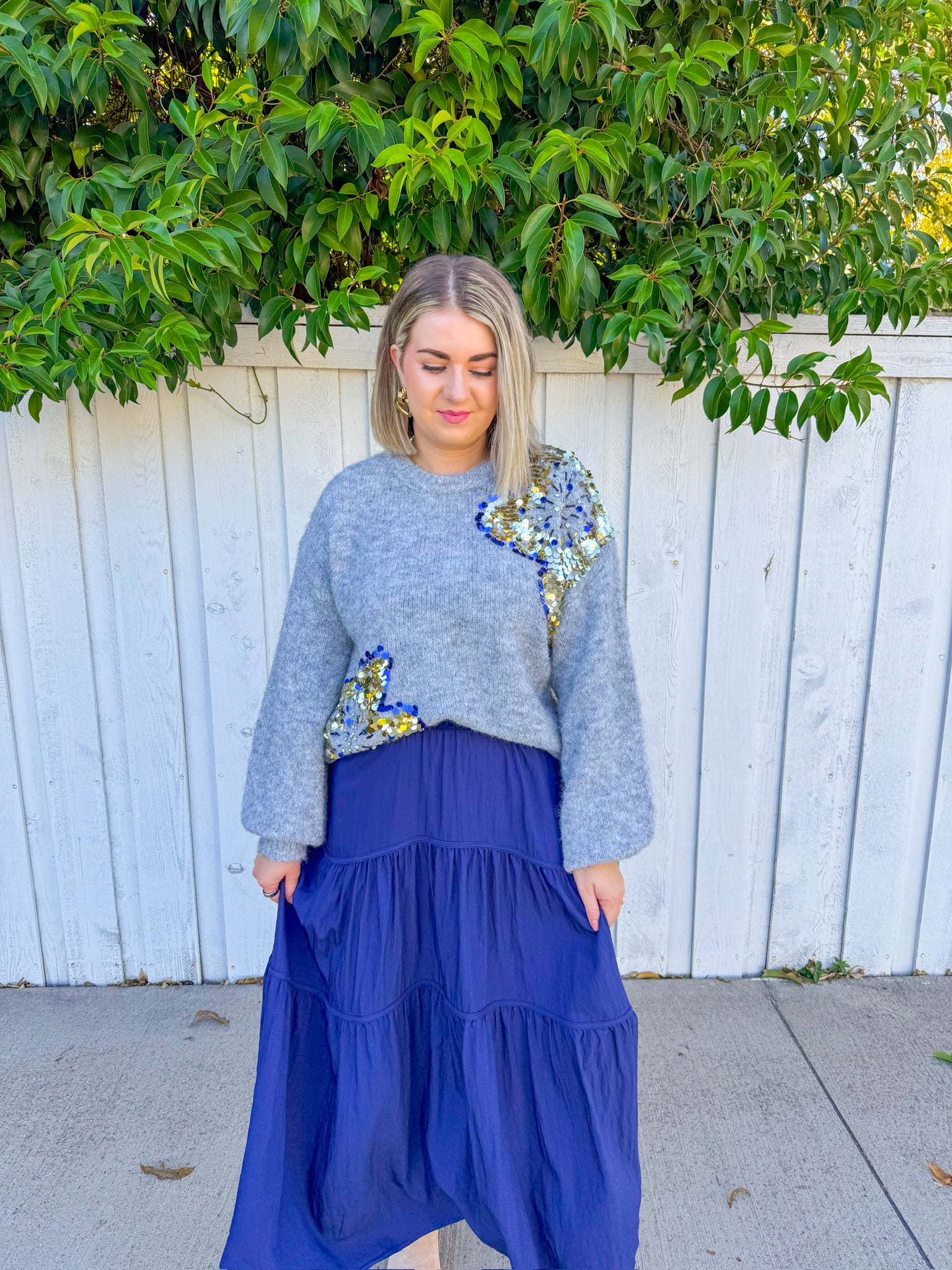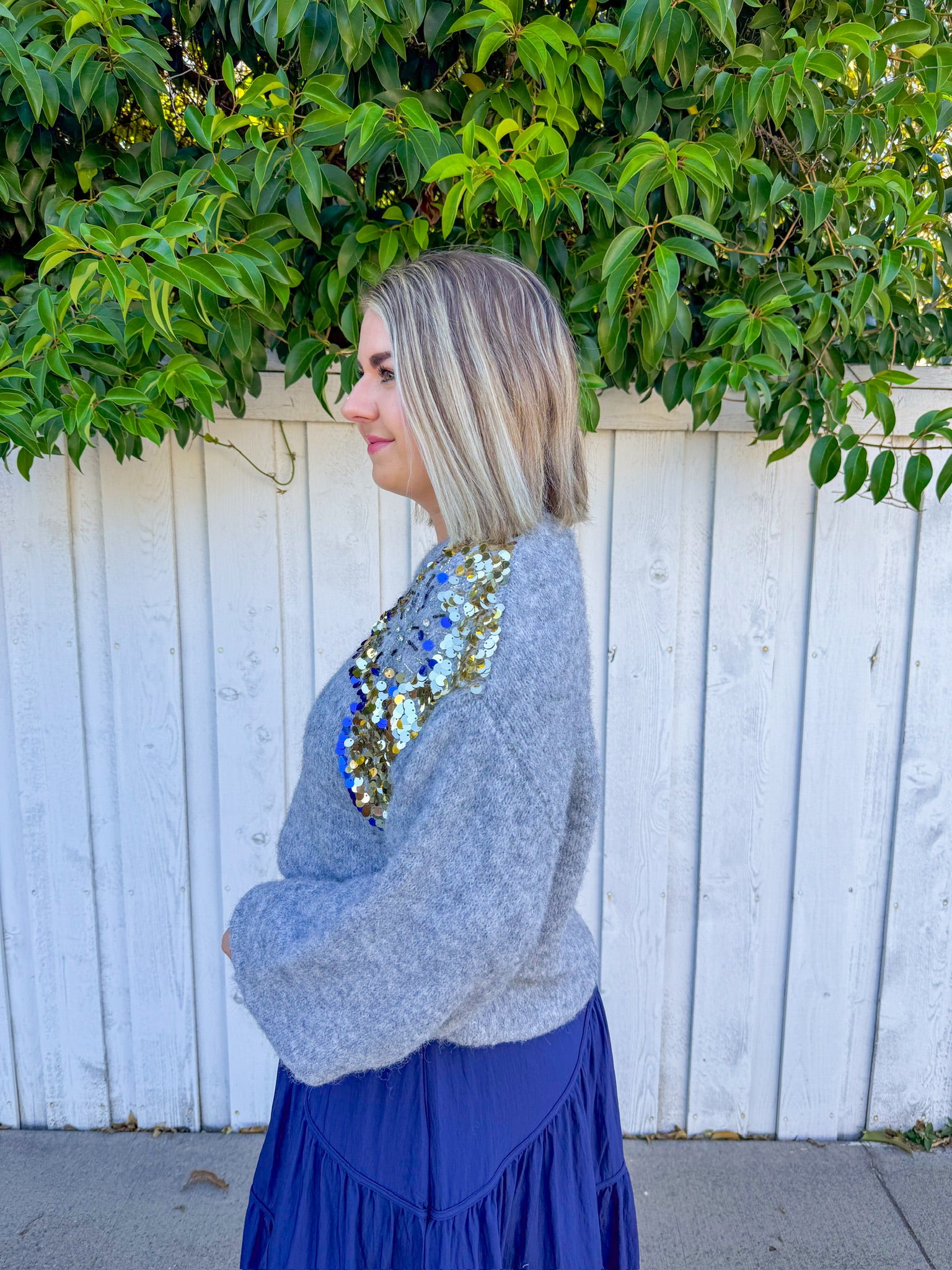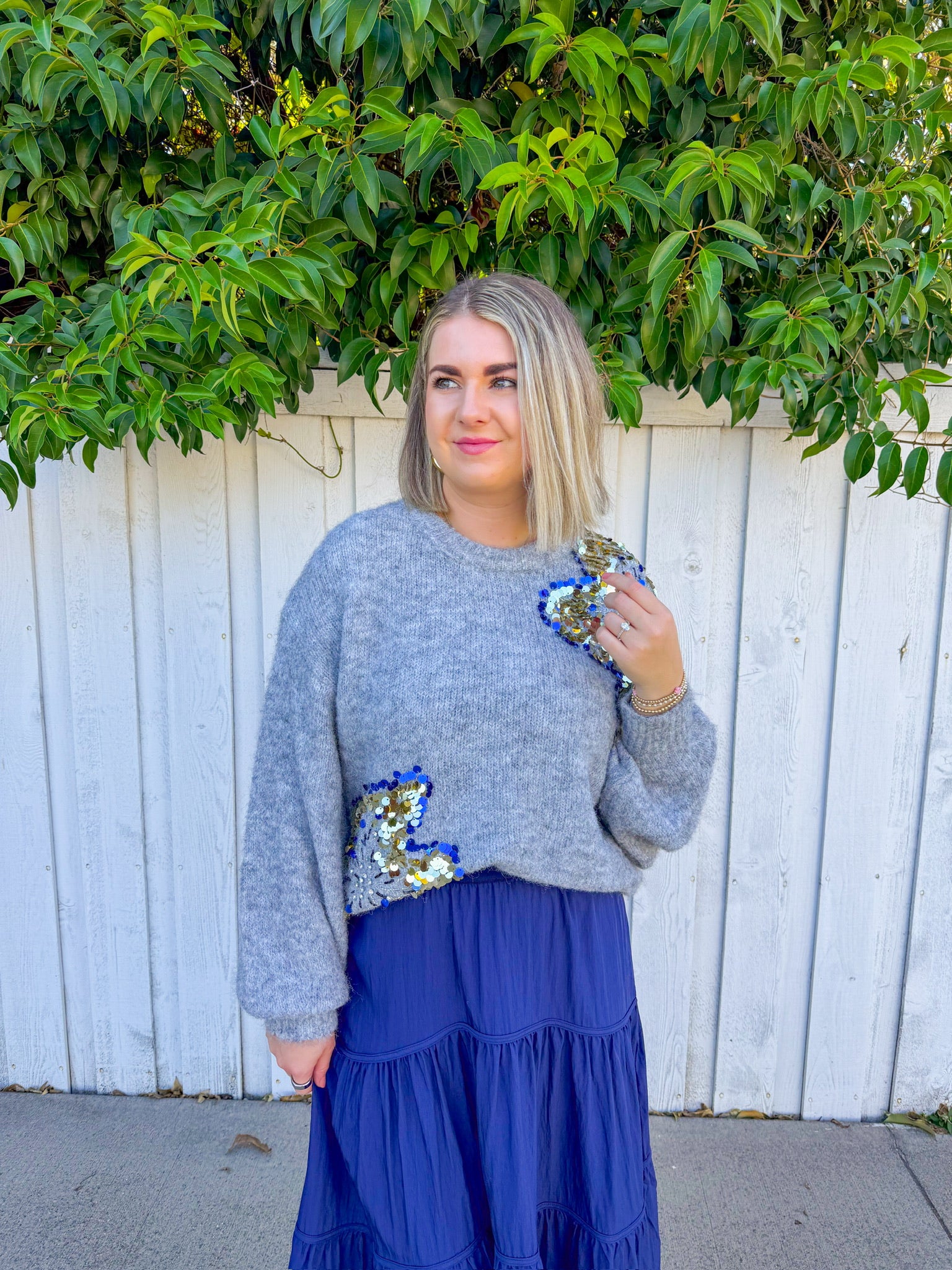 Cozy grey sweater with a playful twist—navy and gold sequin flowers bloom across the shoulder for a touch of sparkle and charm.