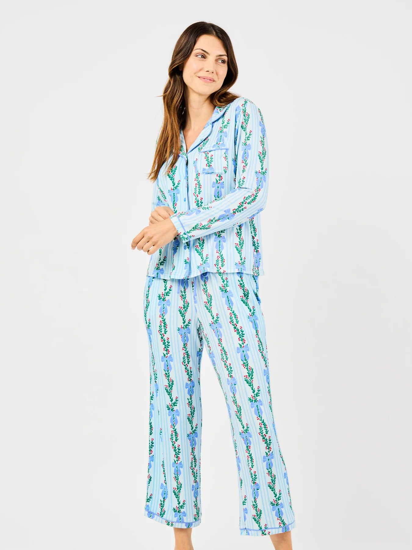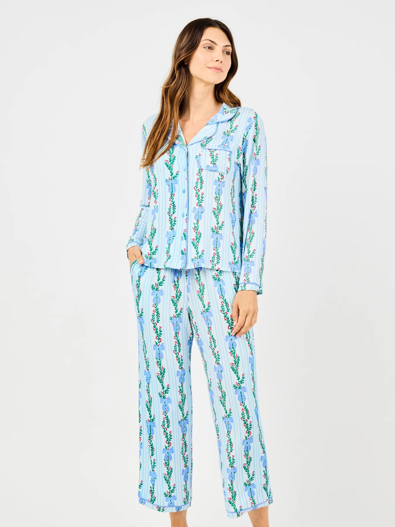 Introducing our Holiday Charlotte Pajama Set, where comfort meets festive charm. Perfect for sipping cocoa by the tree or enjoying Christmas morning in cozy style, this pajama set brings holiday cheer to every moment. Featuring a long-sleeve button-front top with a classic collar and straight-leg pants with an adjustable drawstring, our Charlotte Pajama Set combines classic holiday style with all-day comfort.