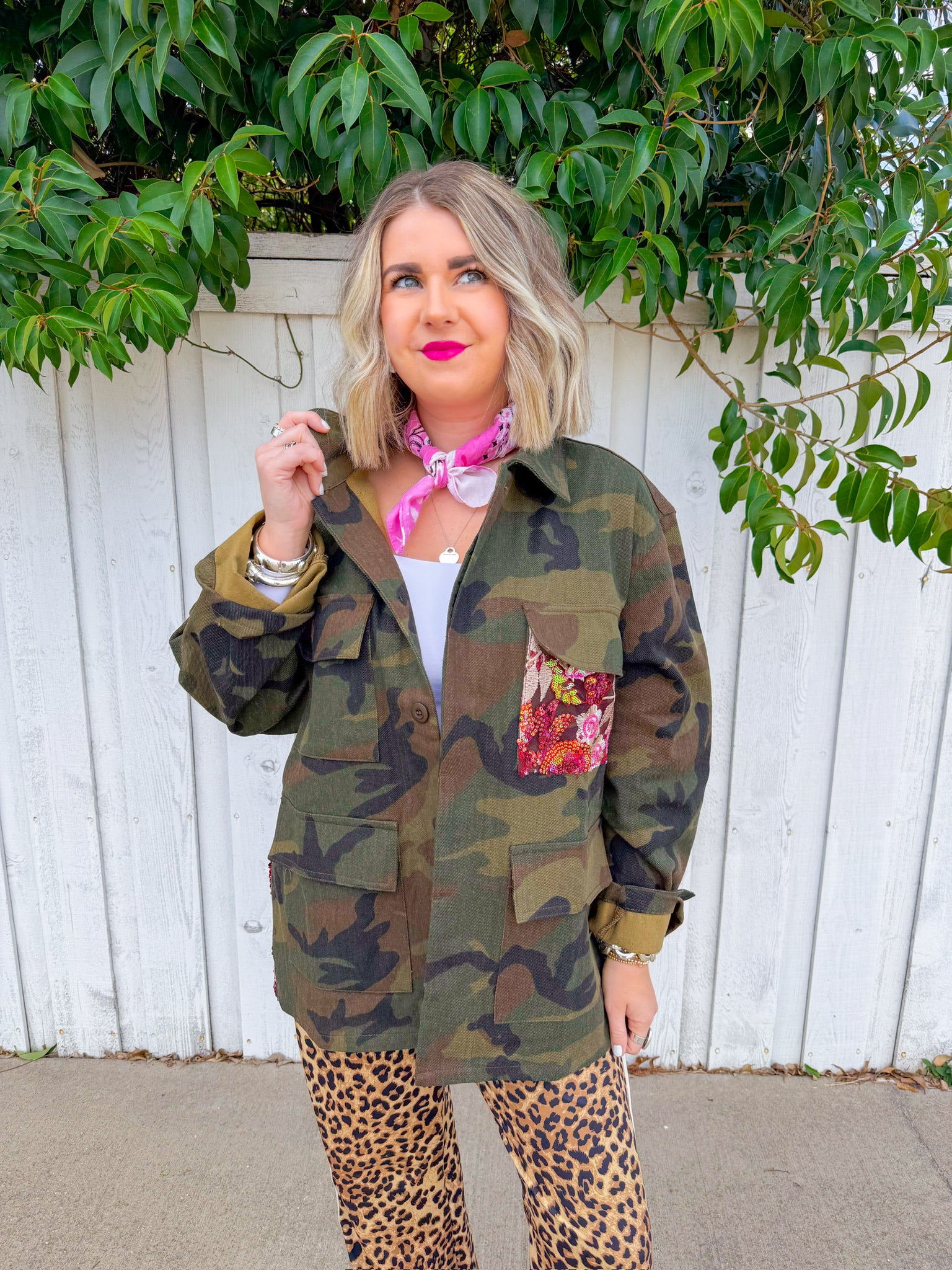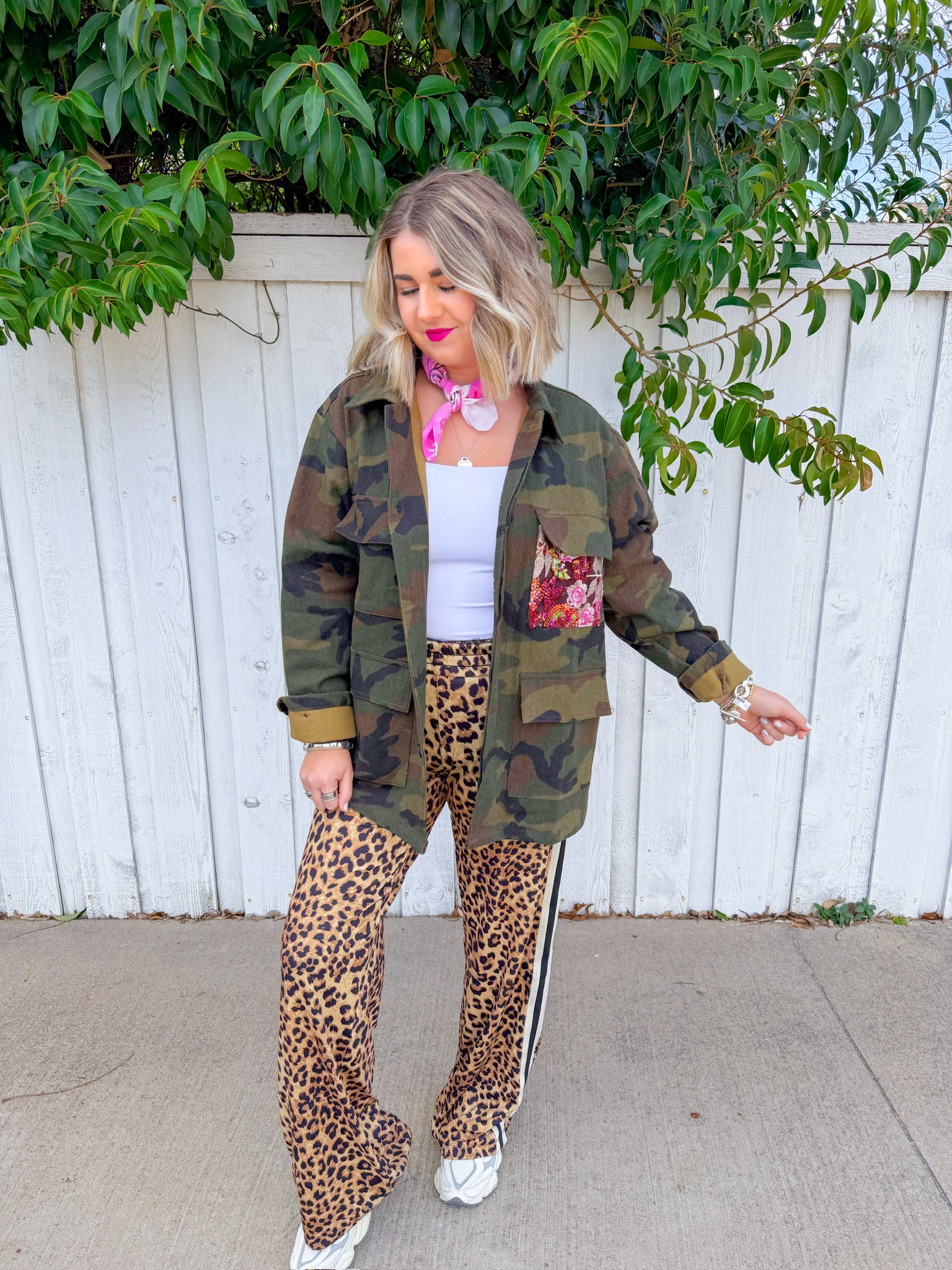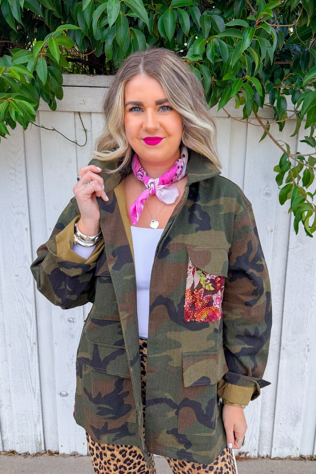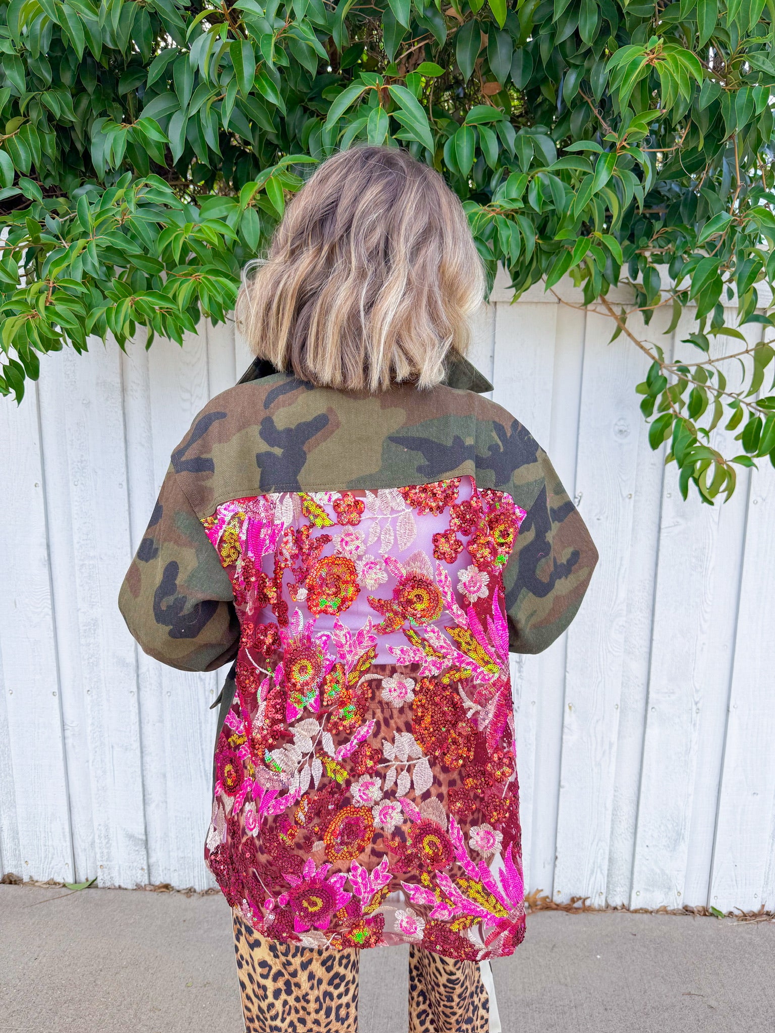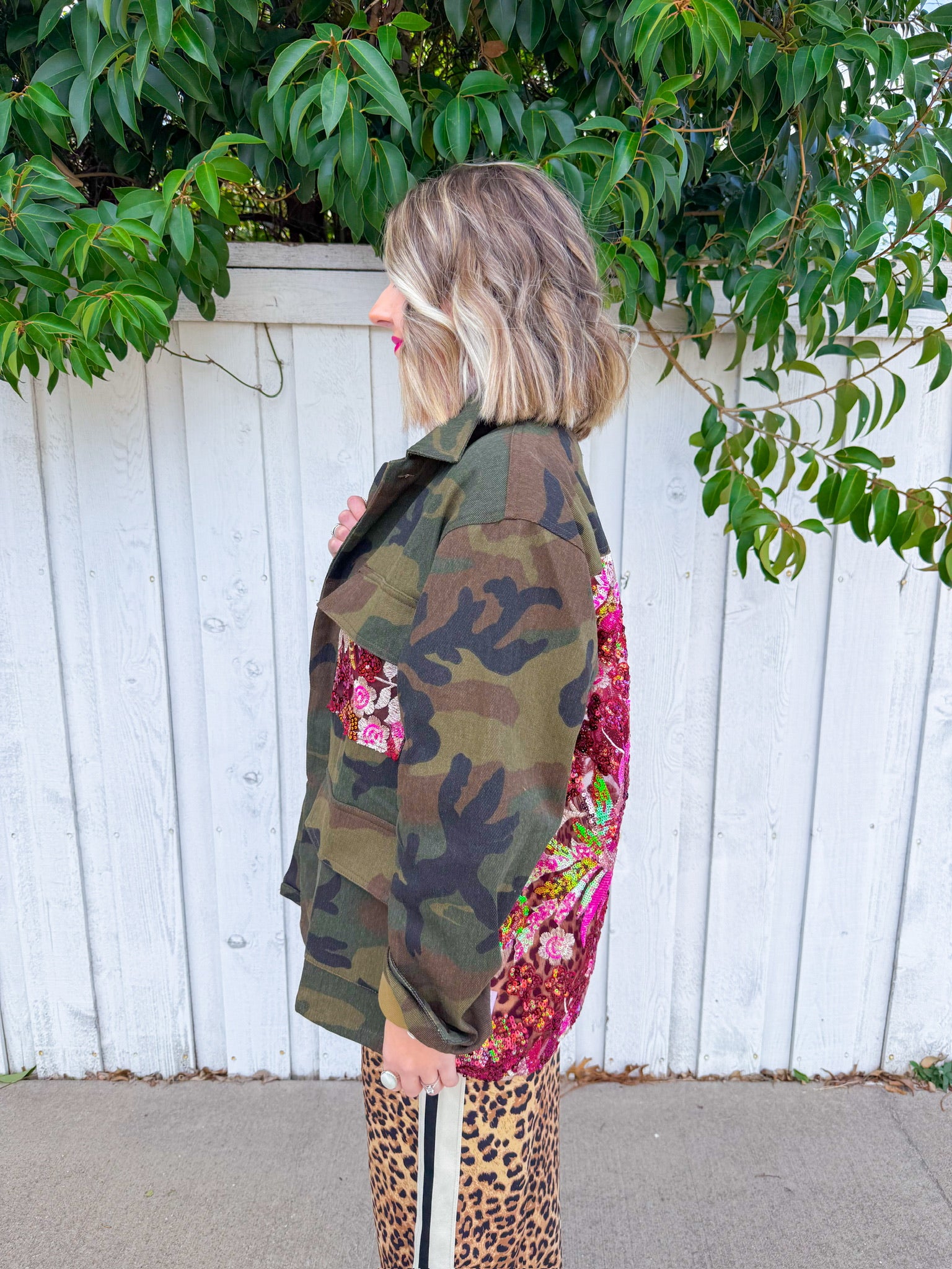 This playful piece features a classic camouflage front that keeps things cool and collected, while the back reveals a stunning surprise: delicate flower-patterned sequins that catch the light with every move.