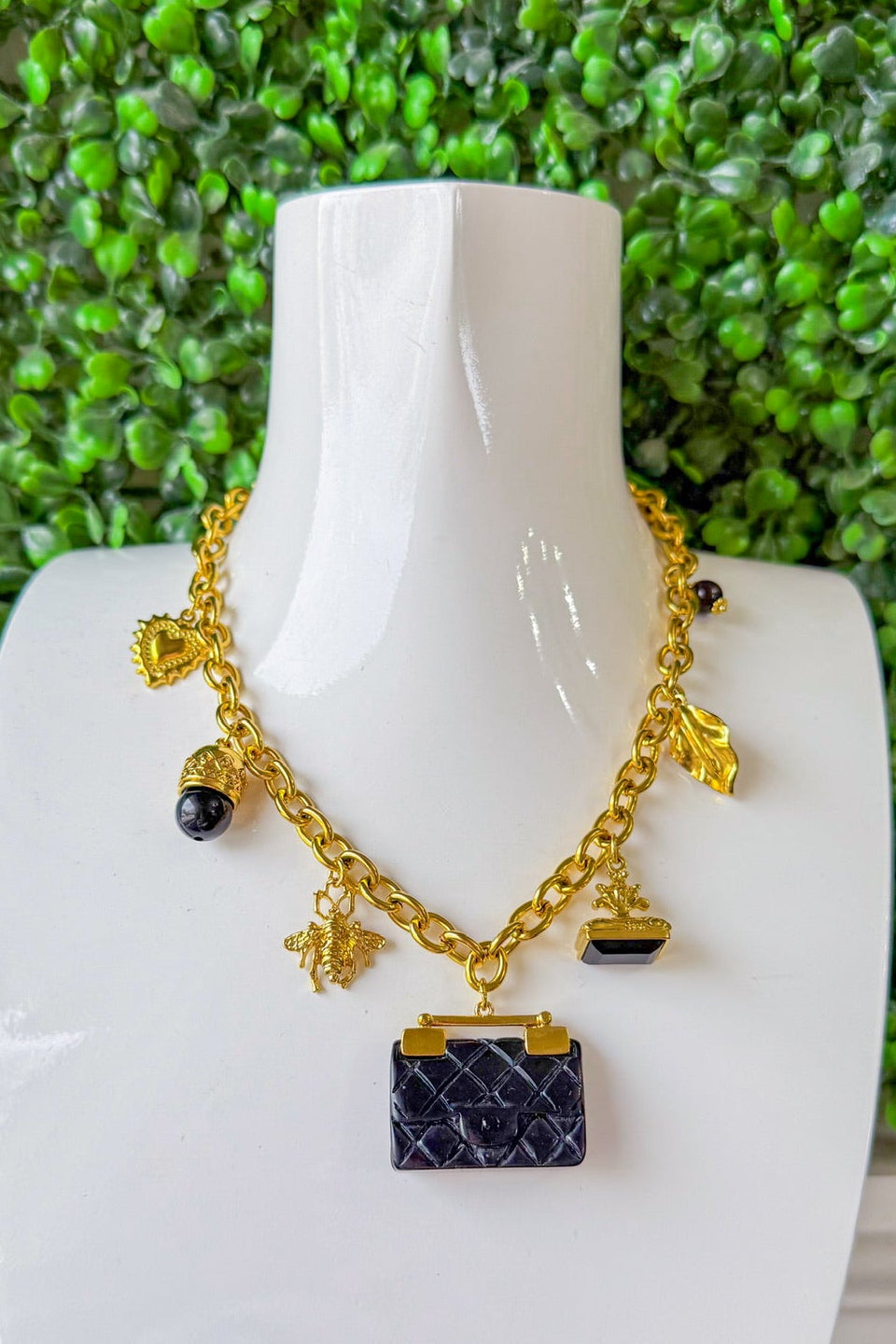 Elevate your everyday look with this chic charm necklace featuring a striking black purse charm at its center.