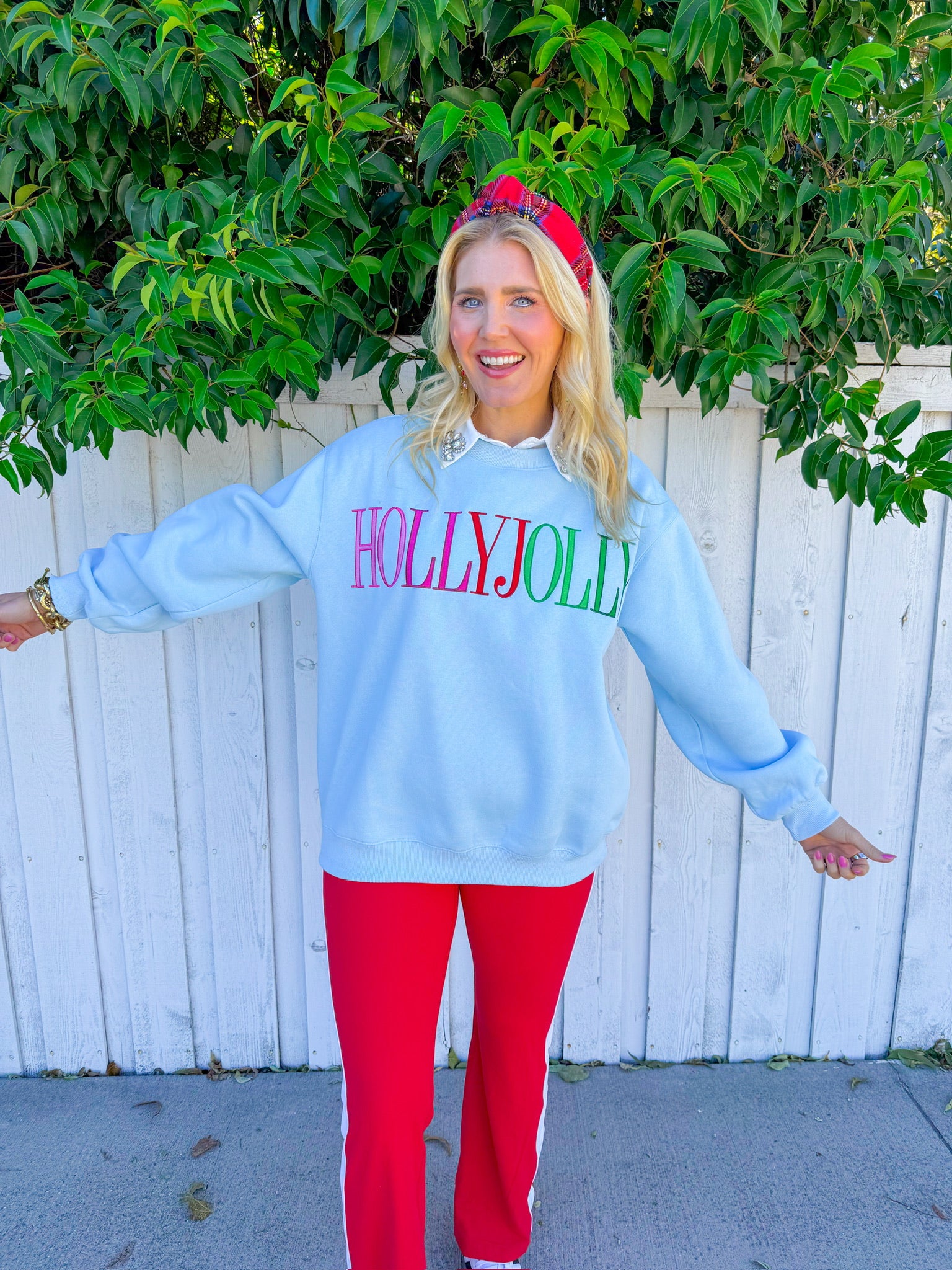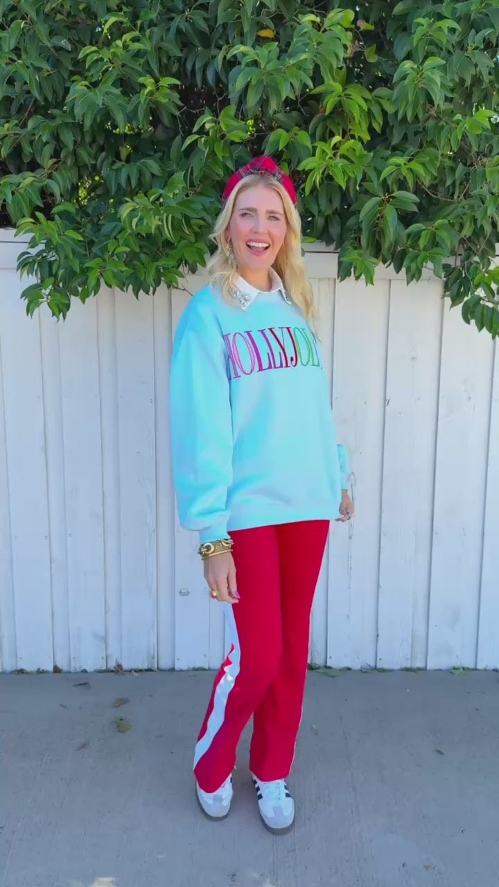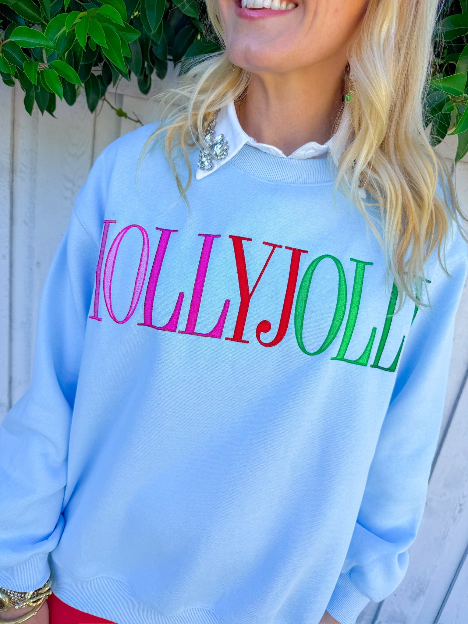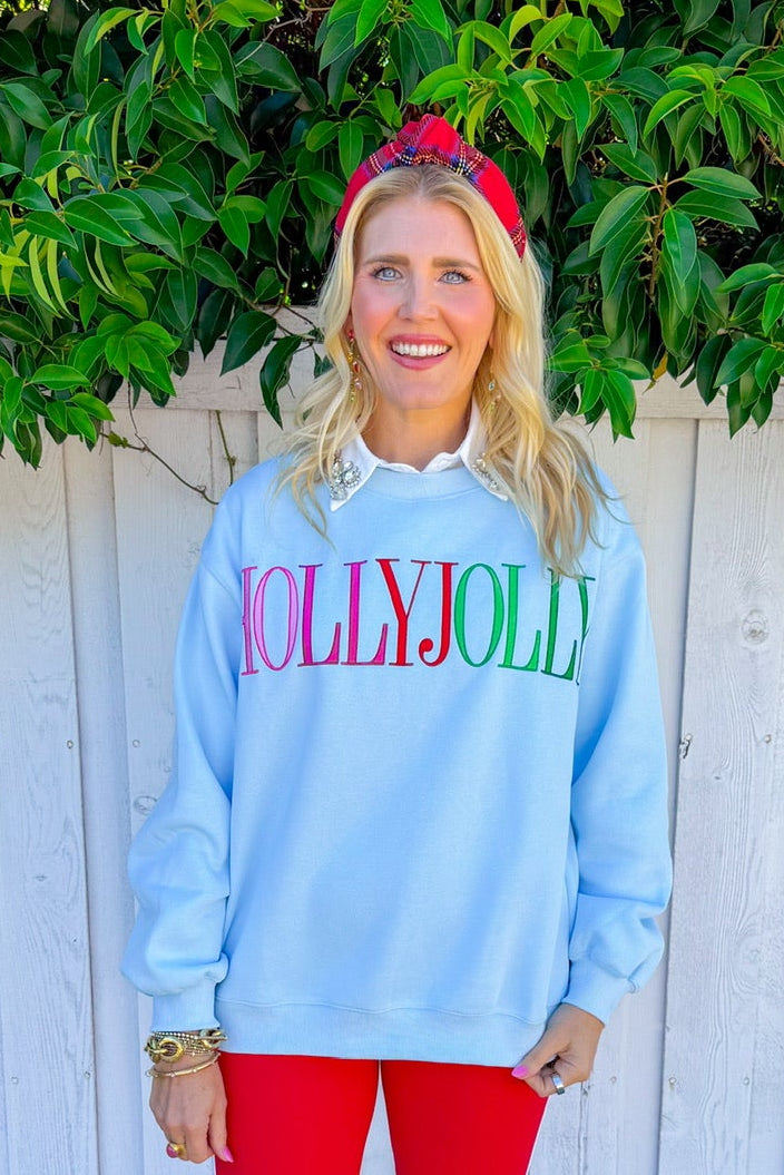Spread holiday cheer in this cheerful powder blue sweatshirt featuring "Holly Jolly" across the front in vibrant red, pink, and green lettering. The soft, comfortable fit makes it an instant wardrobe favorite that pairs effortlessly with your favorite jeans or leggings.