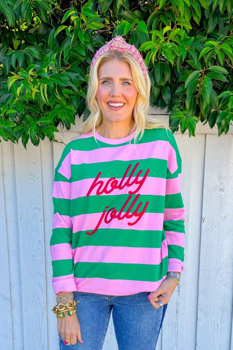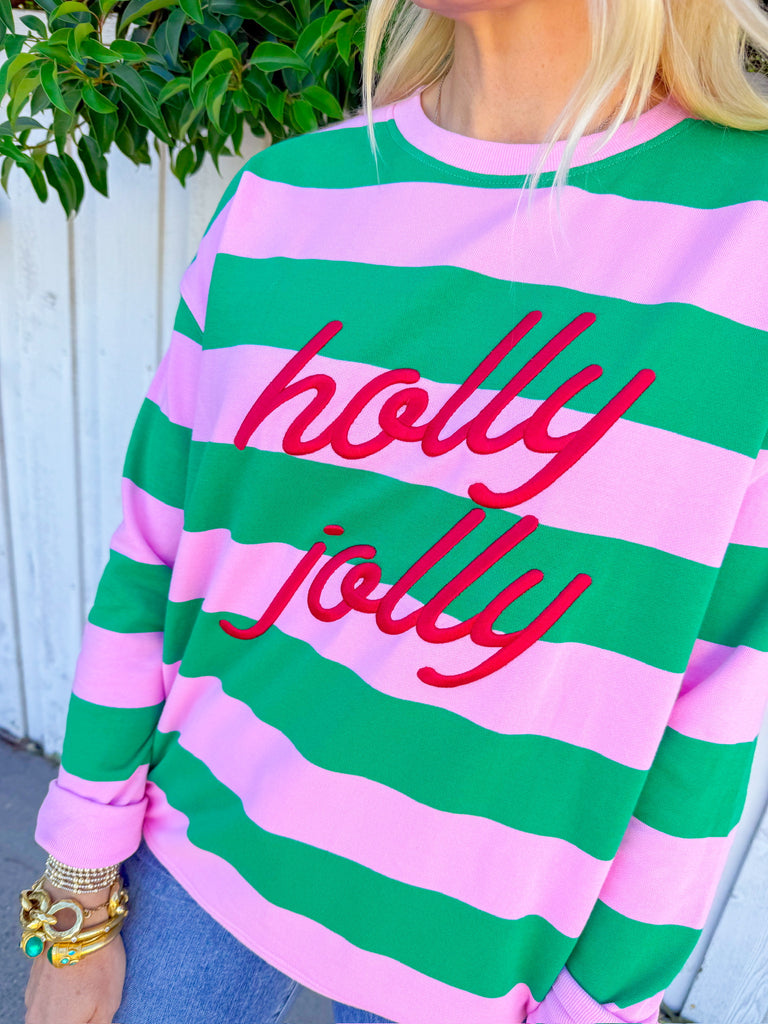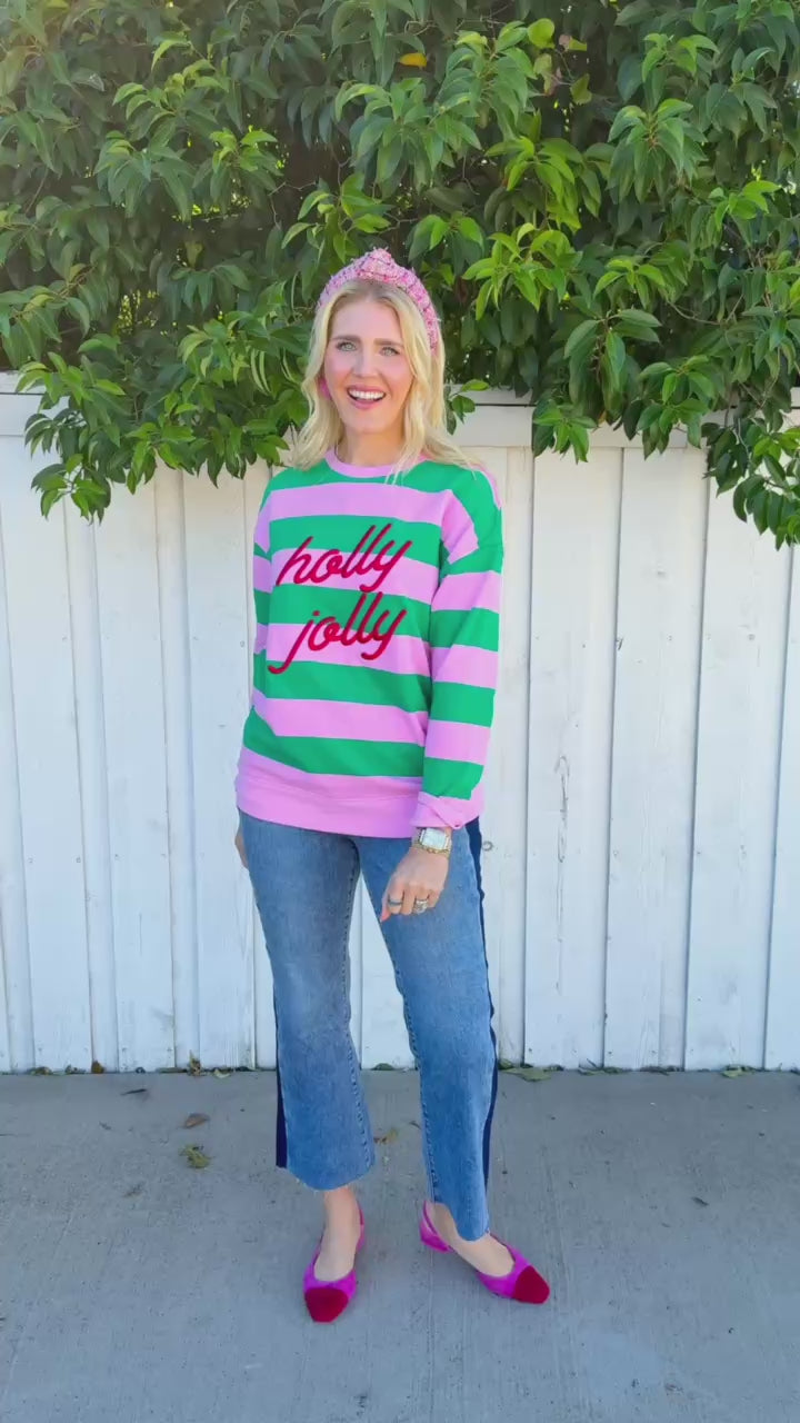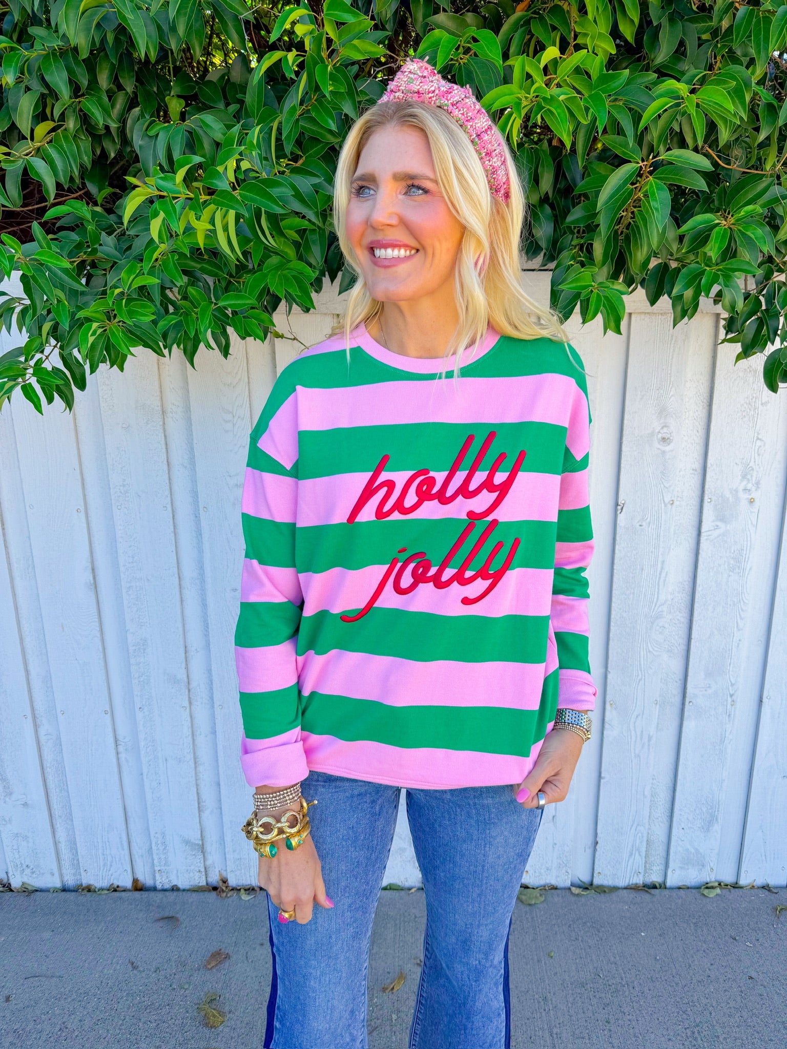 Get ready to jingle all the way in this vibrant Holly Jolly Sweater! Bright red lettering dances across a cheerful backdrop of pink and green stripes, creating a look that's impossible to miss.