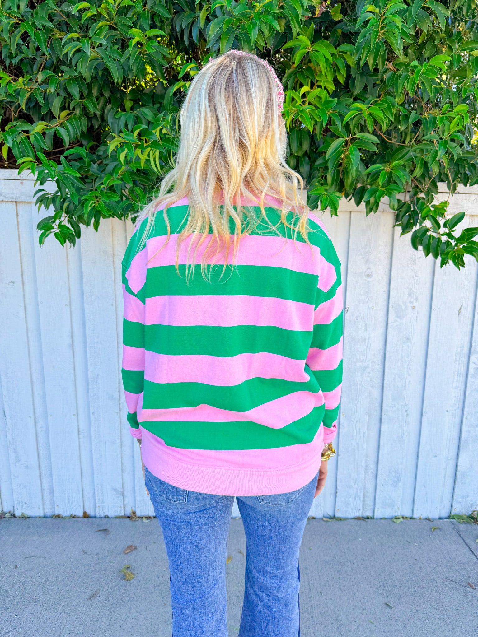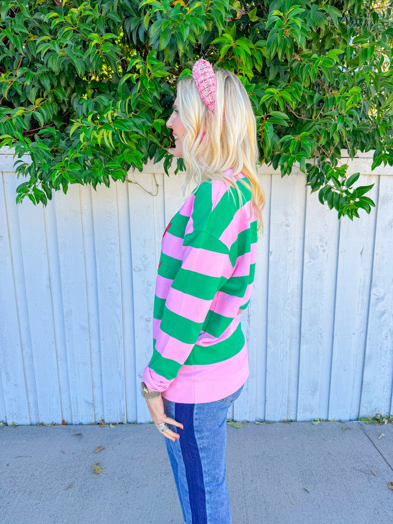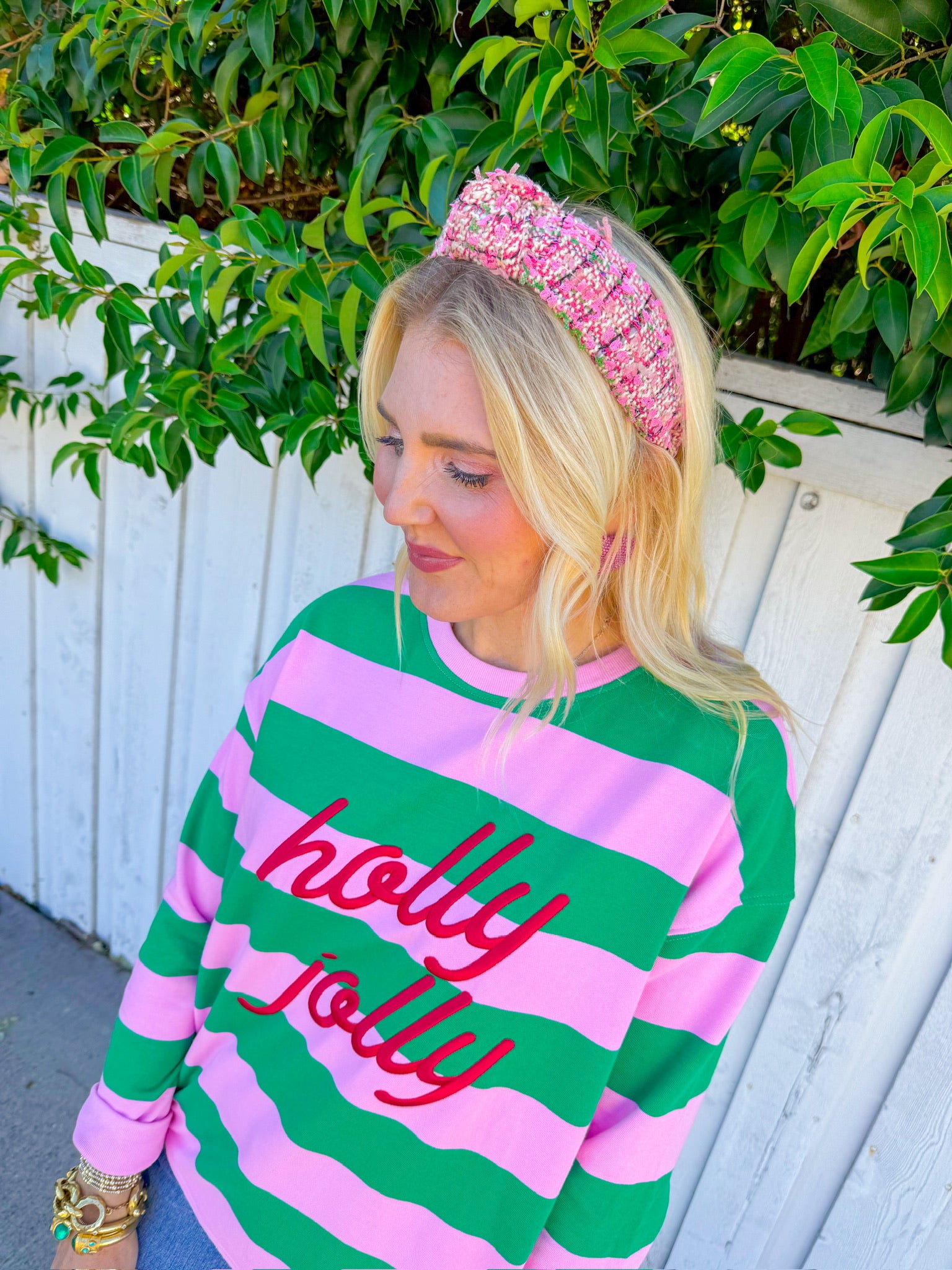 Get ready to jingle all the way in this vibrant Holly Jolly Sweater! Bright red lettering dances across a cheerful backdrop of pink and green stripes, creating a look that's impossible to miss.