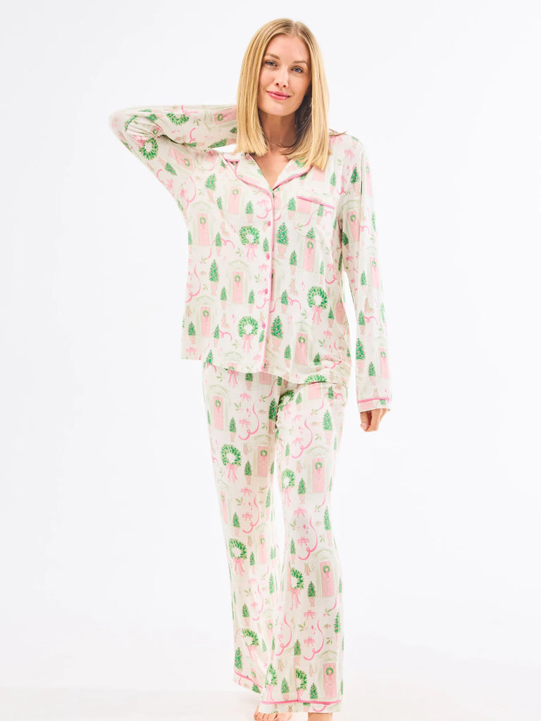 Introducing our Holiday Charlotte Pajama Set, where comfort meets festive charm. Perfect for sipping cocoa by the tree or enjoying Christmas morning in cozy style, this pajama set brings holiday cheer to every moment. Featuring a long-sleeve button-front top with a classic collar and straight-leg pants with an adjustable drawstring, our Charlotte Pajama Set combines classic holiday style with all-day comfort.