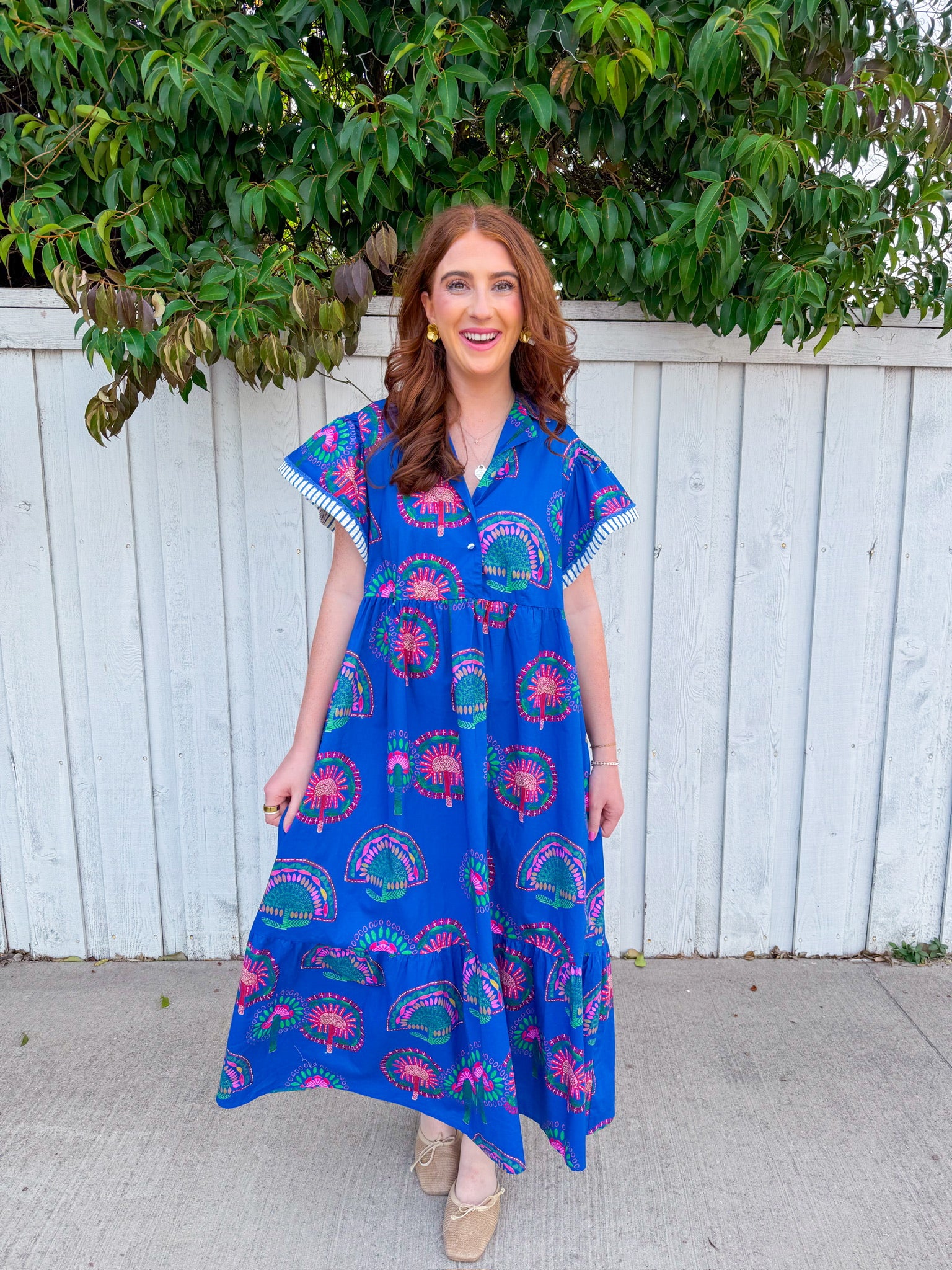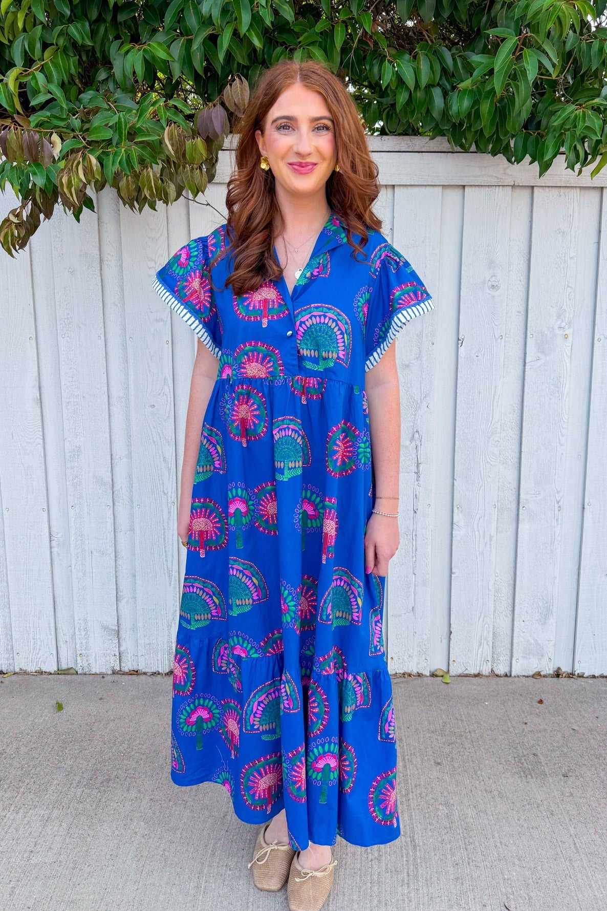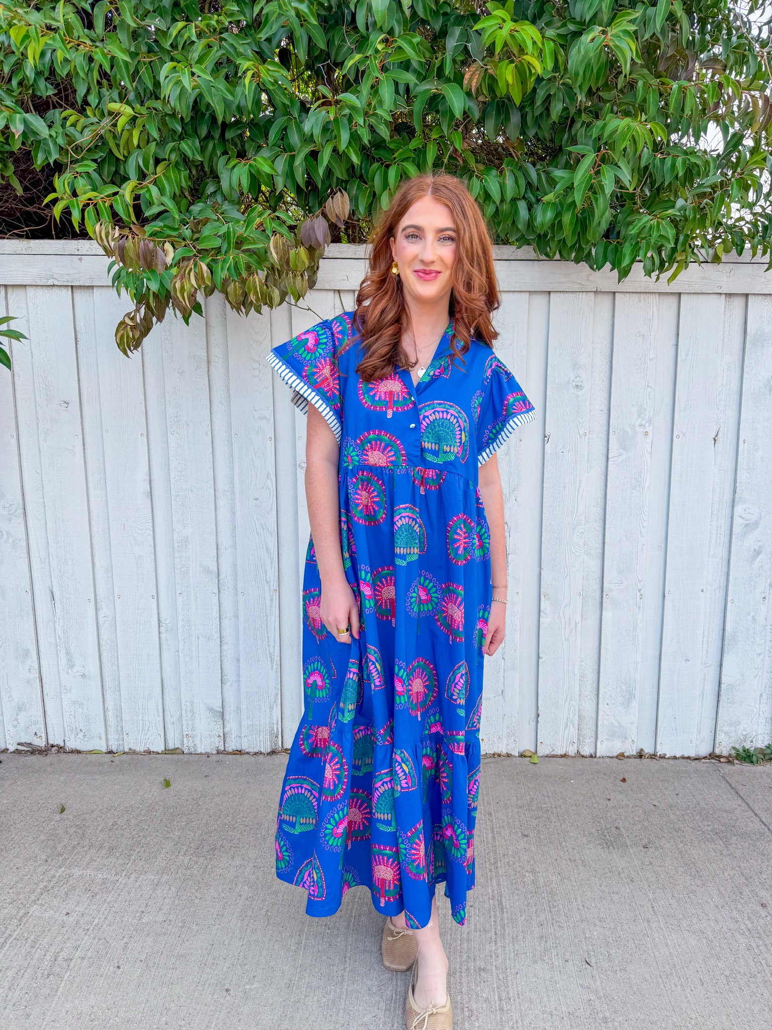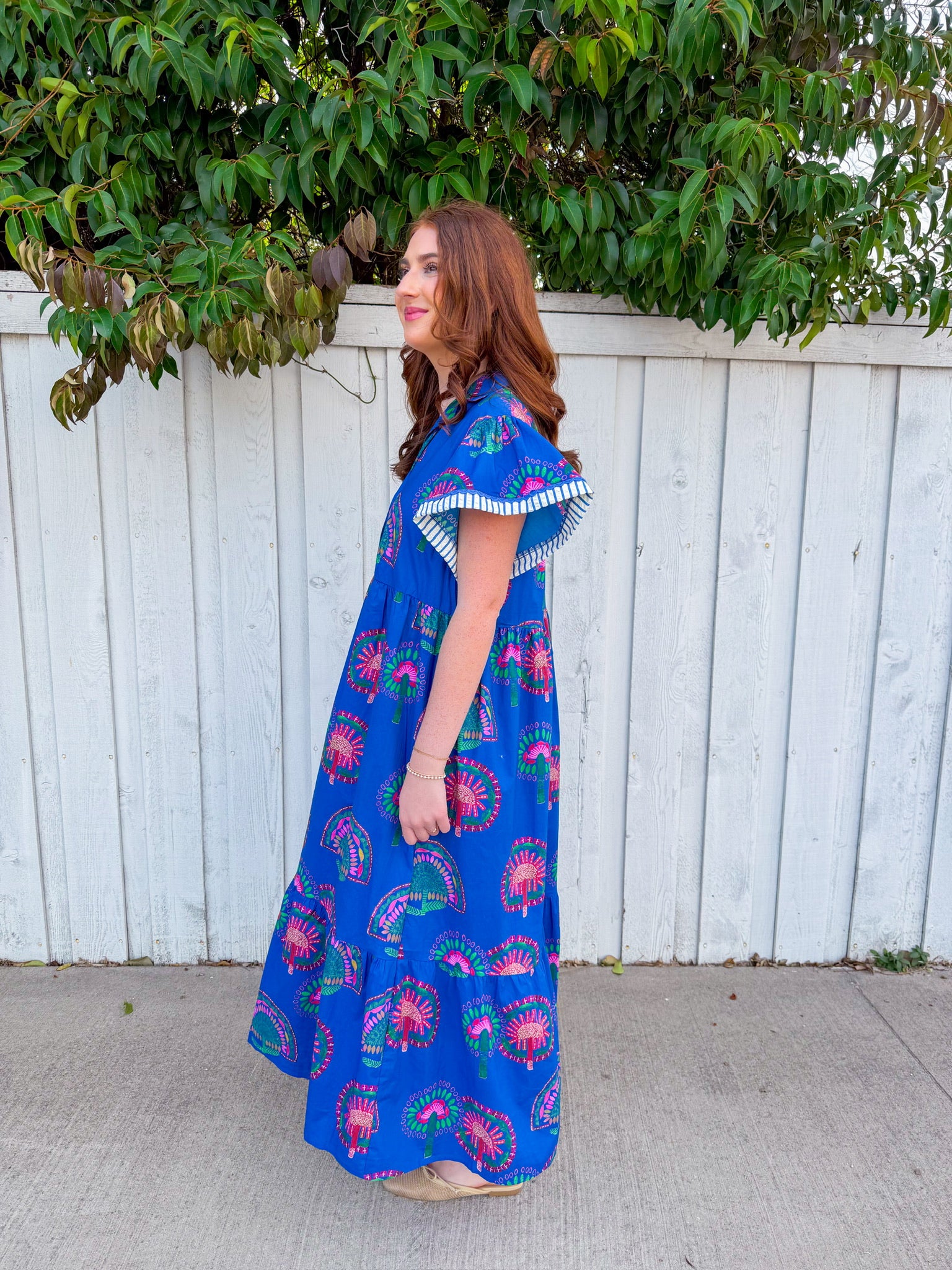 Escape to paradise in this vibrant blue midi dress, adorned with a charming pattern that captures the spirit of sun-soaked getaways.