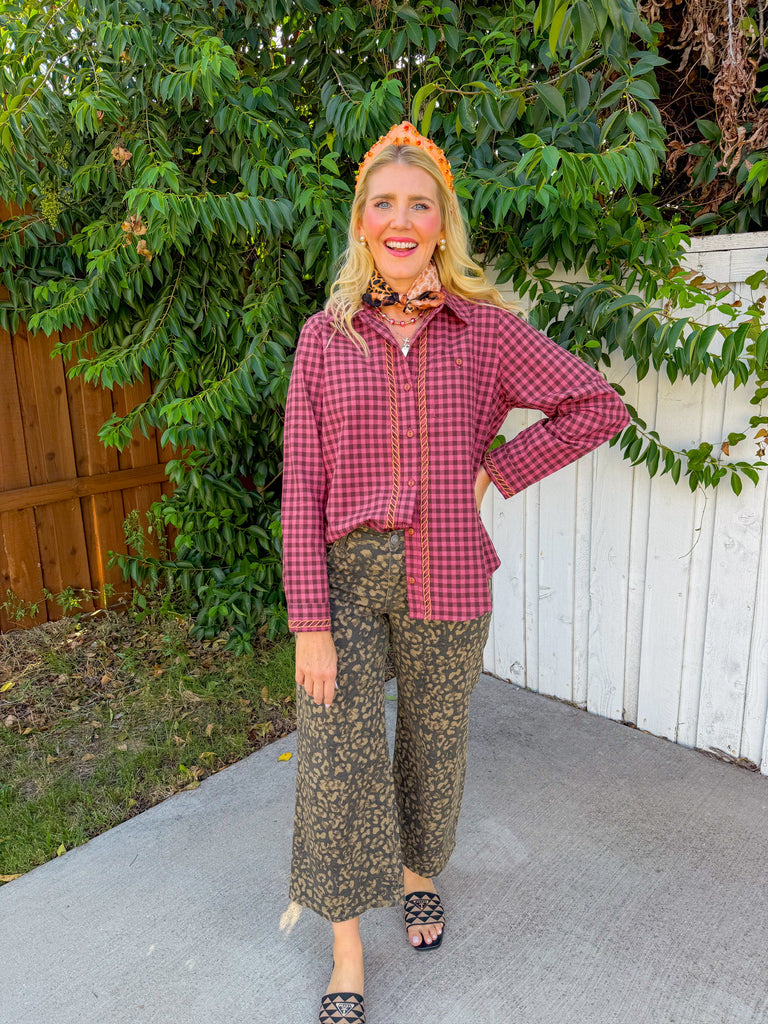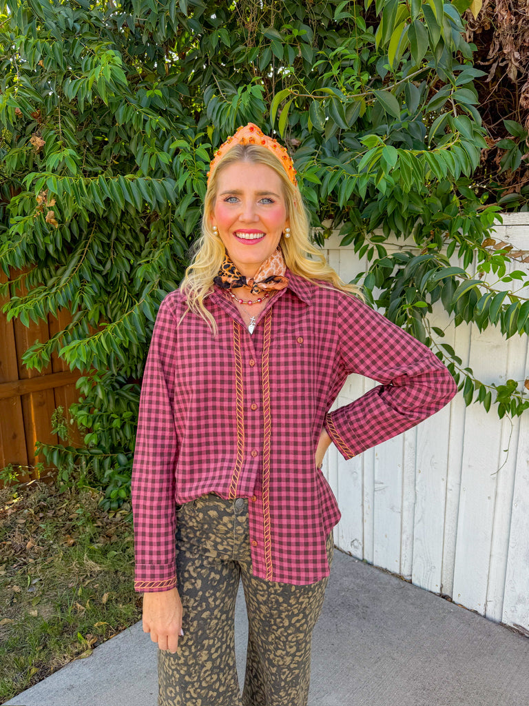 This red-and-brown checkered button-down gives classic flannel vibes with a playful twist, thanks to the golden rope-like embroidery that trims the front placket and cuffs.