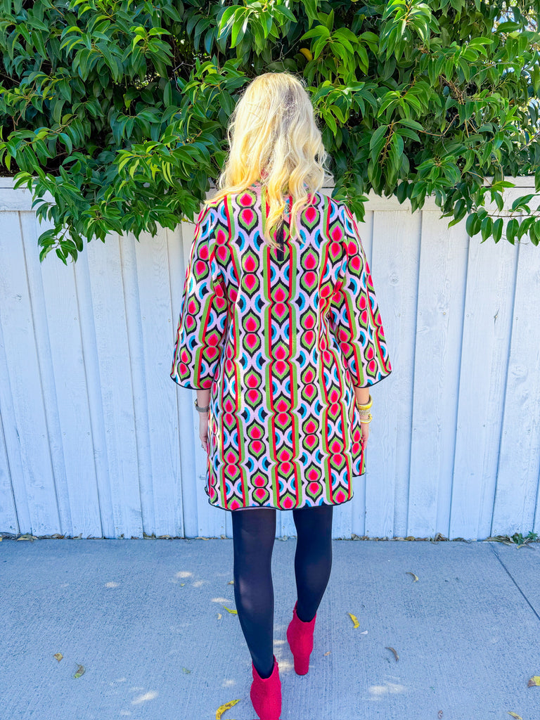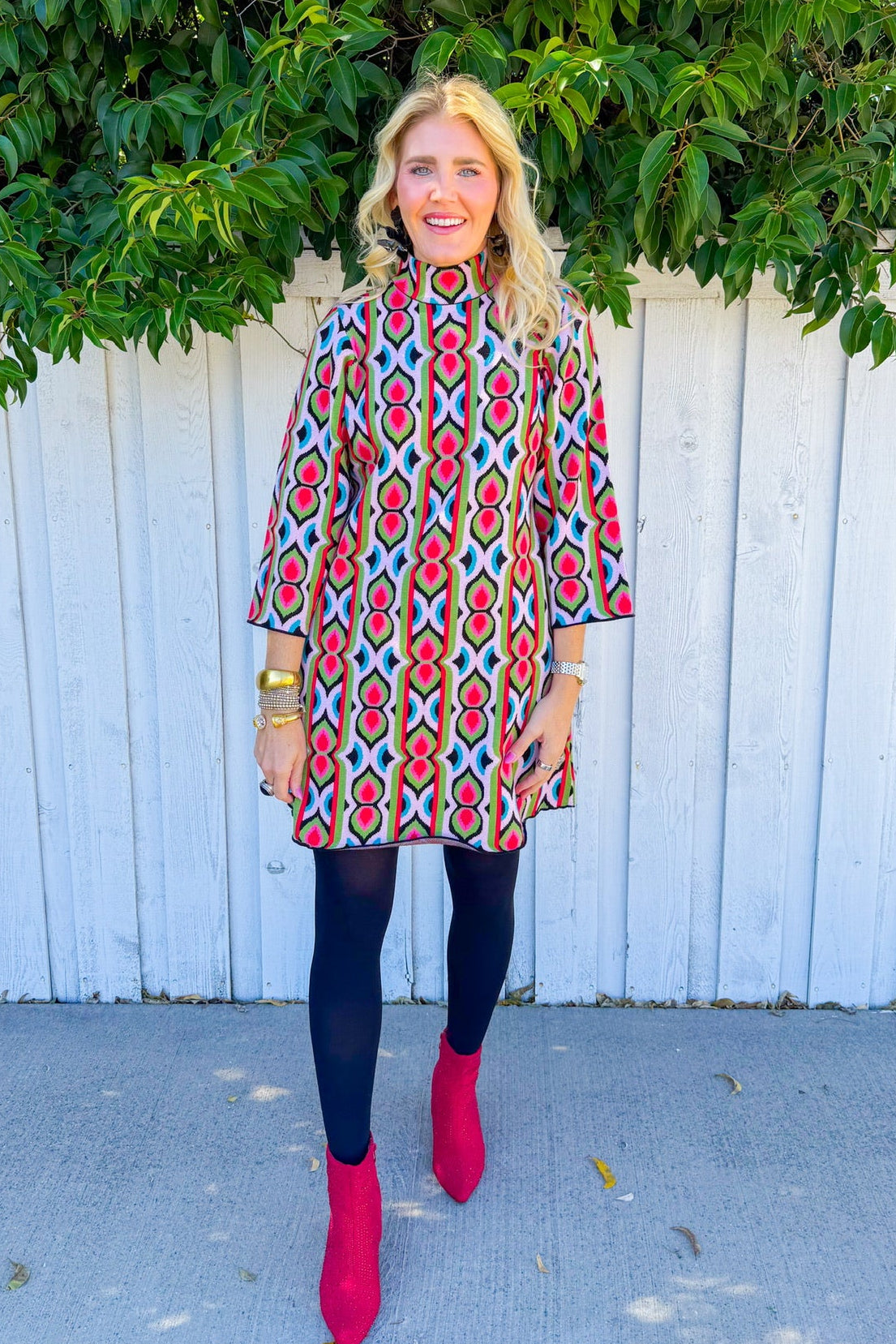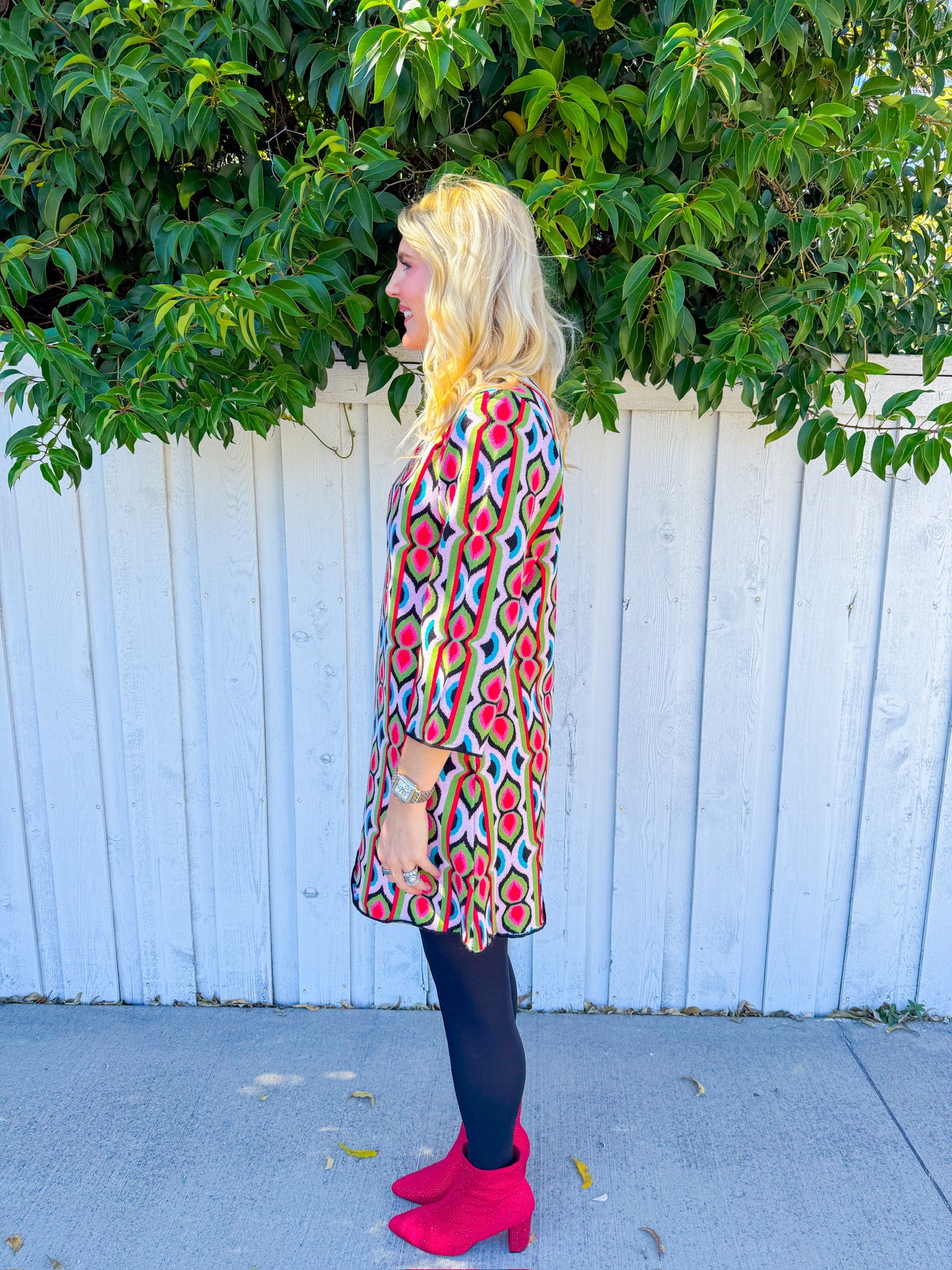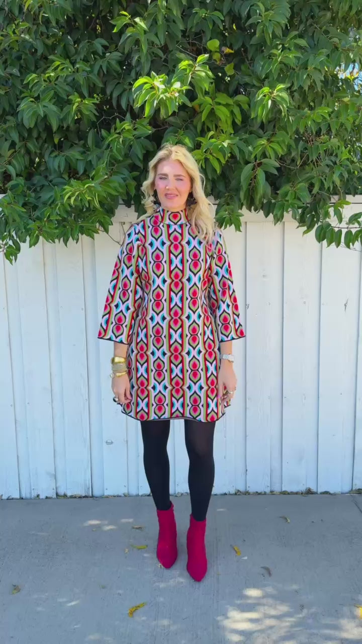 Mesmerize in this abstract knit mini dress, where bold, swirling colors dance across a cozy sweater-knit fabric. The playful multicolor pattern keeps things fresh and fun, while the mini silhouette offers effortless style for casual outings or dressed-up moments.