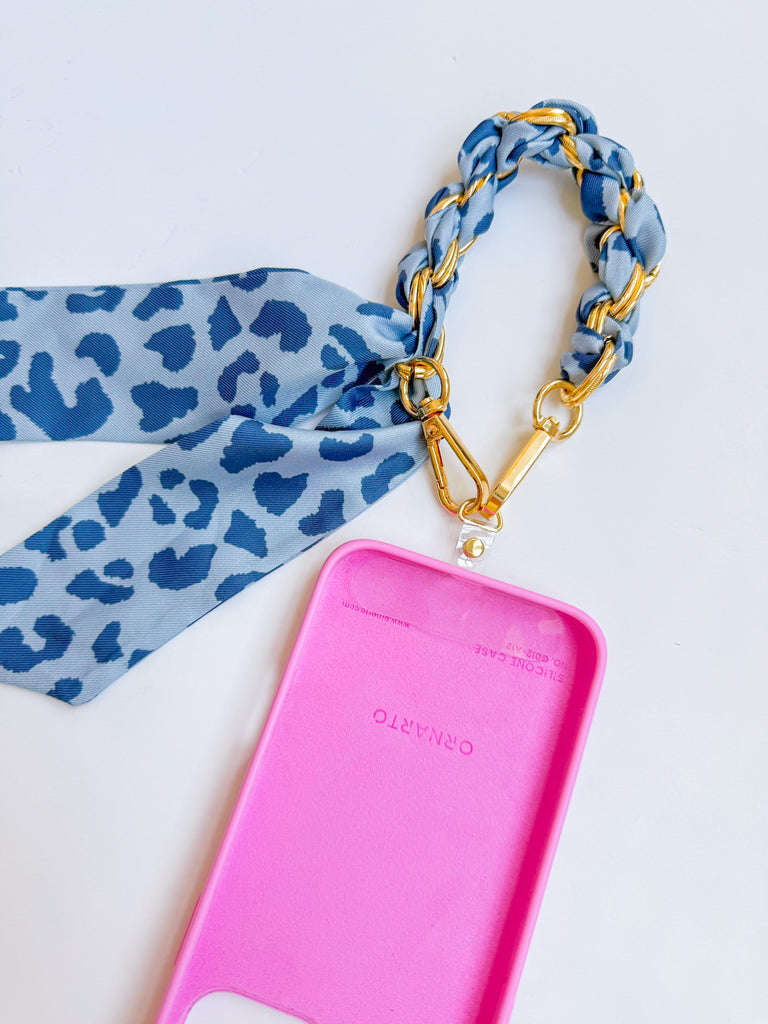 This light blue cheetah print lanyard bracelet offers a stylish way to keep your phone close. Designed as a phone chain in bracelet form, it provides convenient, hands-free carry while adding a fashionable accessory to your look. Please note, this product does not include a phone case.