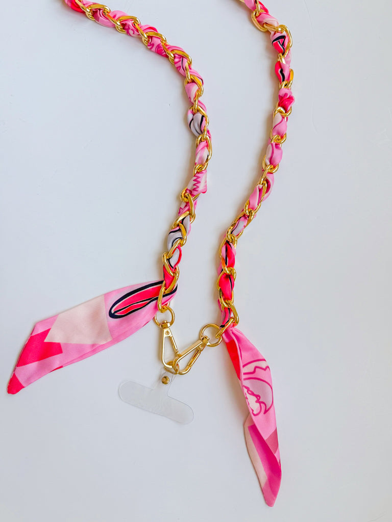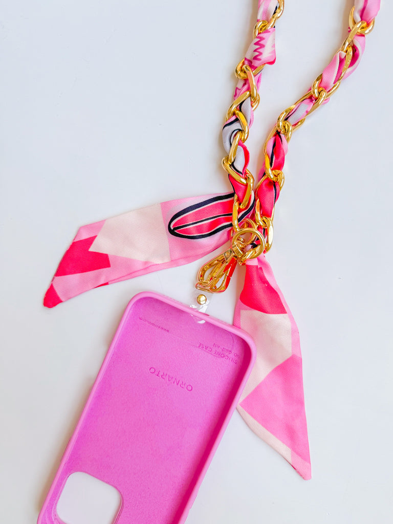 This iPhone scarf lanyard necklace in pink offers a stylish and practical way to keep your phone close at hand while on the go. Designed as a comfortable, wearable accessory, it allows quick access without the need to carry a traditional case. Please note, the phone chain necklace is sold separately from the phone case. Perfect for hands-free convenience with a touch of elegance.