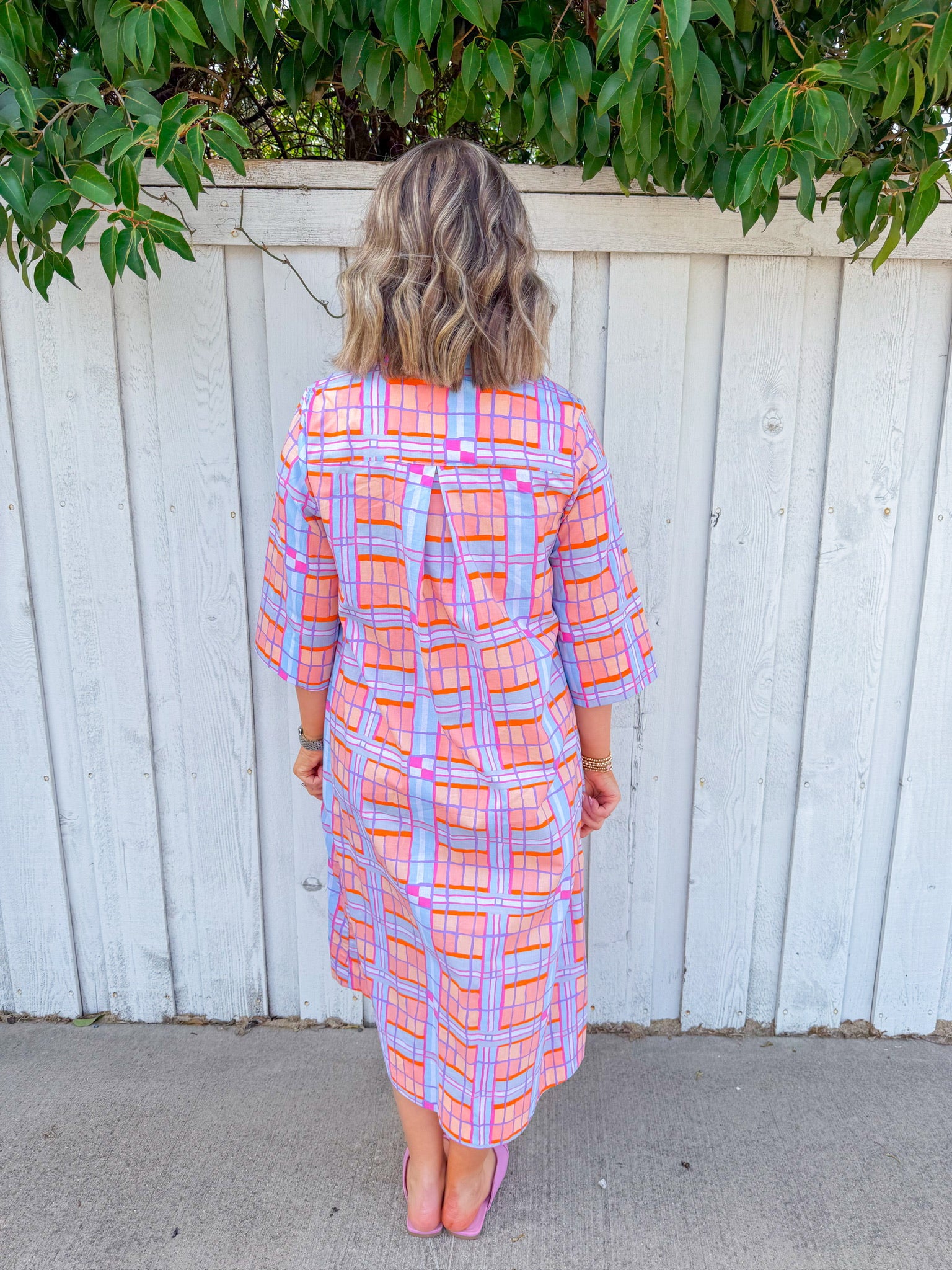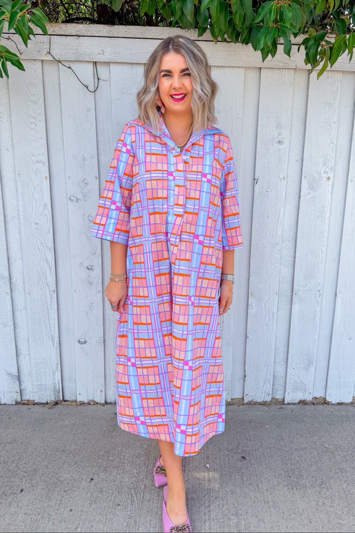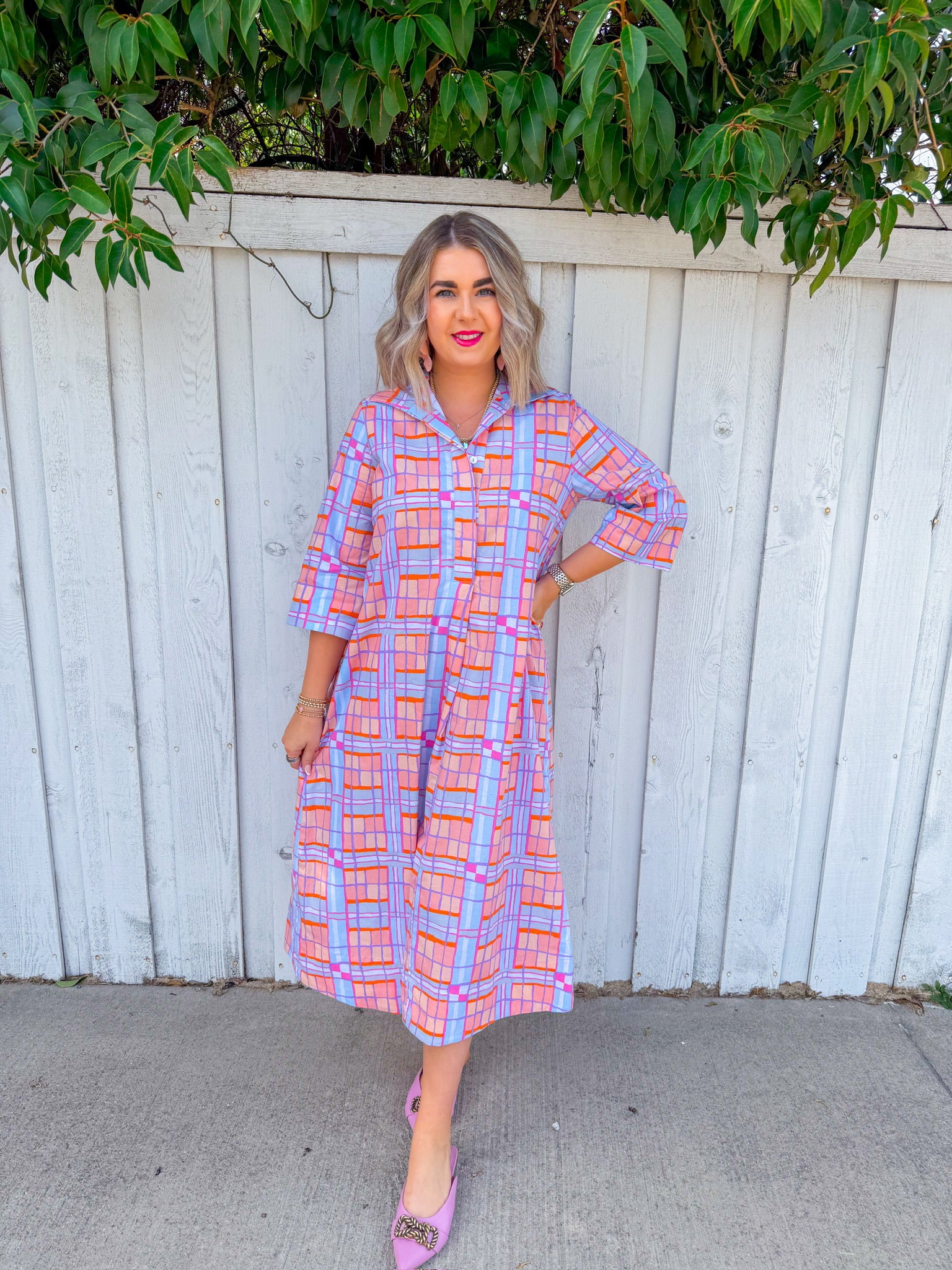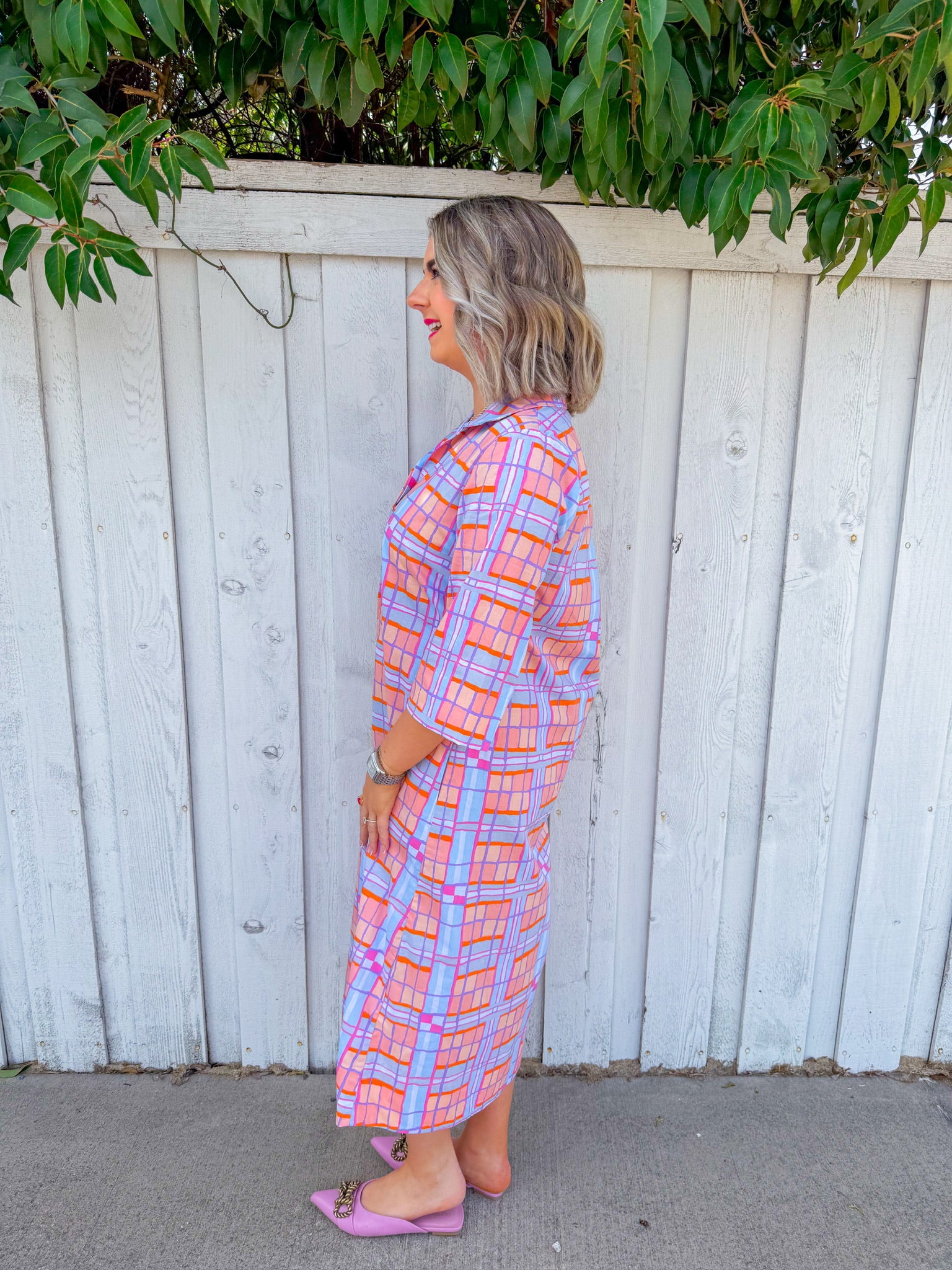Twirl into spring in this charming plaid midi dress featuring a peach and blue color palette that's equal parts sophisticated and fun.