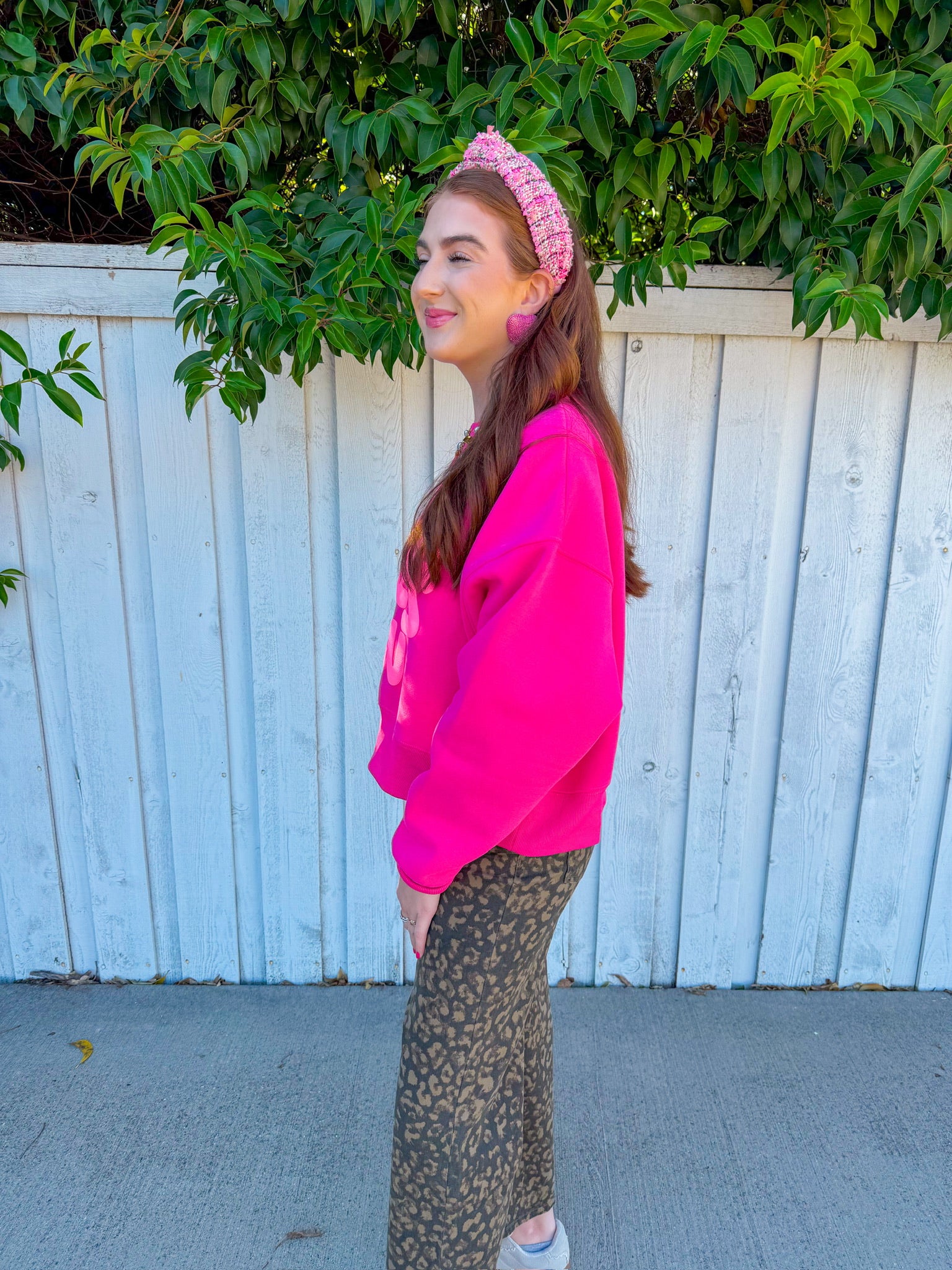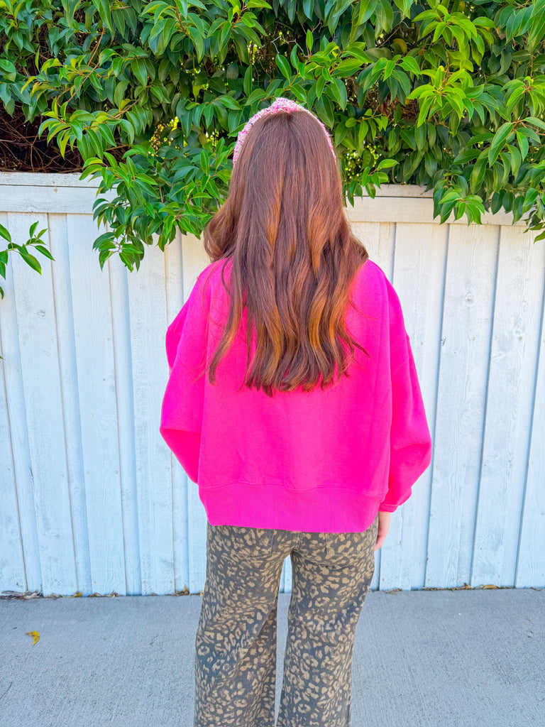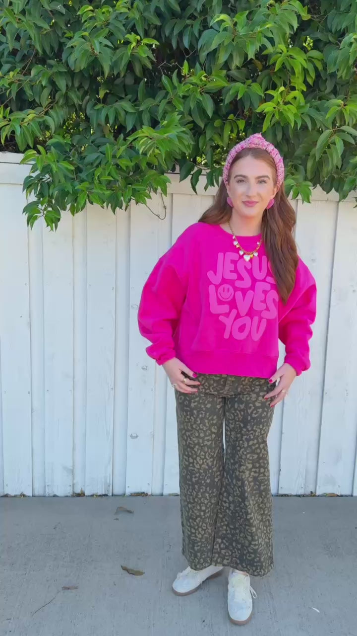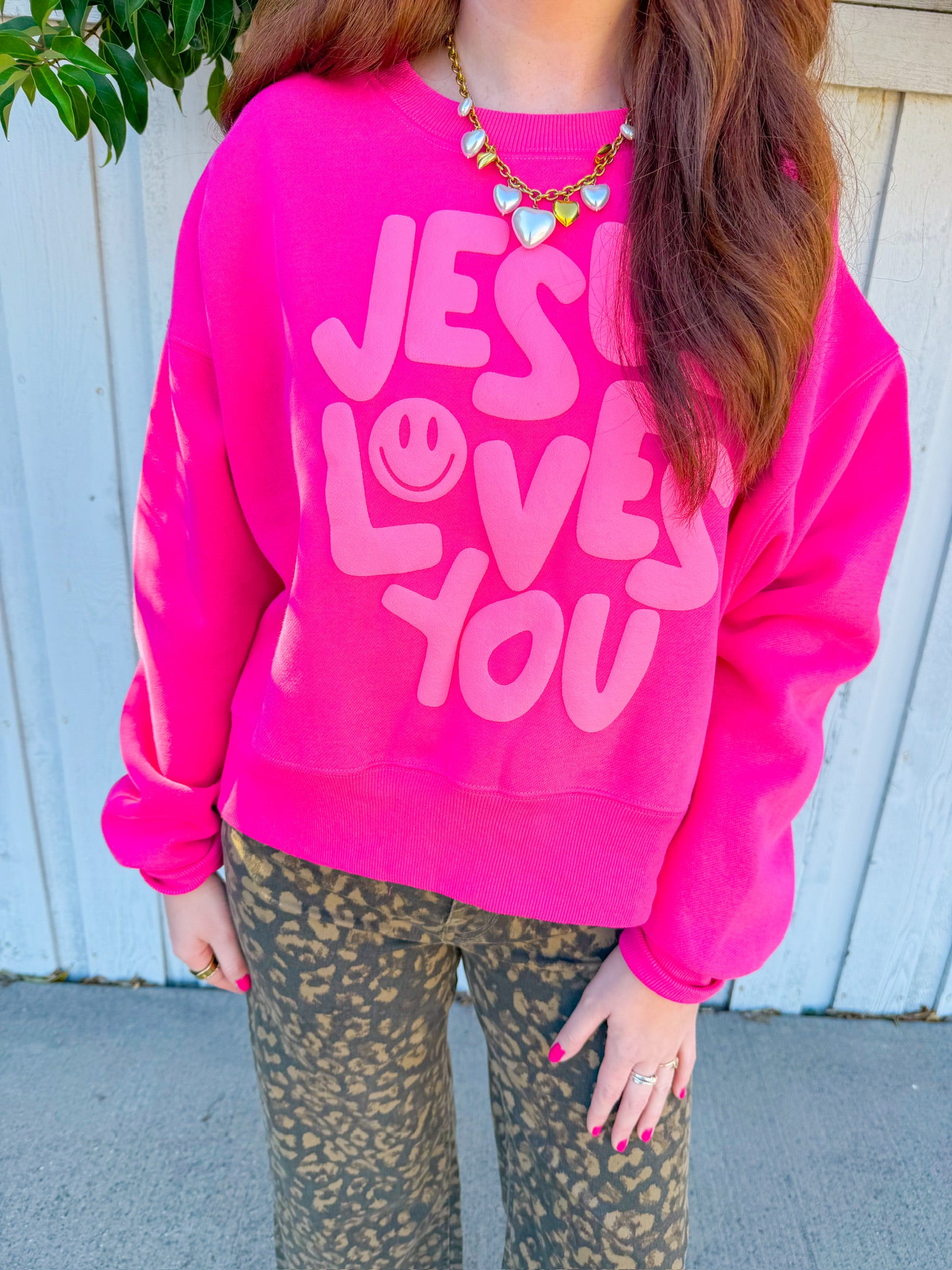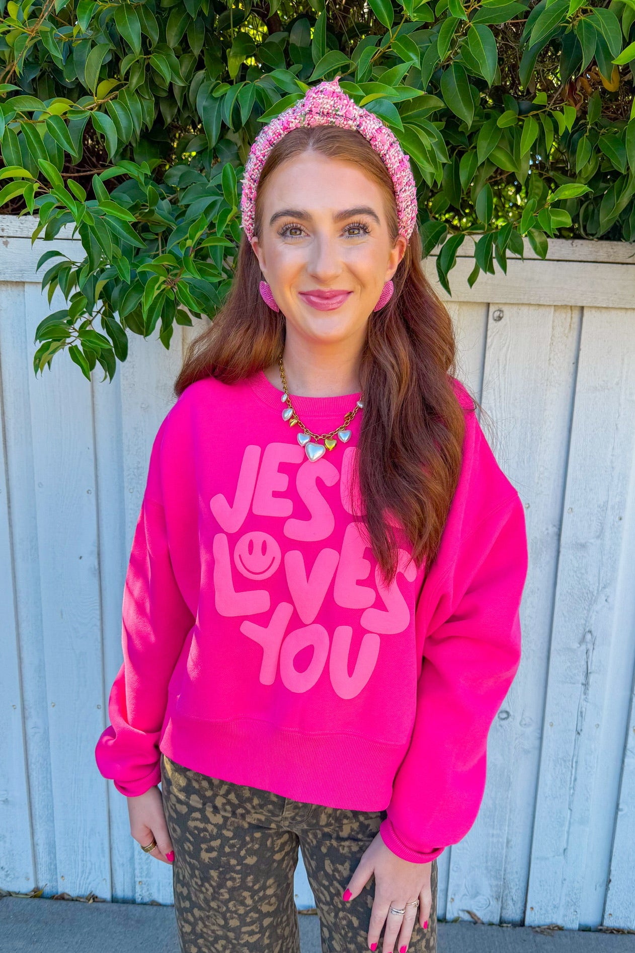 Rock your faith in style with this hot pink sweatshirt that's as bold as your beliefs. Snuggle into the plush fur interior while the front flaunts monochrome puff letters declaring "Jesus Loves You"—a cheerful affirmation wrapped around you.