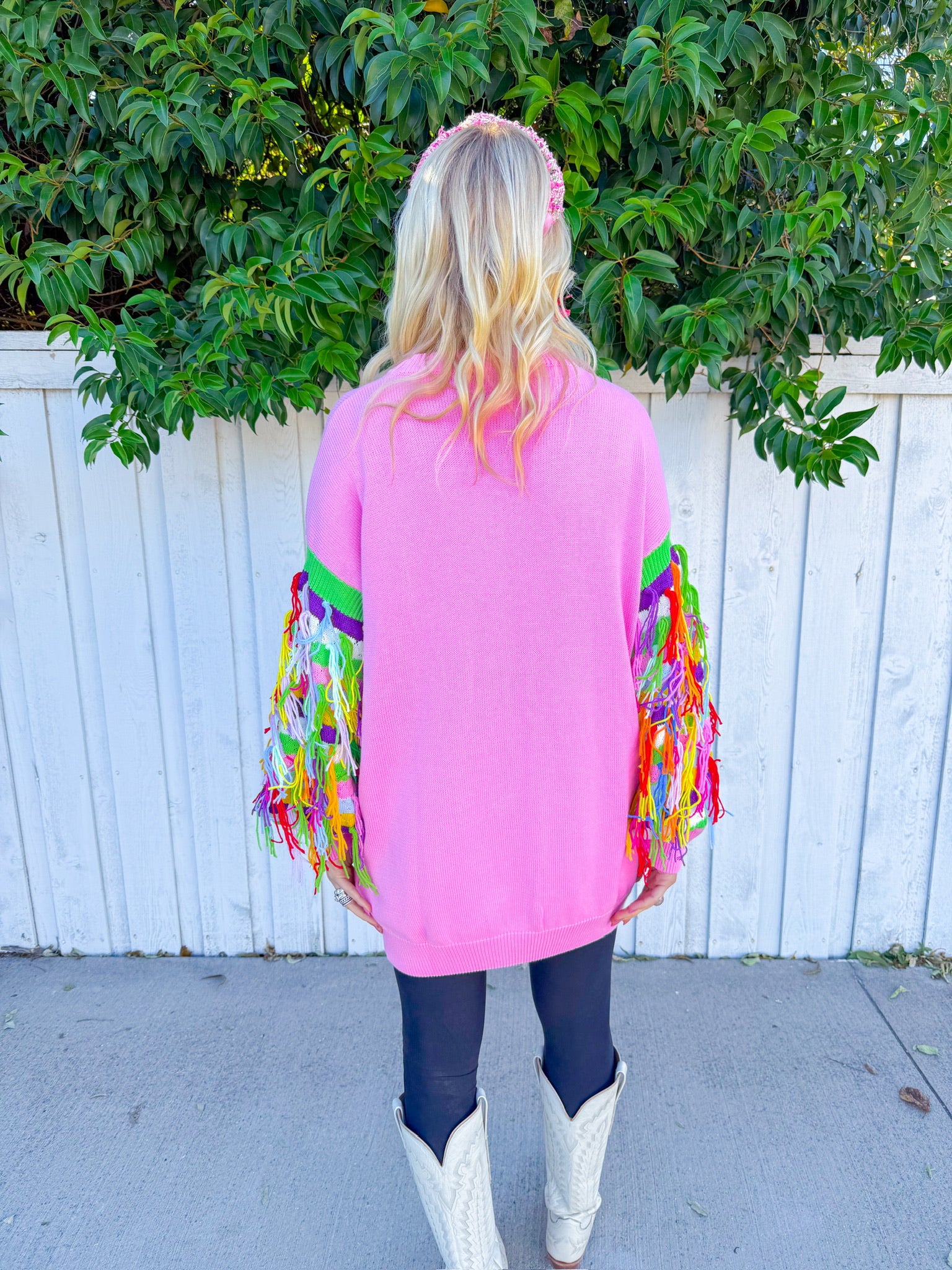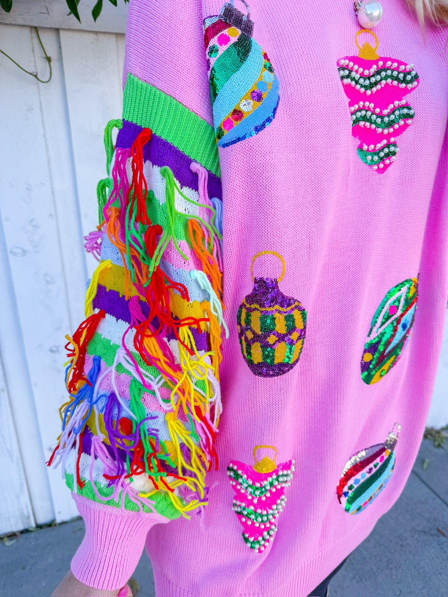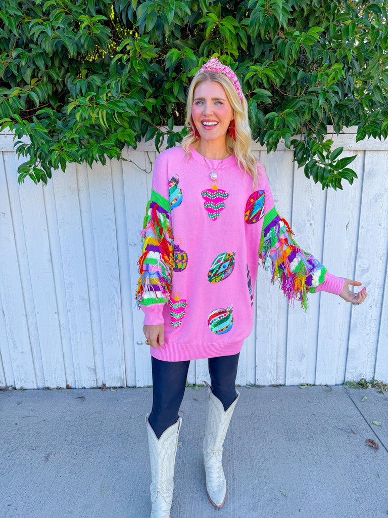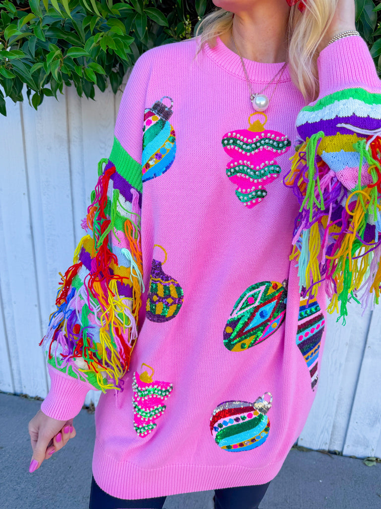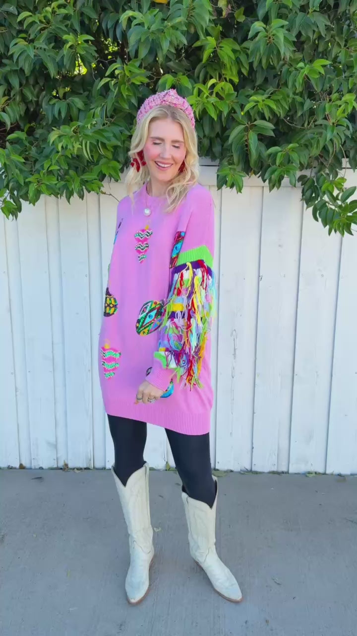 Twirl into the spotlight in this light pink mini dress that's basically a wearable celebration! Featuring multi-color fringe sleeves that swing with every move and sequin ornaments scattered across the fabric, this Queen of Sparkles stunner delivers maximum glam with zero apologies.