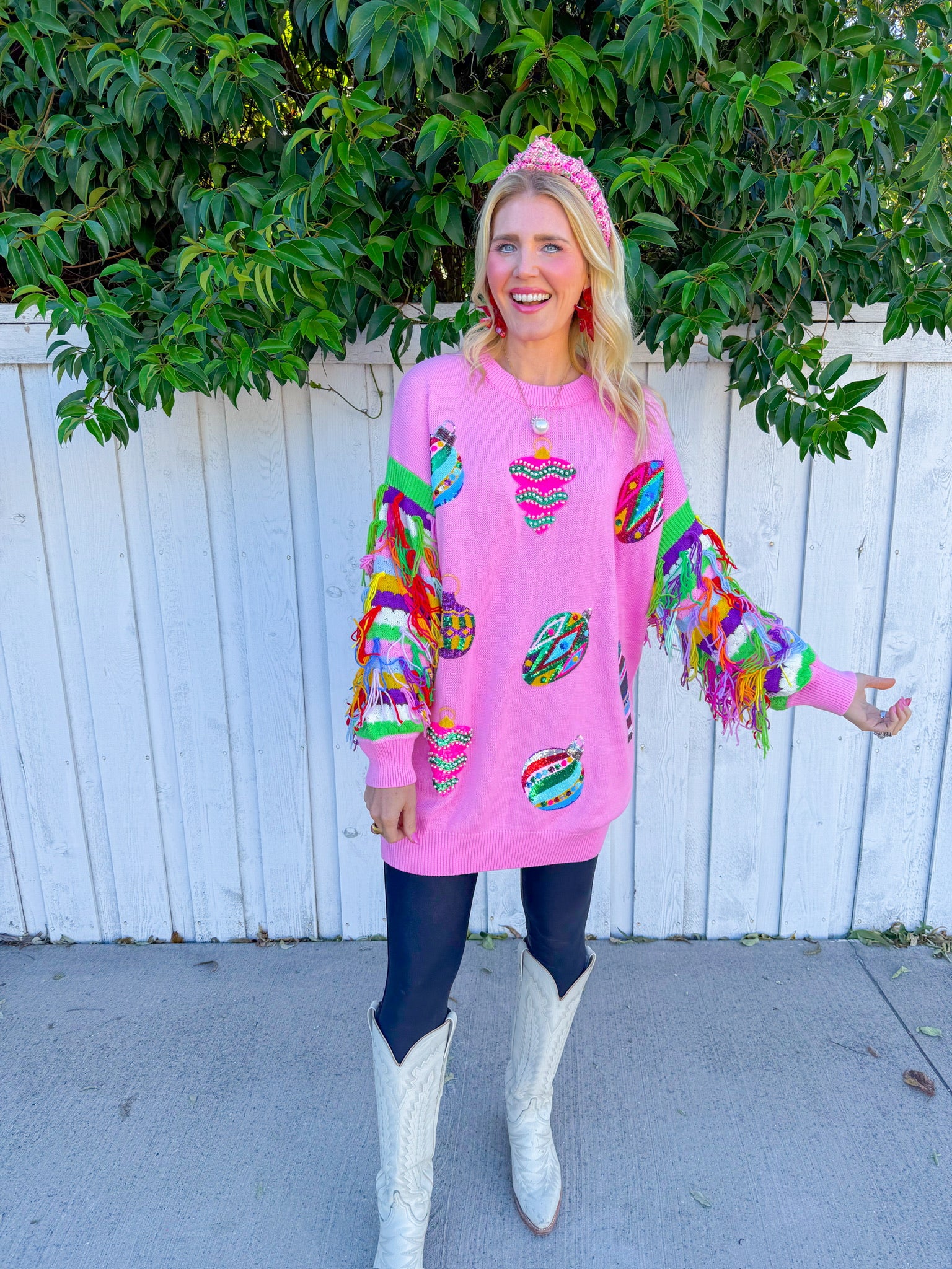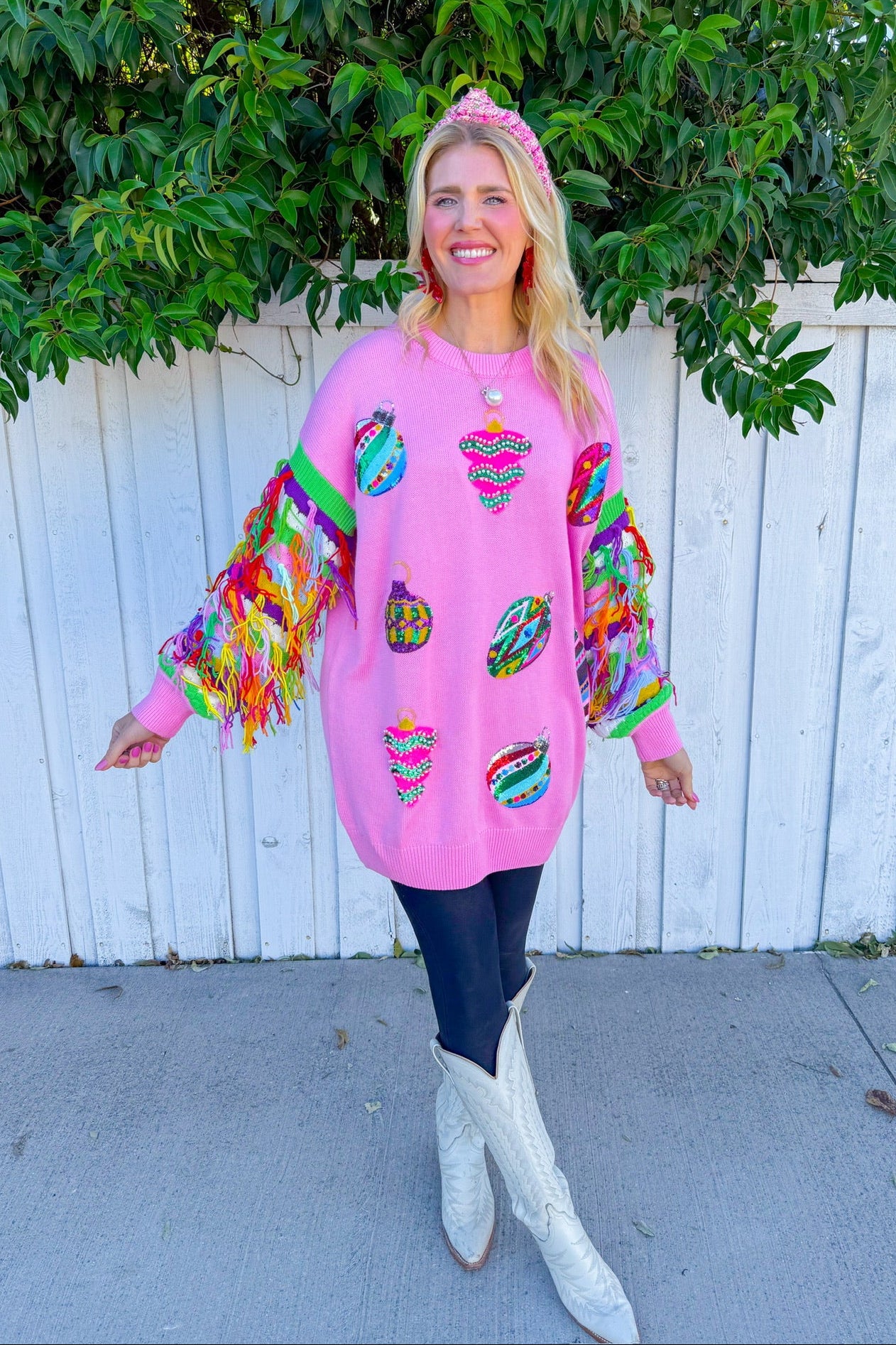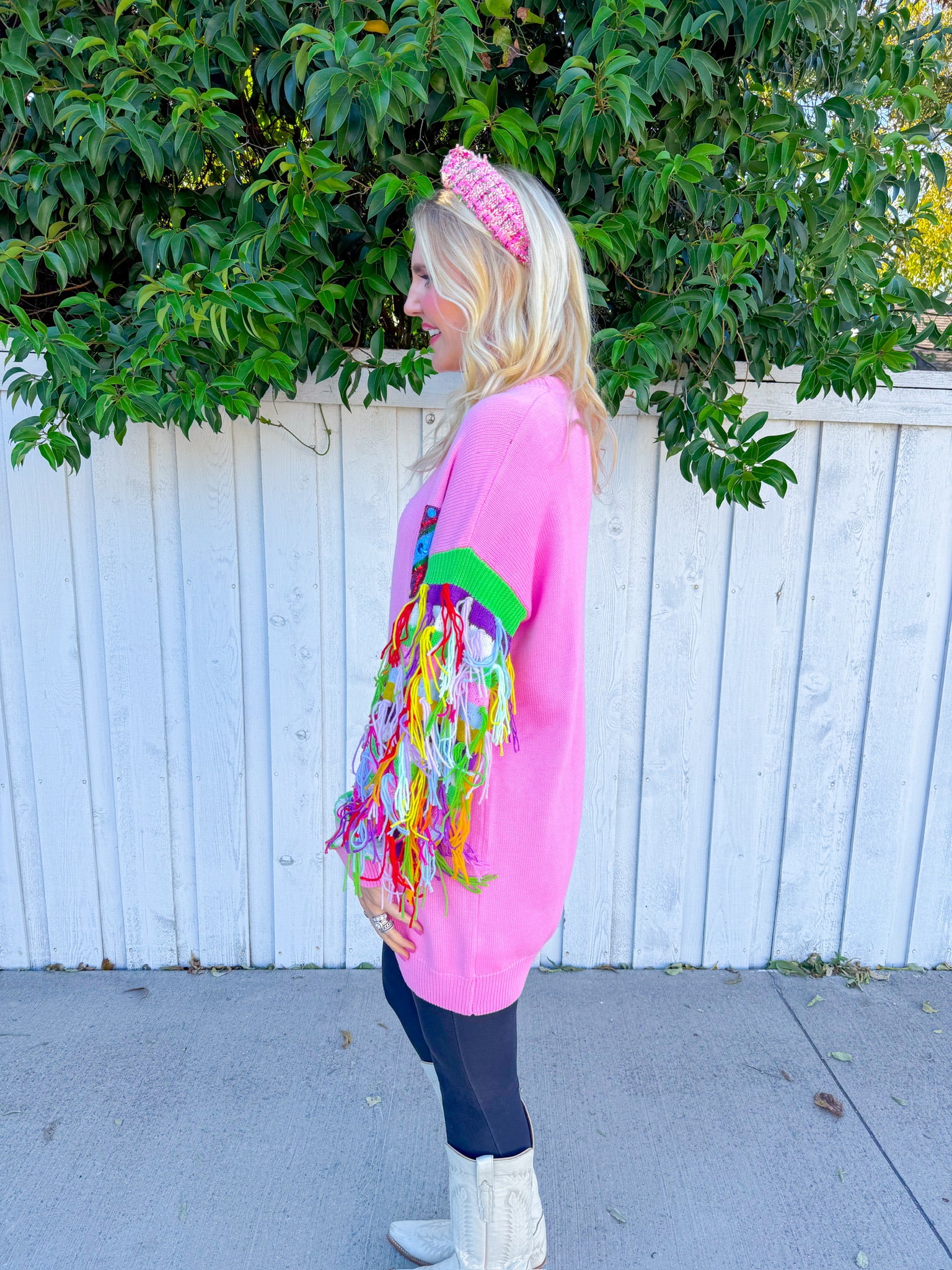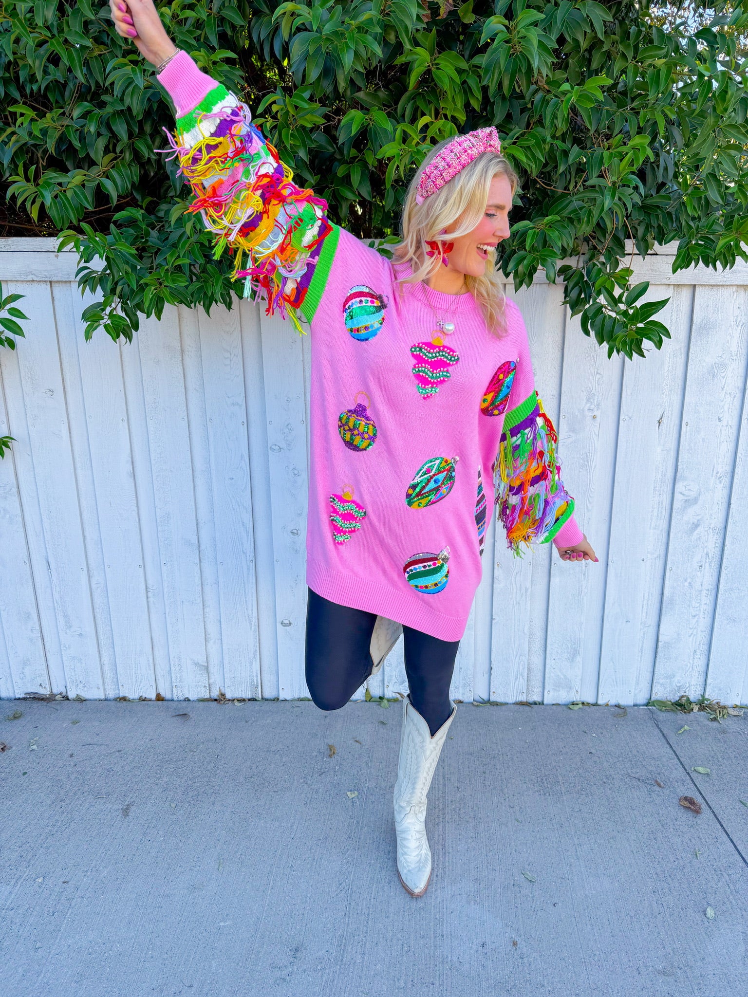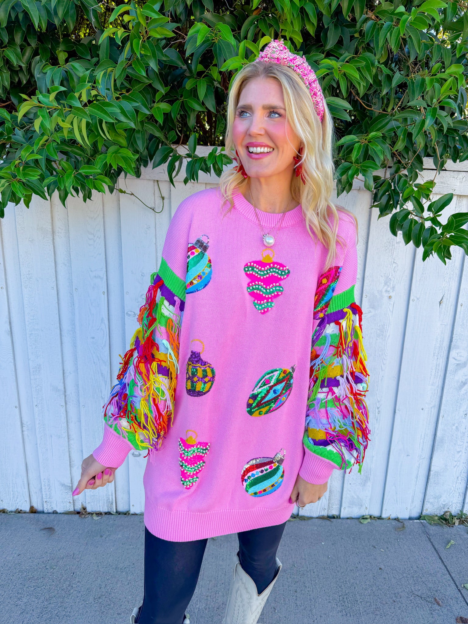 Twirl into the spotlight in this light pink mini dress that's basically a wearable celebration! Featuring multi-color fringe sleeves that swing with every move and sequin ornaments scattered across the fabric, this Queen of Sparkles stunner delivers maximum glam with zero apologies.