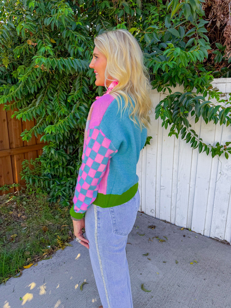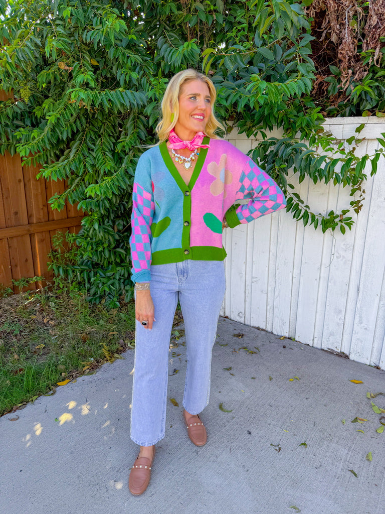 Candy-colored cropped cardigan with bold flower intarsia and checkerboard sleeves—cheery, chunky, and a total mood booster.